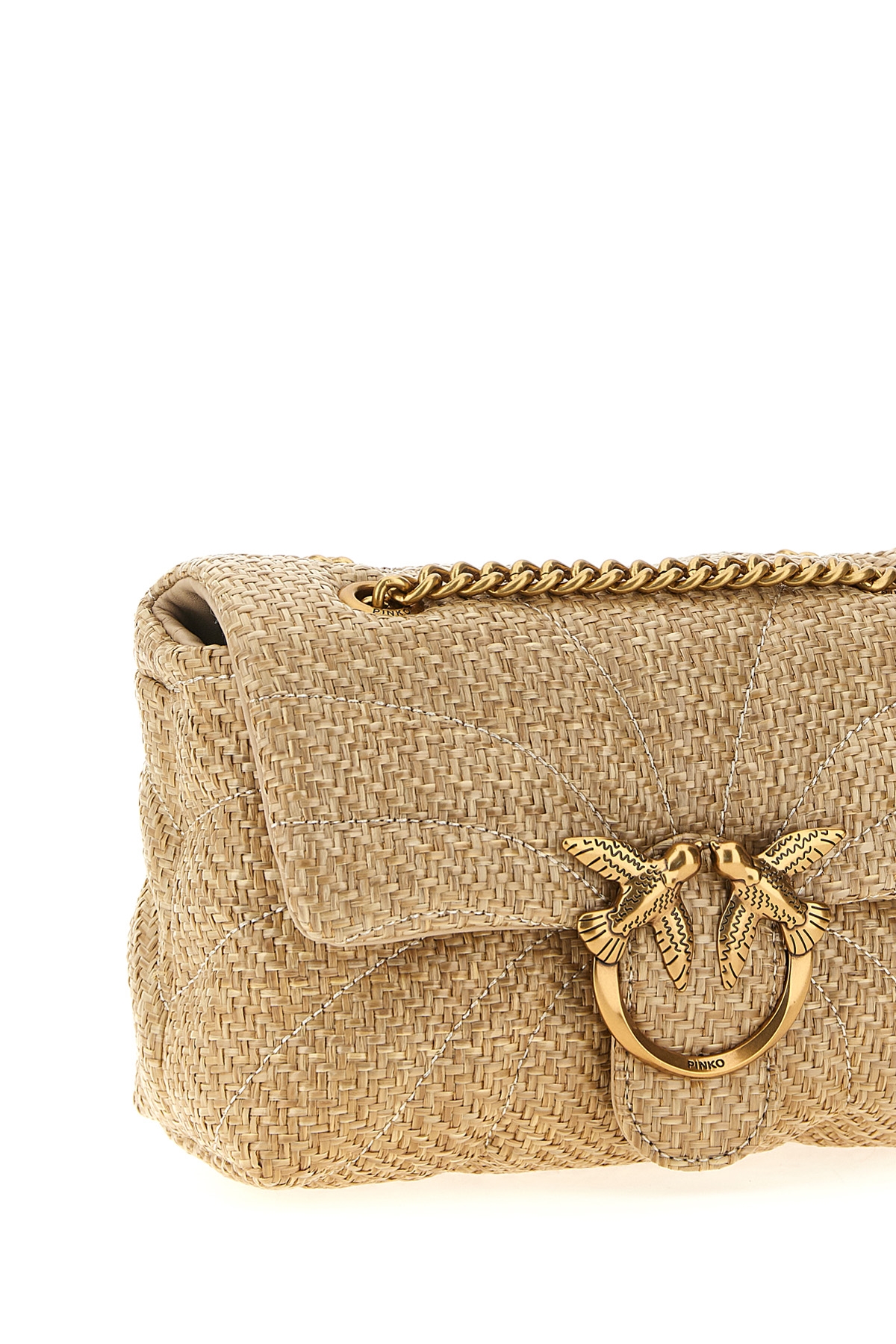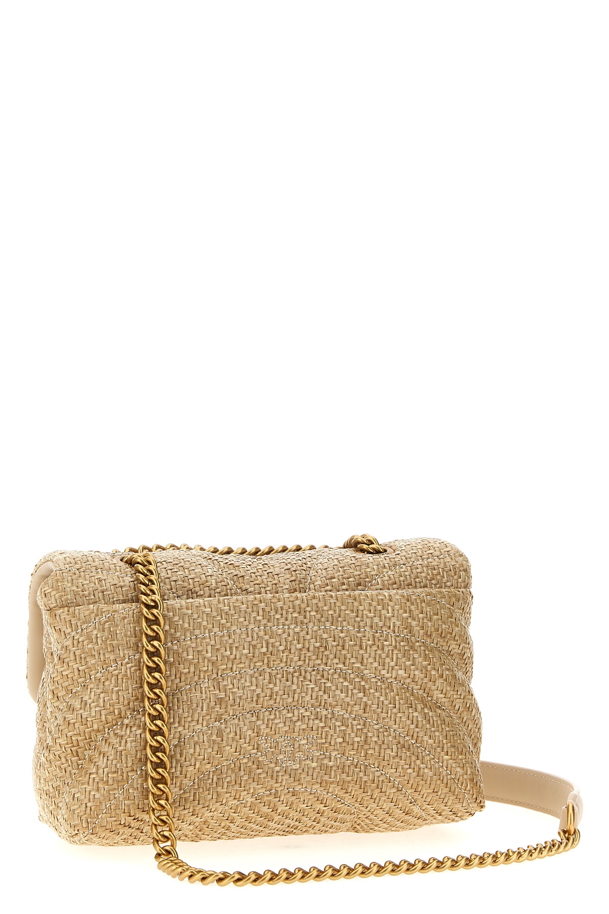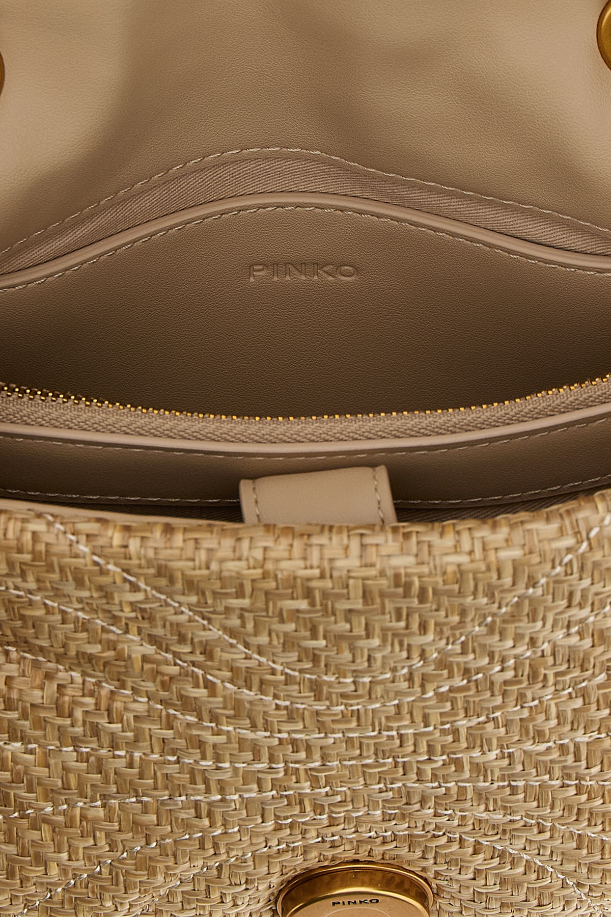 'Mini Love Bag Puff' raffia crossbody bag with butterfly quilting, interlocking flap closure with gold metal 'Love Birds Diamond Cut' buckle, back pocket, chain shoulder strap with sliding leather protection.