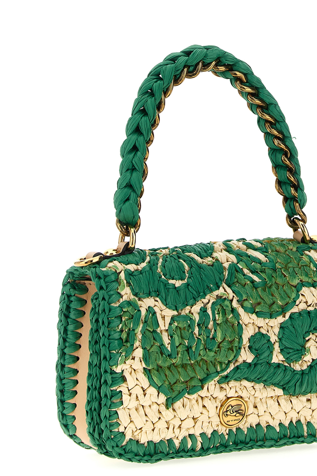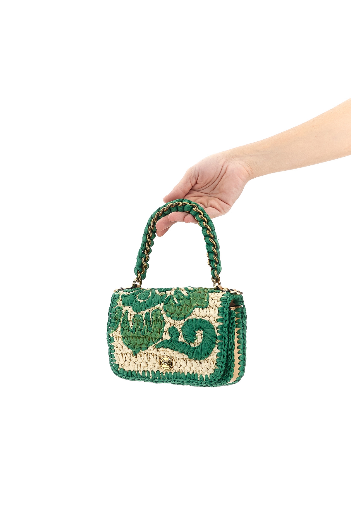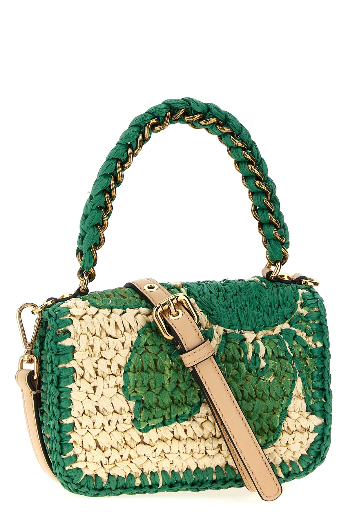 'Bond XS' woven raffia handbag with floral motif, leather and metal details, suede lining, magnetic flap closure with metal button with Pegaso logo on the front, fixed raffia and chain handle, adjustable and removable leather shoulder strap.