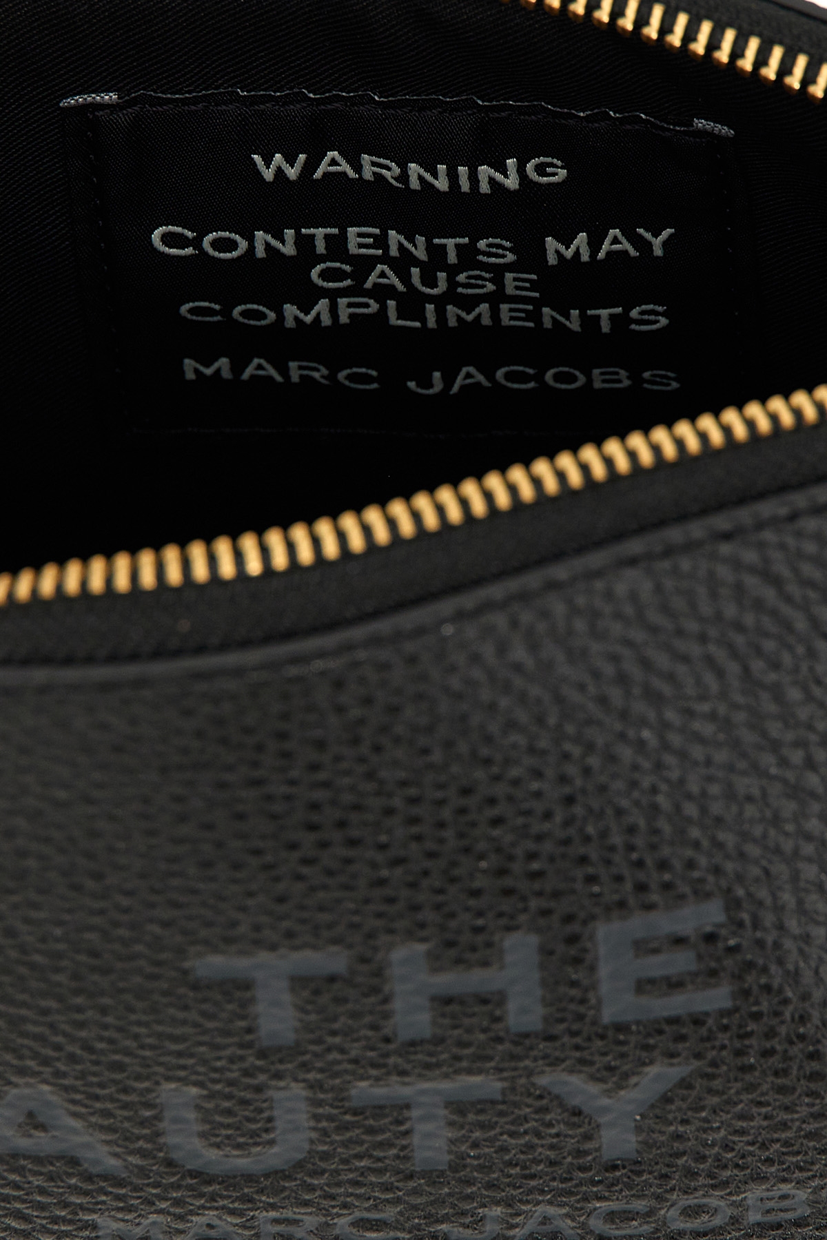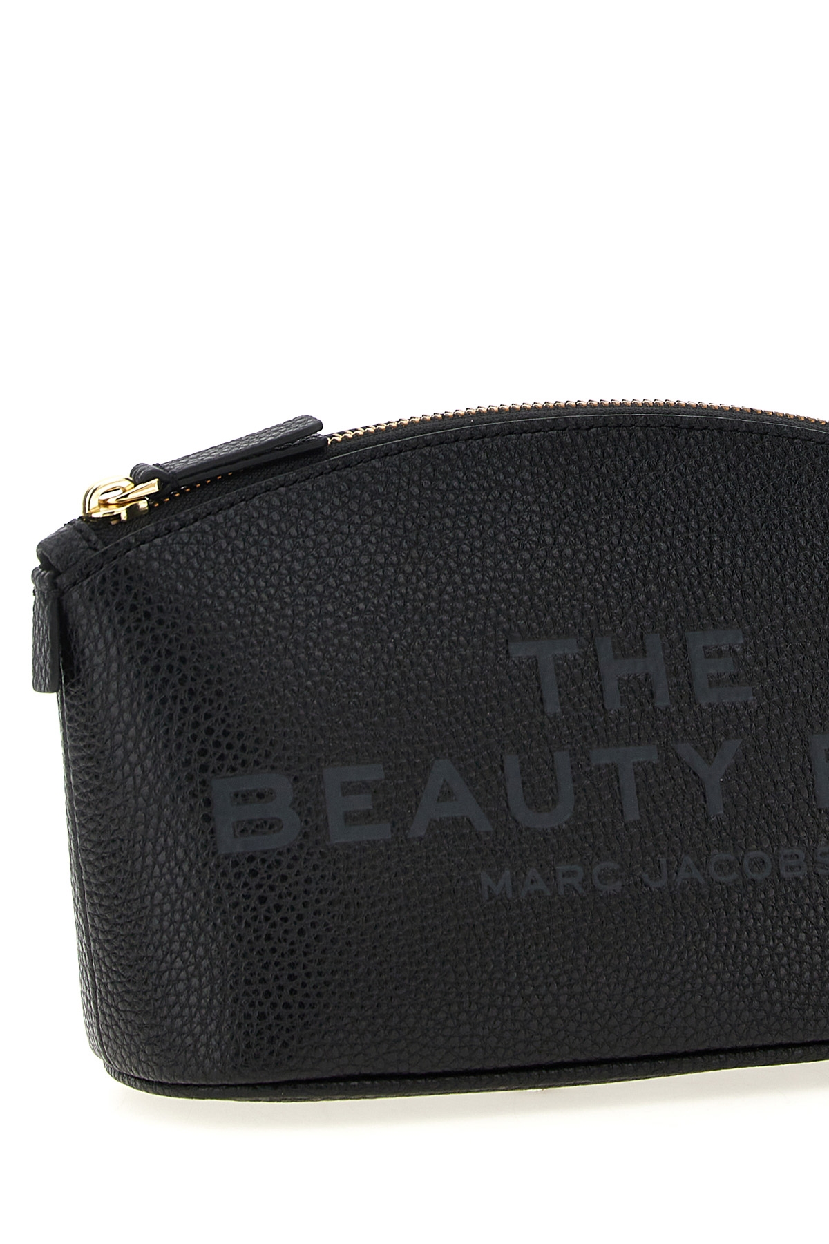 'The Beauty Bag' garnet leather beauty bag with front embossed logo, top zip closure, twill lining, removable wrist strap.