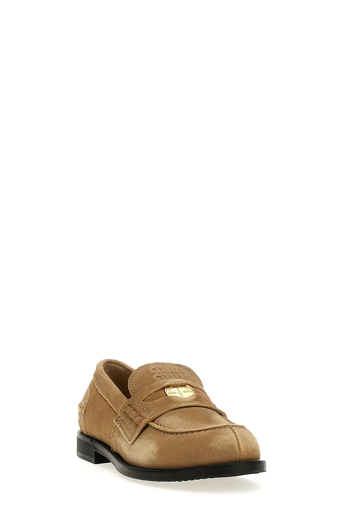 Suede loafers with embossed front logo, logo metal coin, rubber sole.
