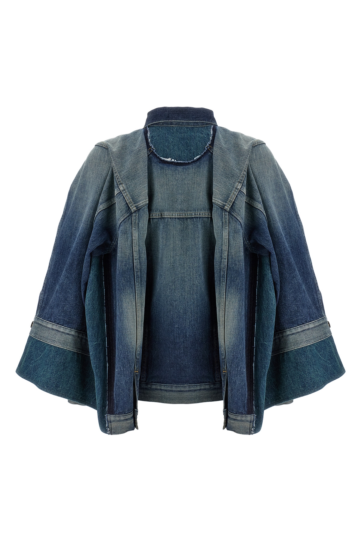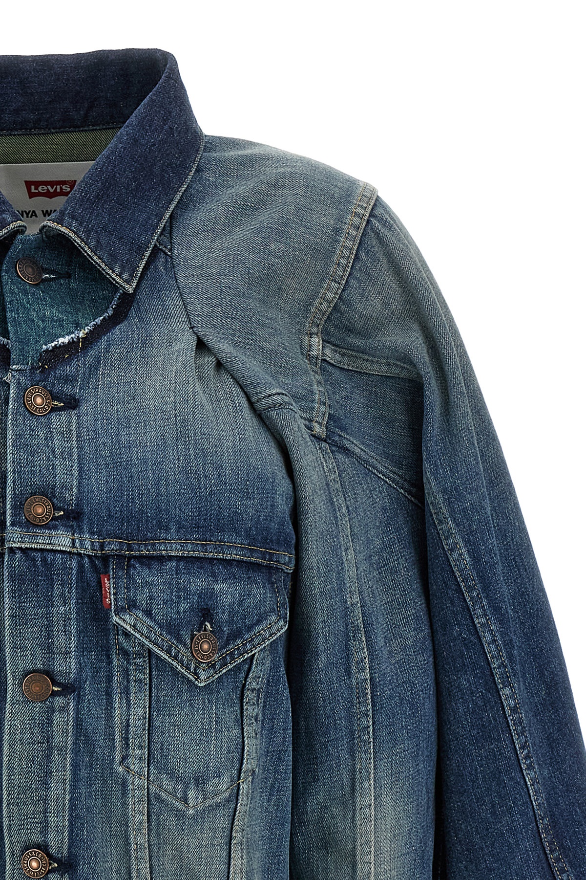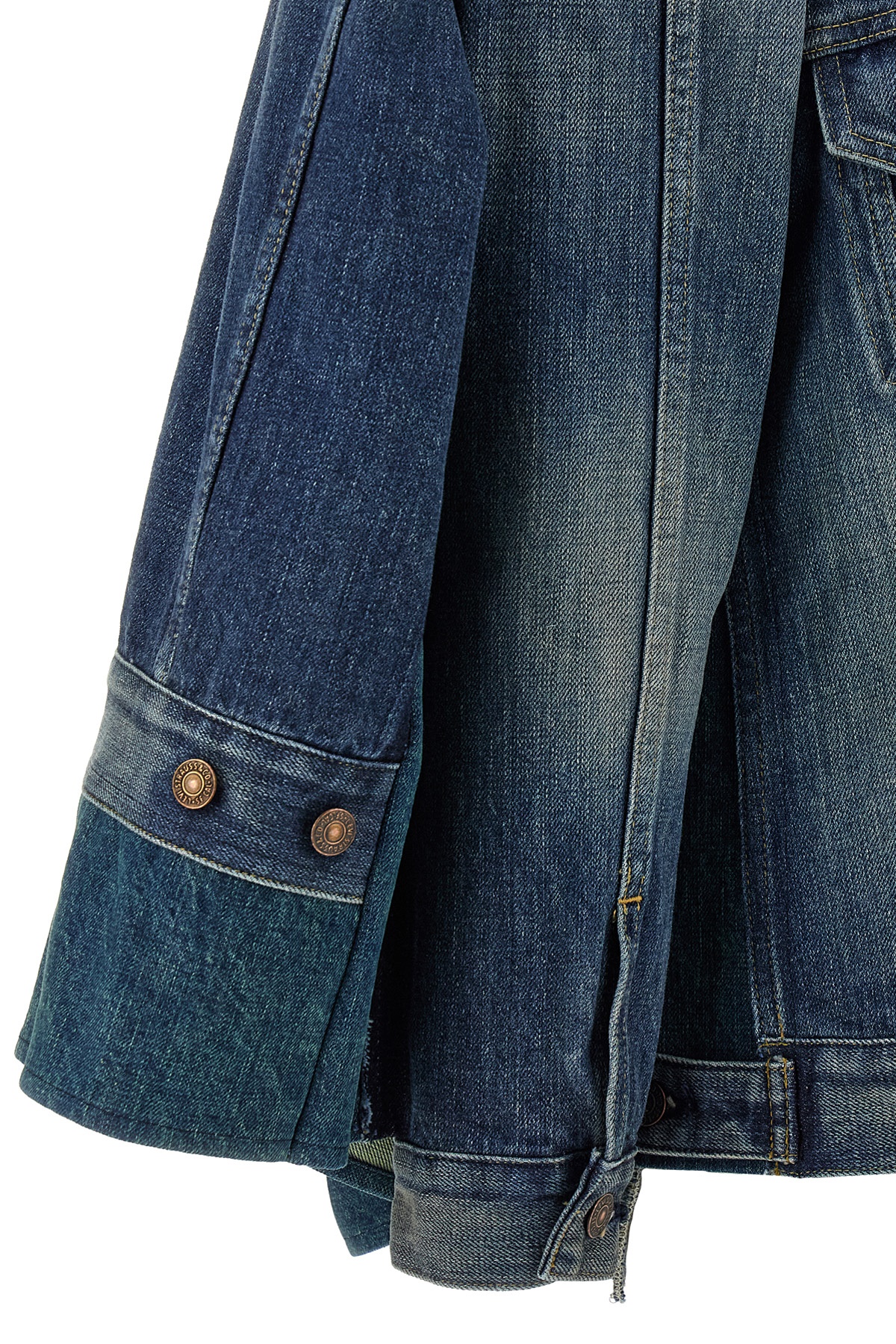 Junya Watanabe x Levi's® stonewashed cotton denim jacket with patchwork details, front button closure, pockets, cut-out detail under the armpit, long cuffed sleeves, and asymmetric hem.