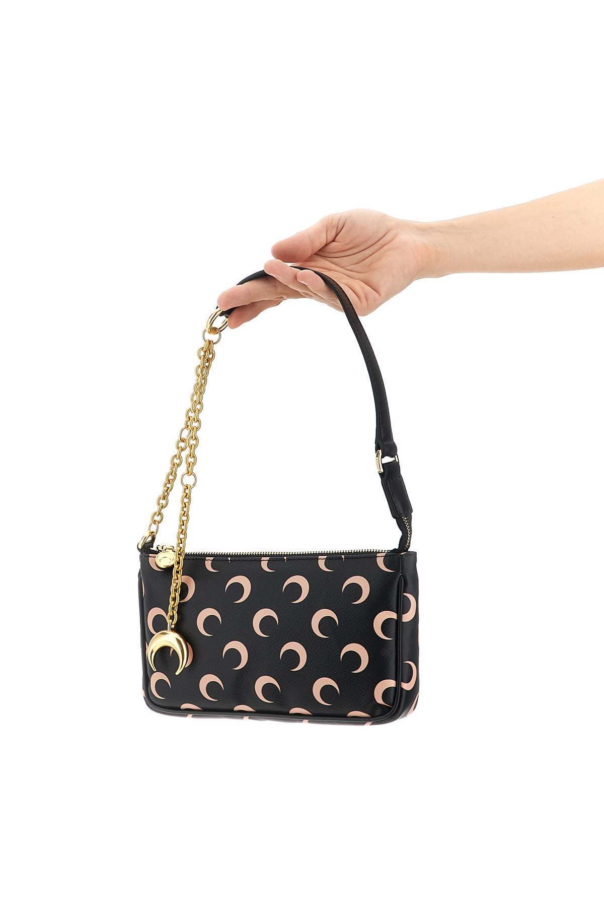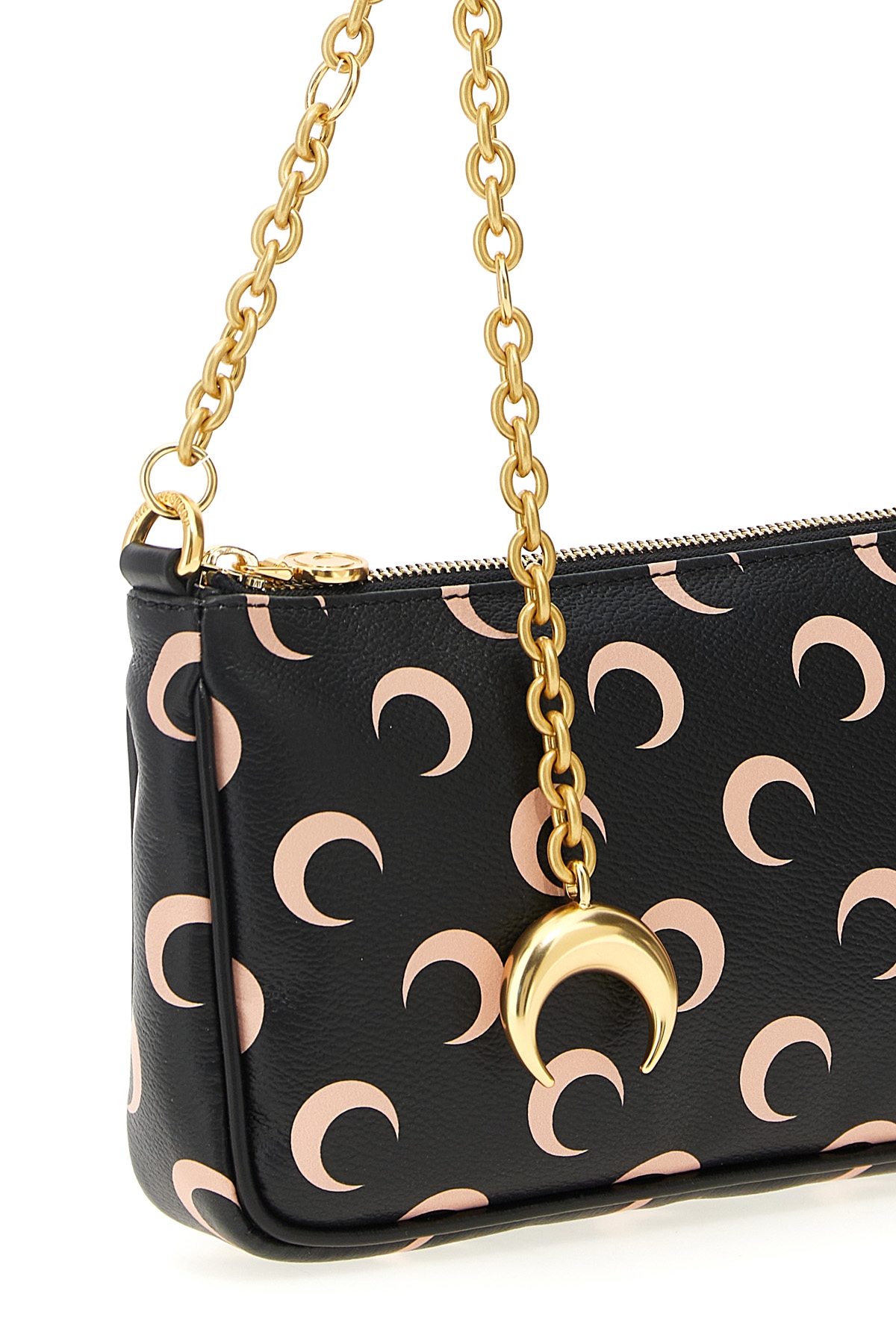 'Moon Canvas Core' handbag in leather-effect Moon print fabric, fixed leather handle and chain with Moon charm, top zip closure, metal details.