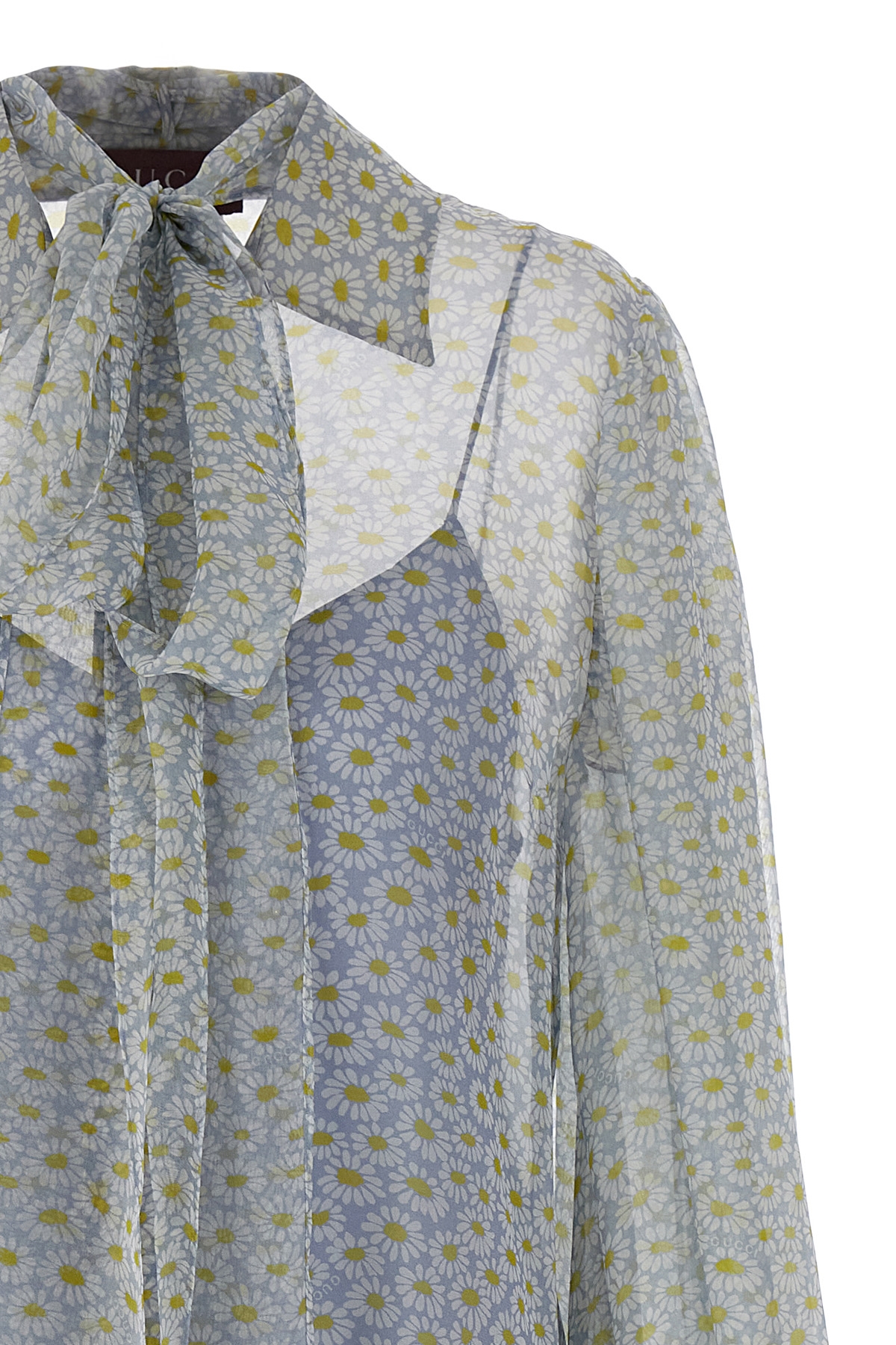 Silk chiffon shirt, with all-over print, semi-transparent with removable top, pointed collar and bow tied at the neck, long sleeves with cuffs.