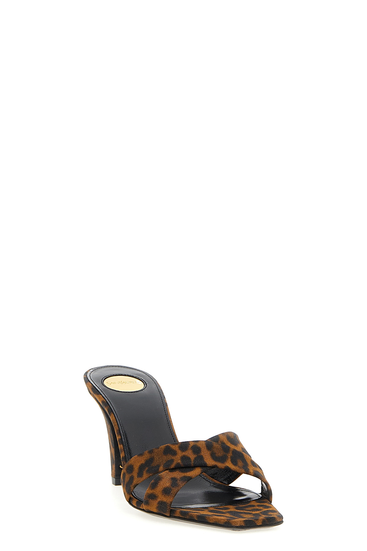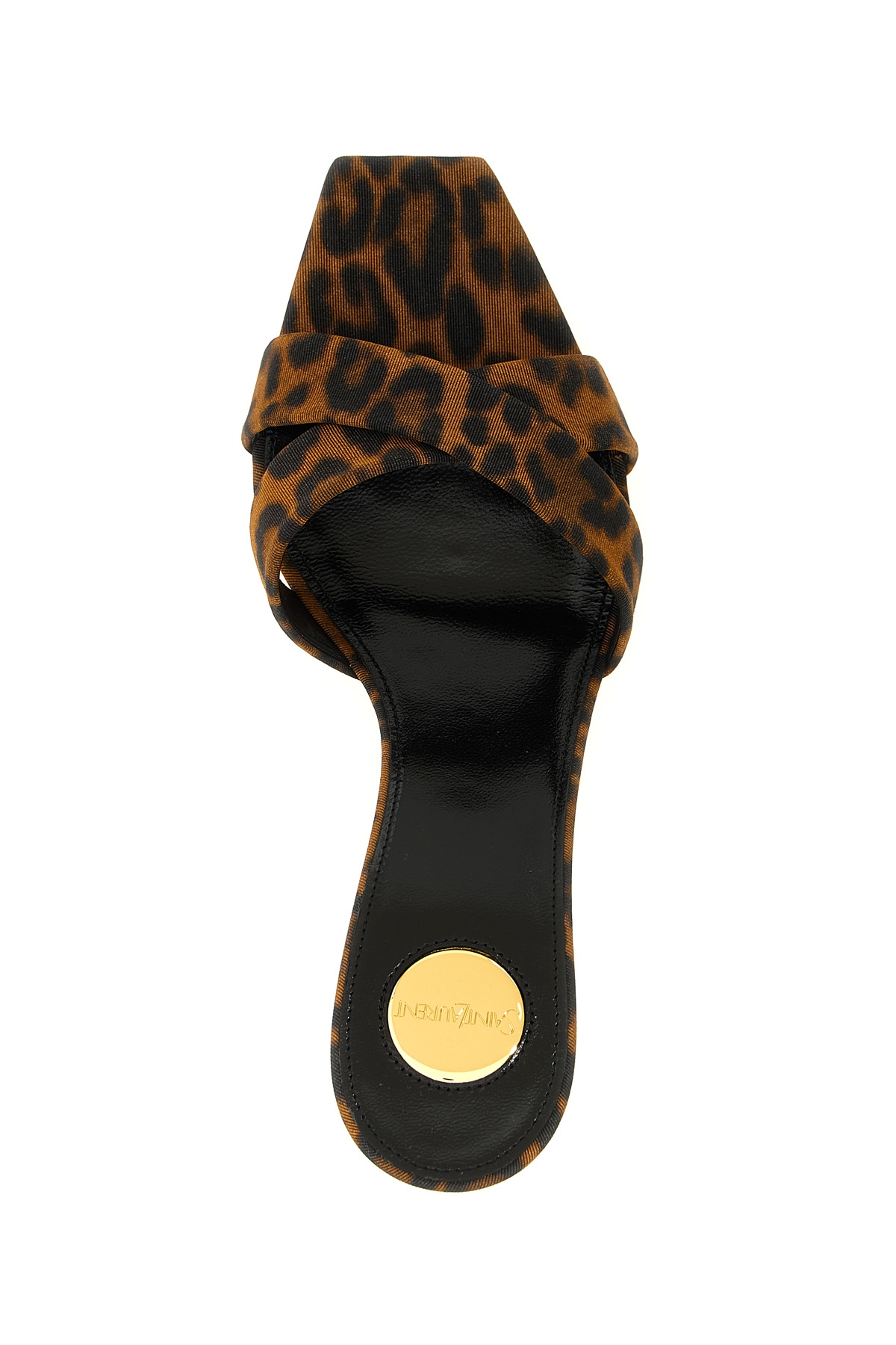 'Jill' mules in leopard-print grosgrain fabric with square toe, chunky heel with metal Cassandre logo applique, leather sole.