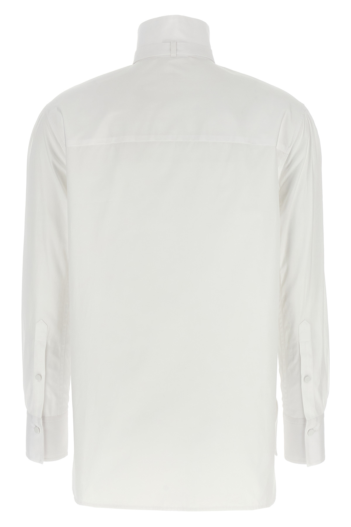 Tuxedo cotton poplin shirt with pleated plastron, collar with adjustable strap, contrast reverse Skull embroidery and front button closure, side slits, long cuffed sleeves.