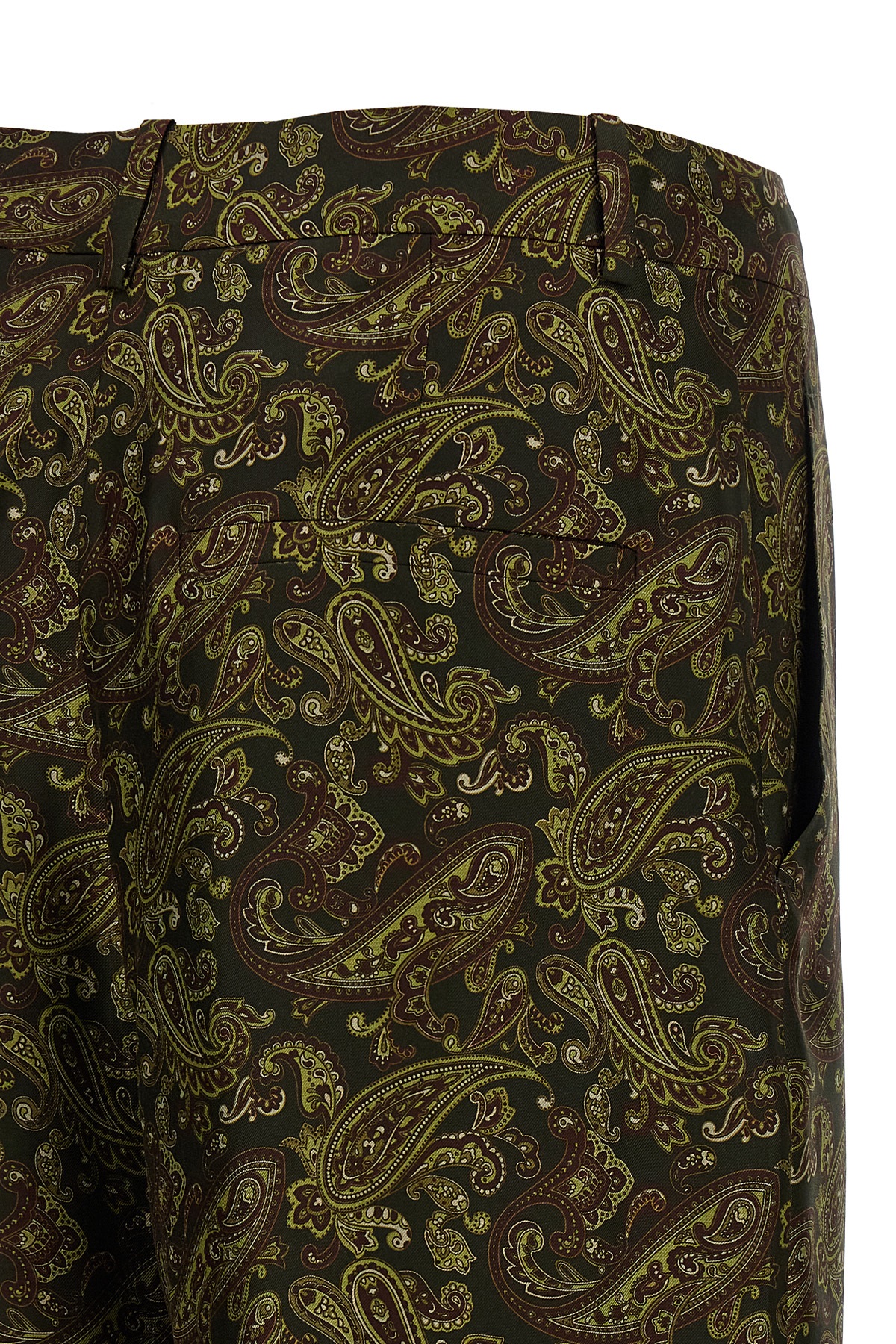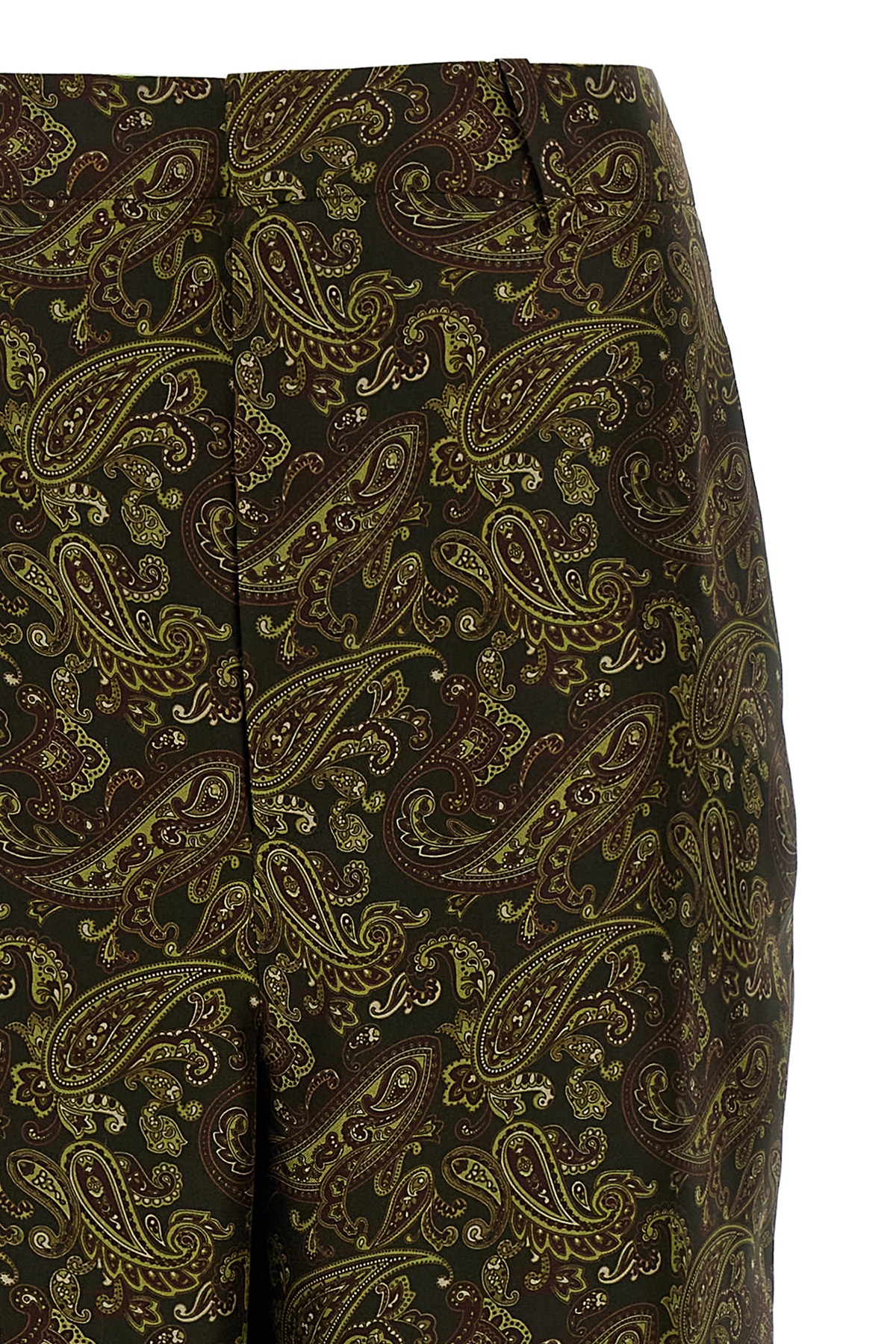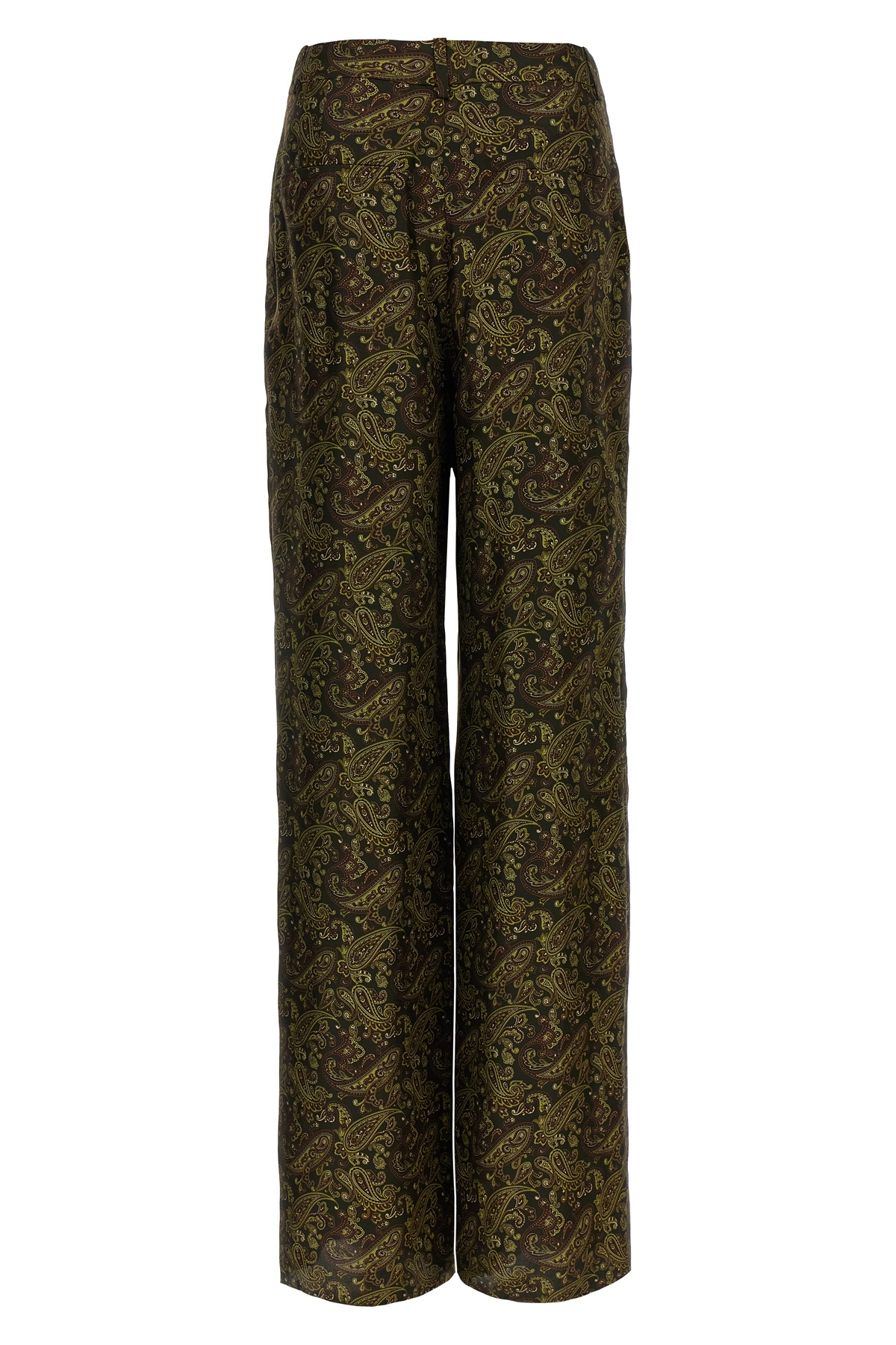 Paisley print silk twill pants with medium waist and wide leg, zip hook and front button closure, pockets.