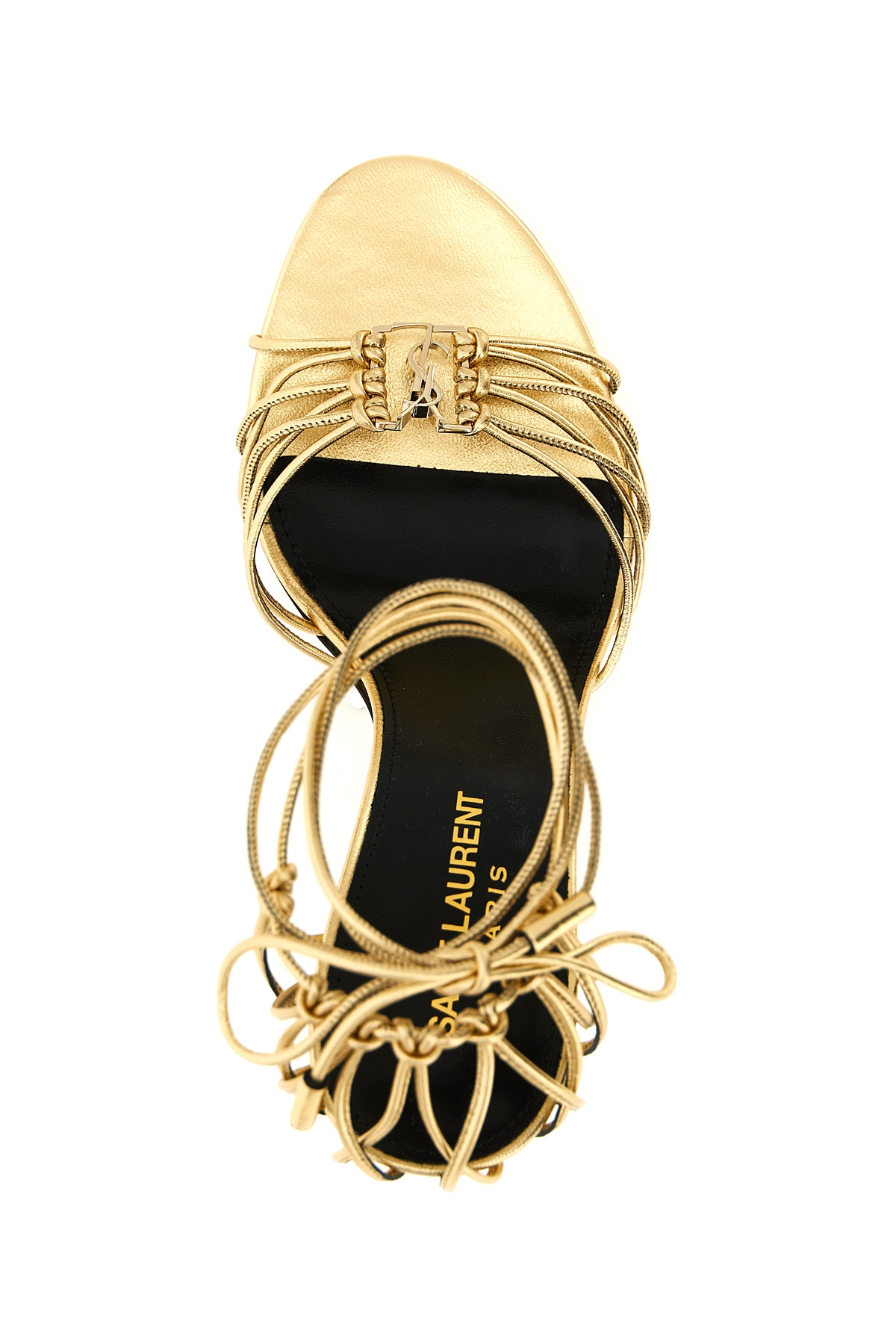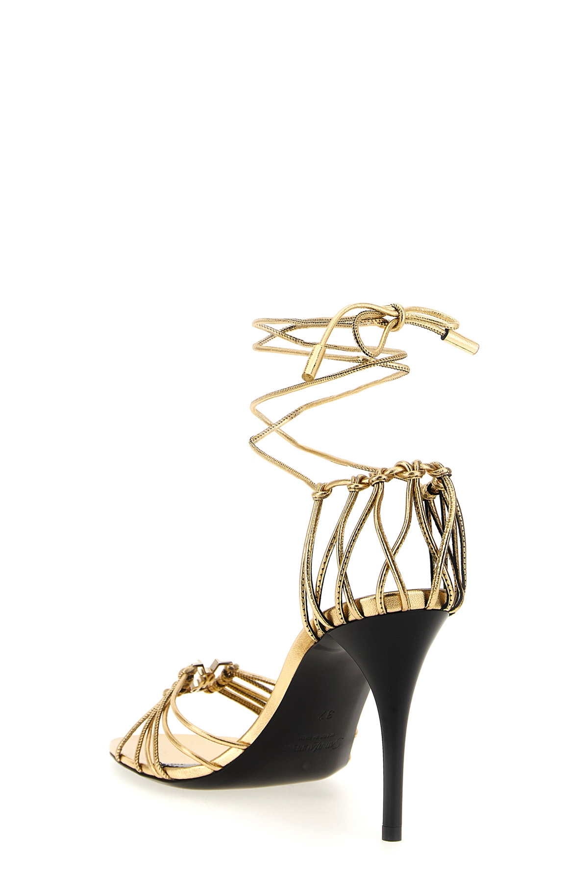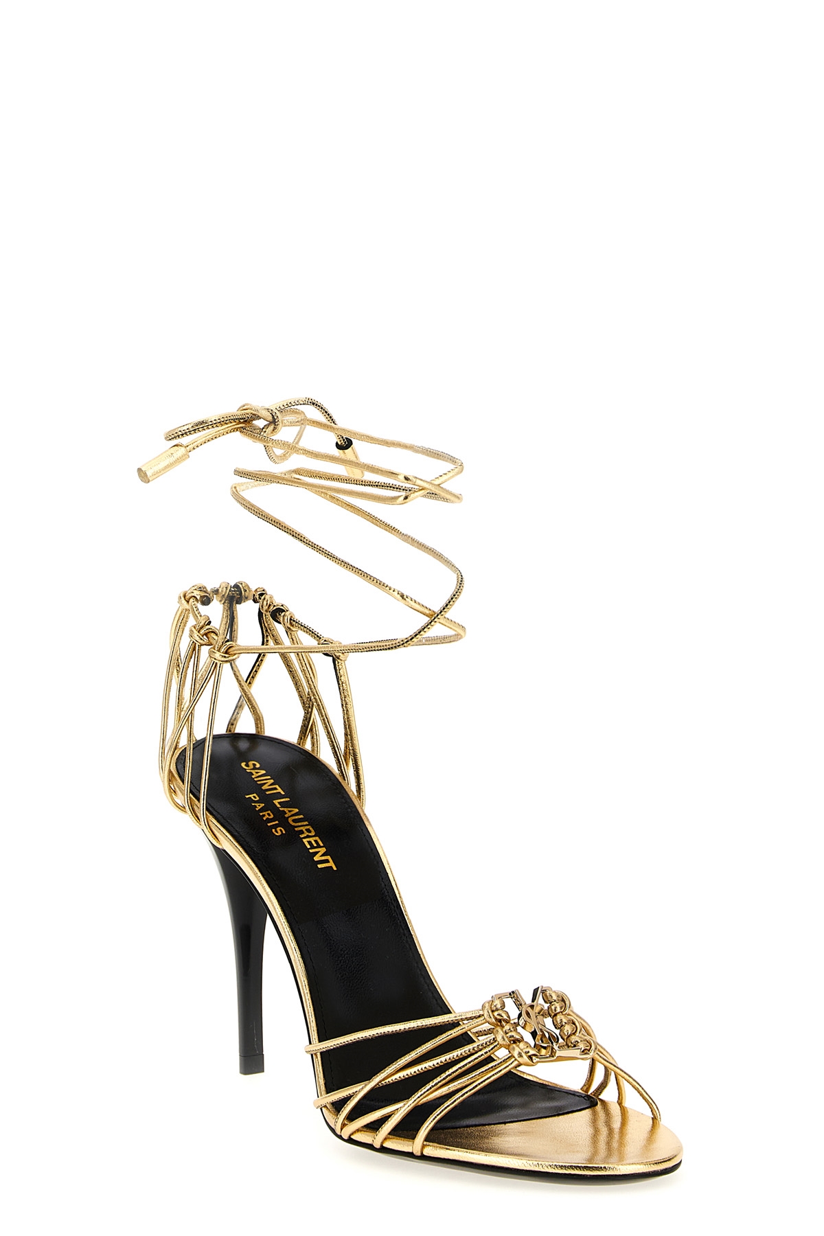 'Babylone' metallic leather sandals with antiqued effect metal Cassandre logo on the front, almond toe, ankle strap, stiletto heel, leather sole.