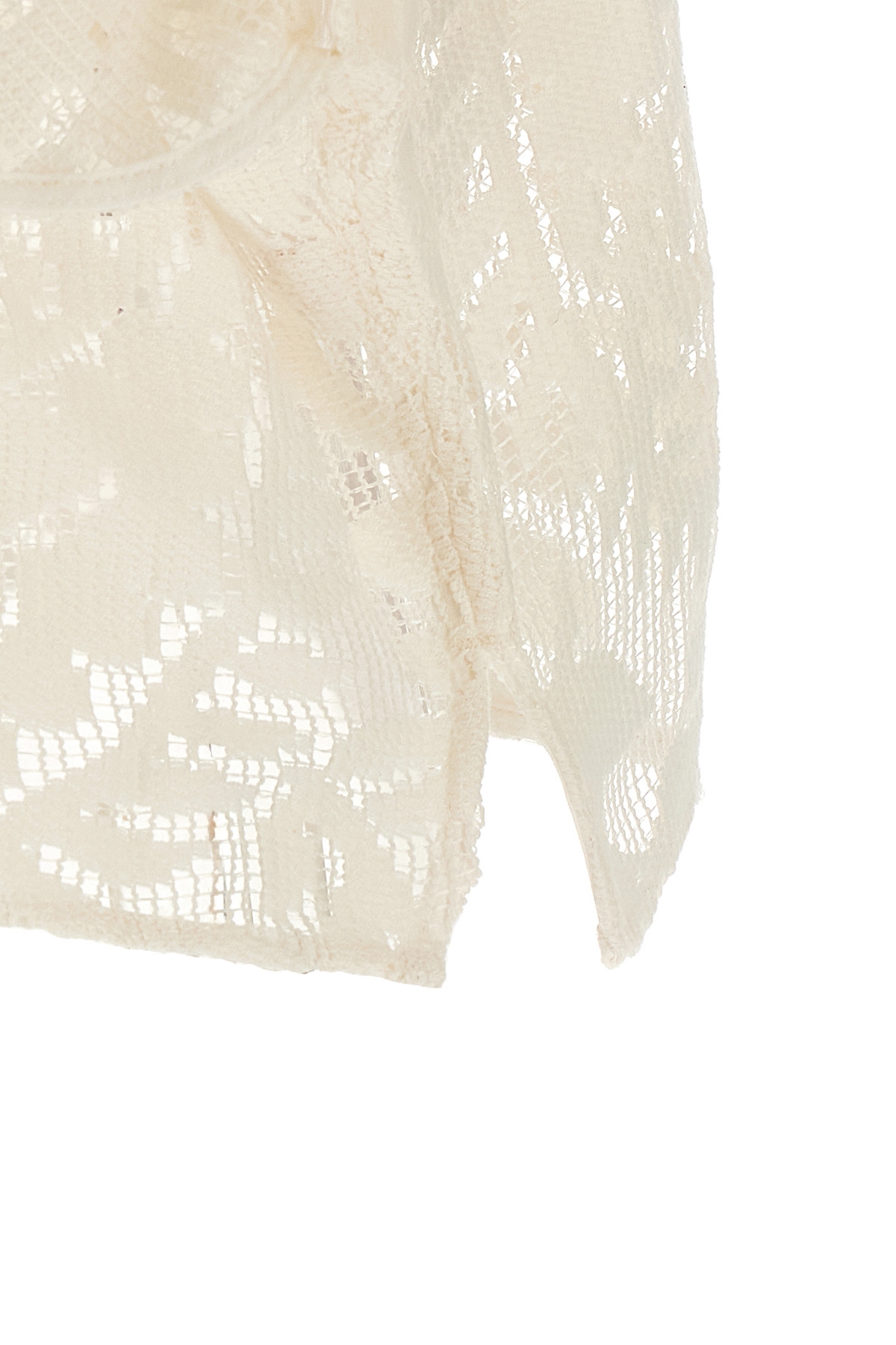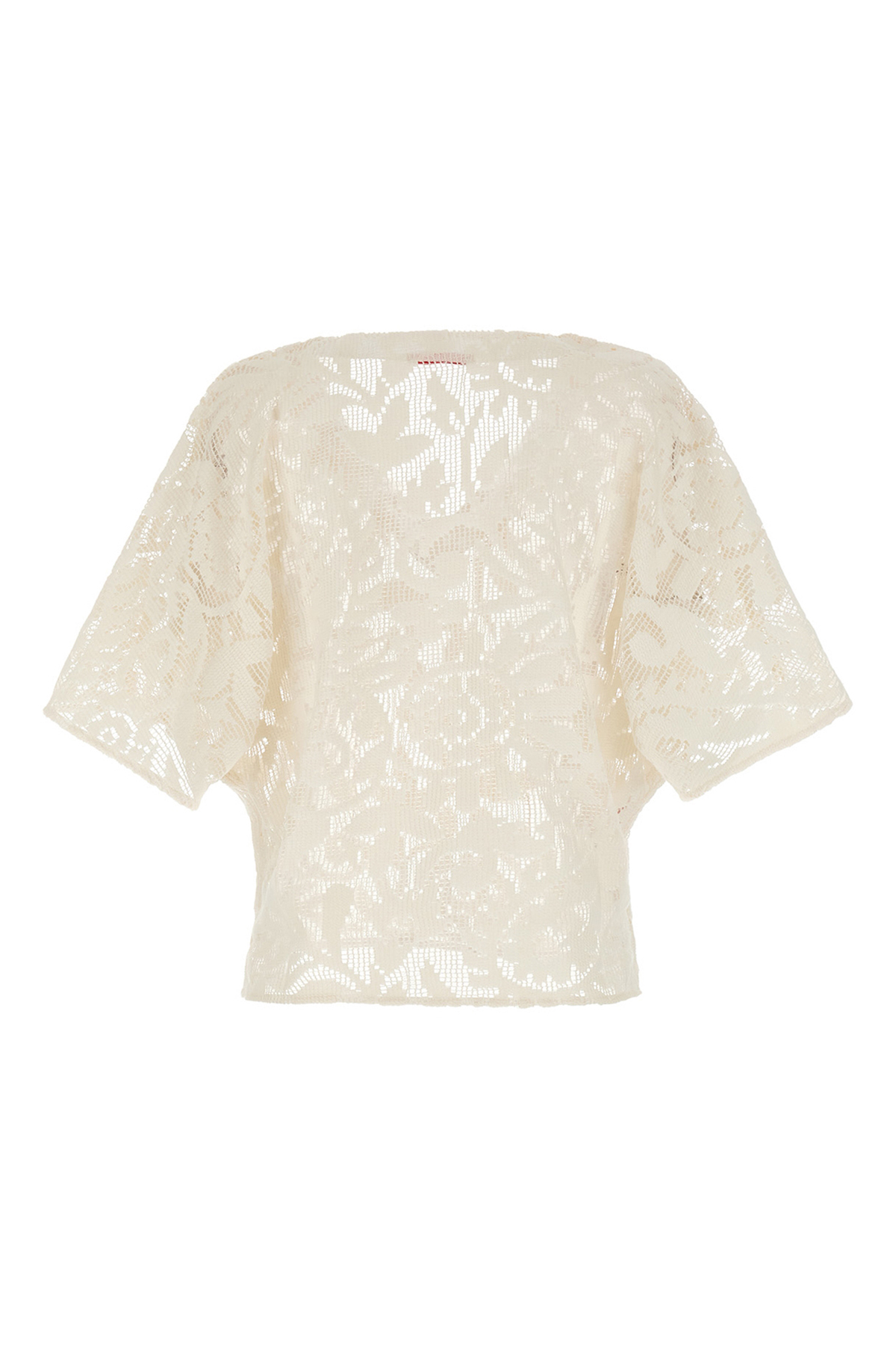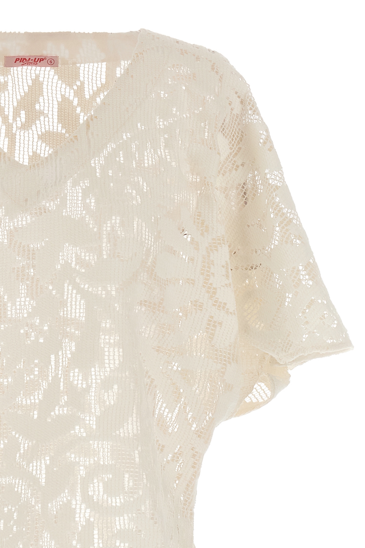 Macrame effect fabric blouse I do not see, V-neck, short butterfly effect sleeves, side slits.