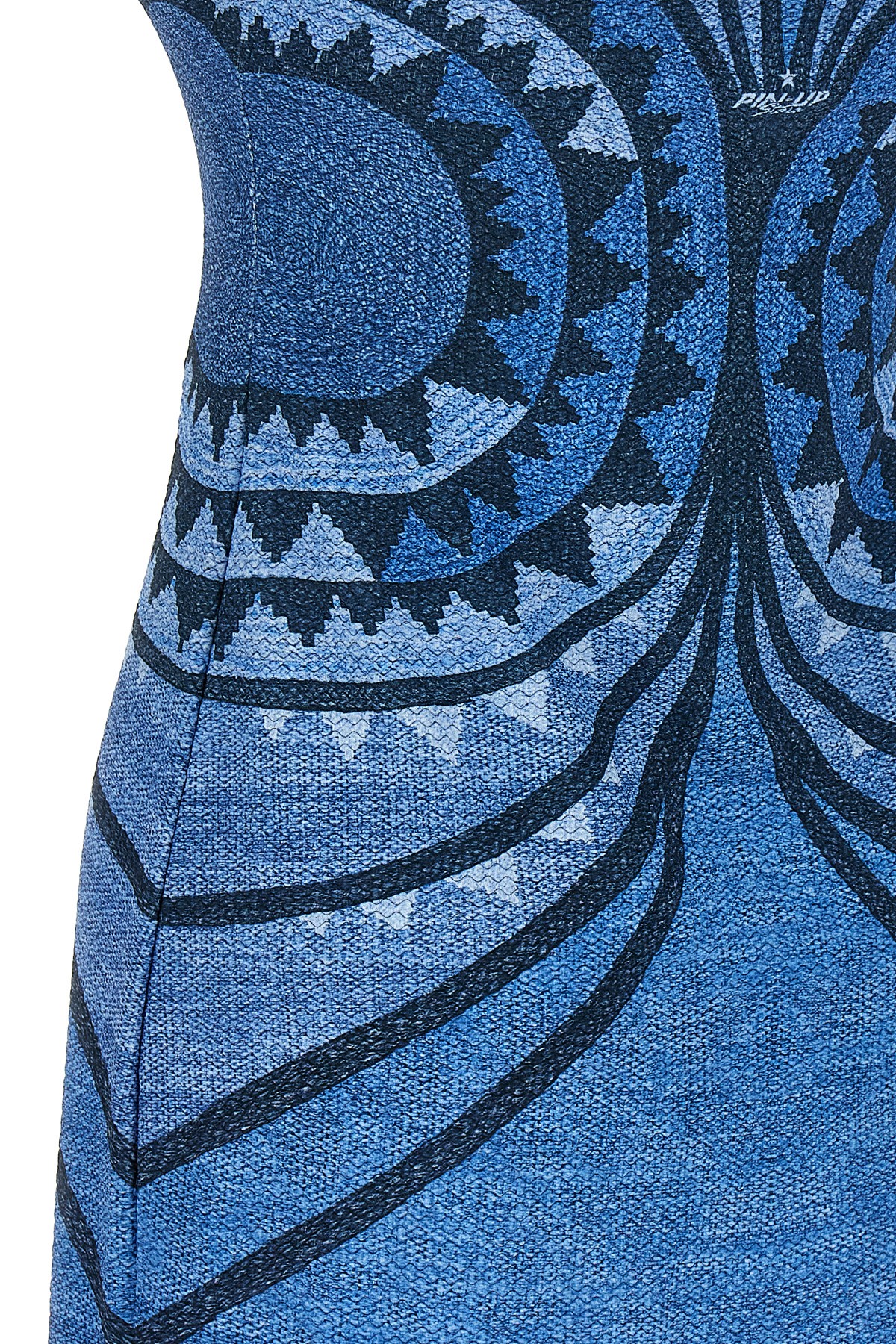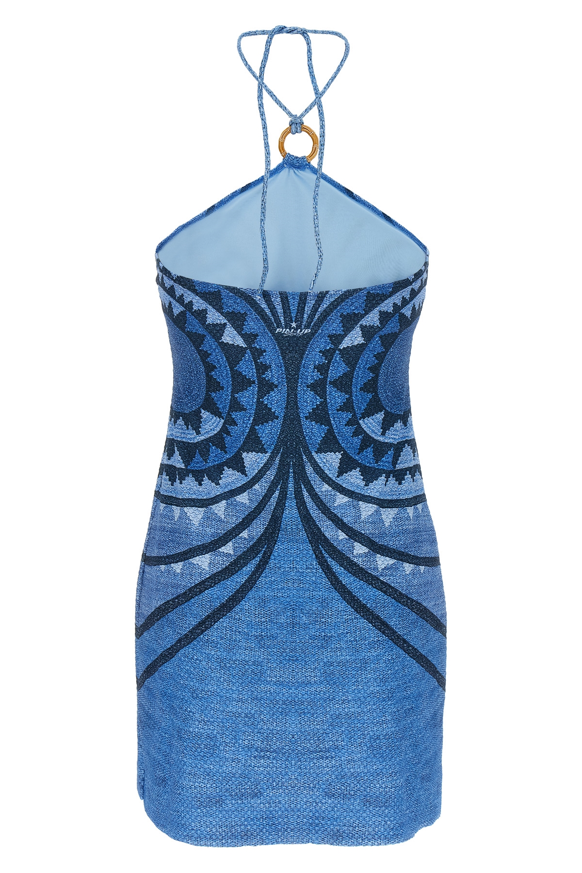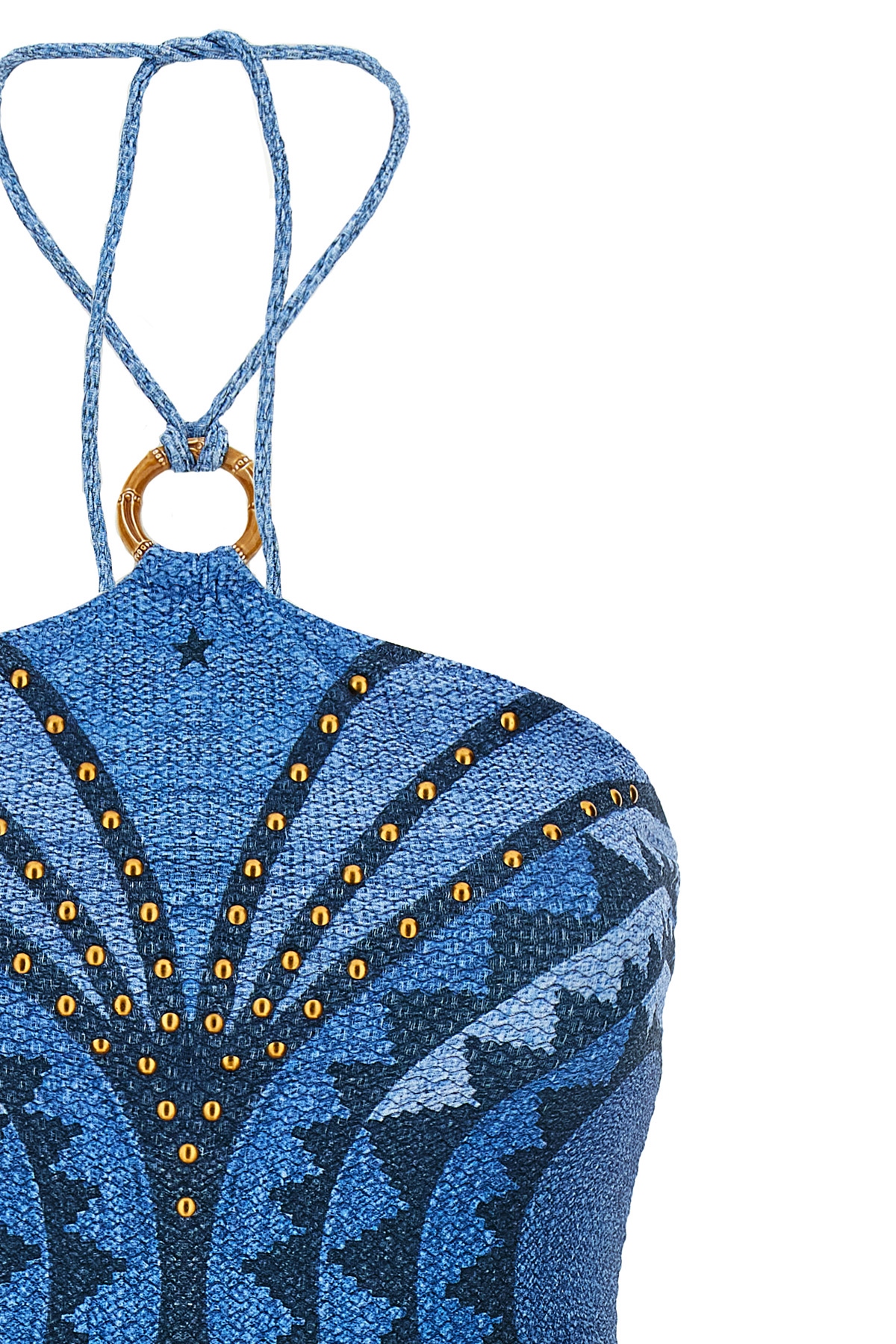 Embossed lycra off-the-shoulder Intreccio Africano minidress with studs and bamboo-effect lacing at the neck.