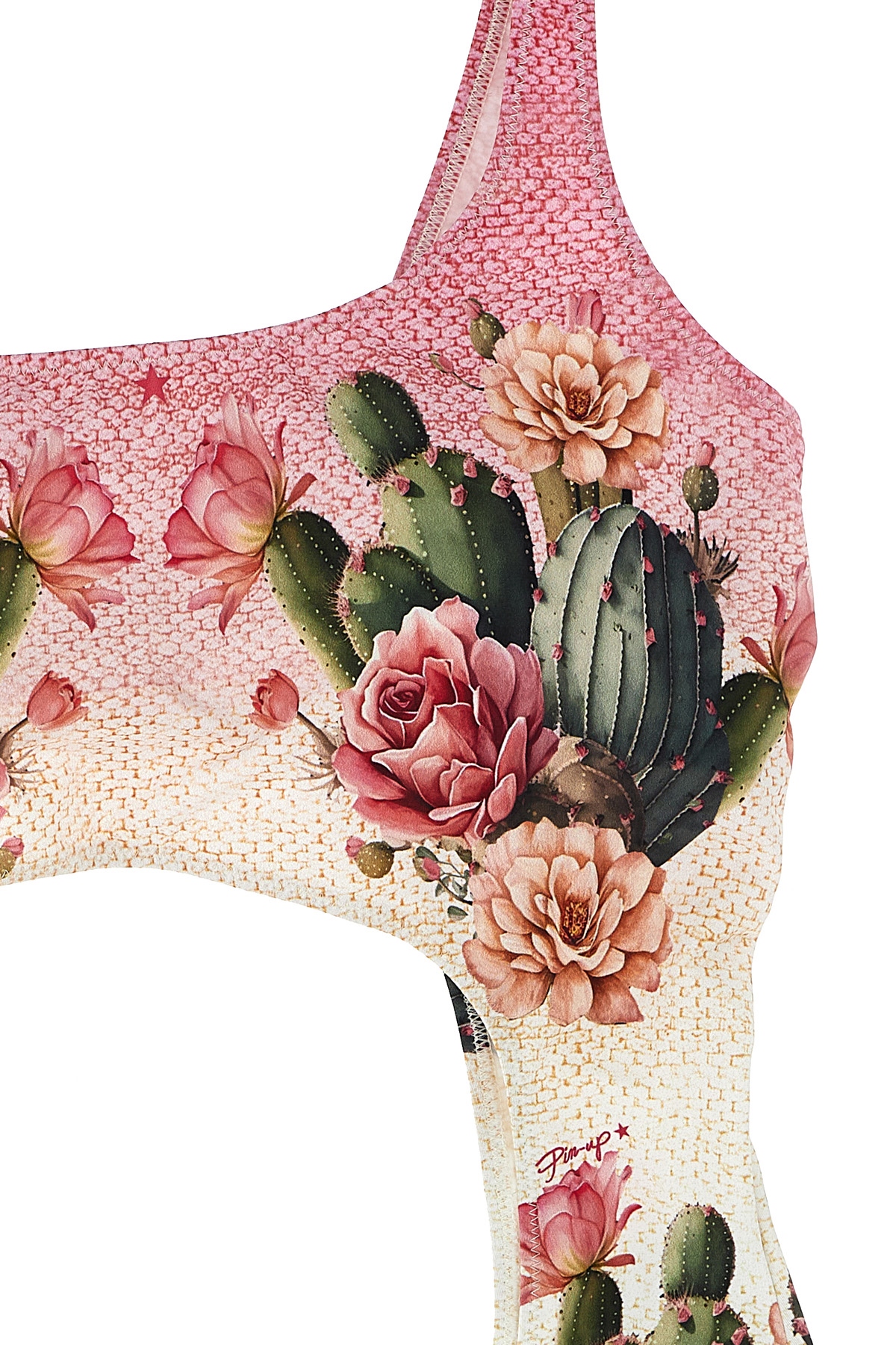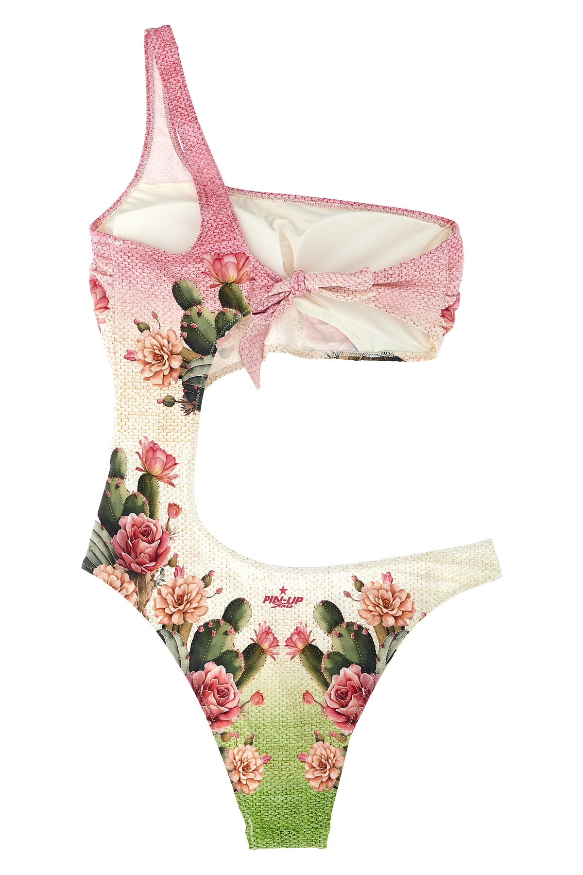 'Fiore del Deserto' print lycra one-piece swimsuit with one-shoulder trikini style, removable padded top, high briefs with ring on one side.