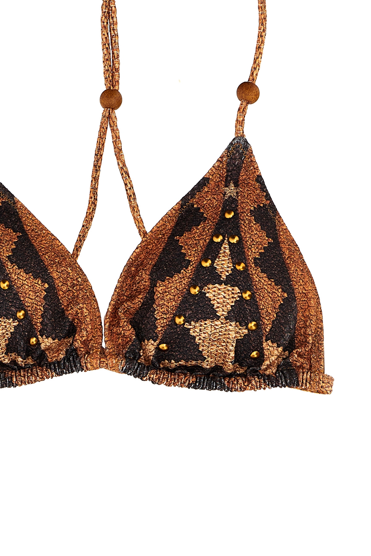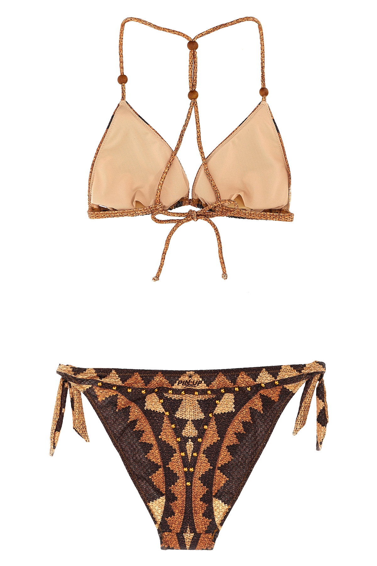 Embossed lycra bikini with 'Intreccio Africano' print and metal studs, triangle top with removable padding and laces, briefs with lacing on the sides.