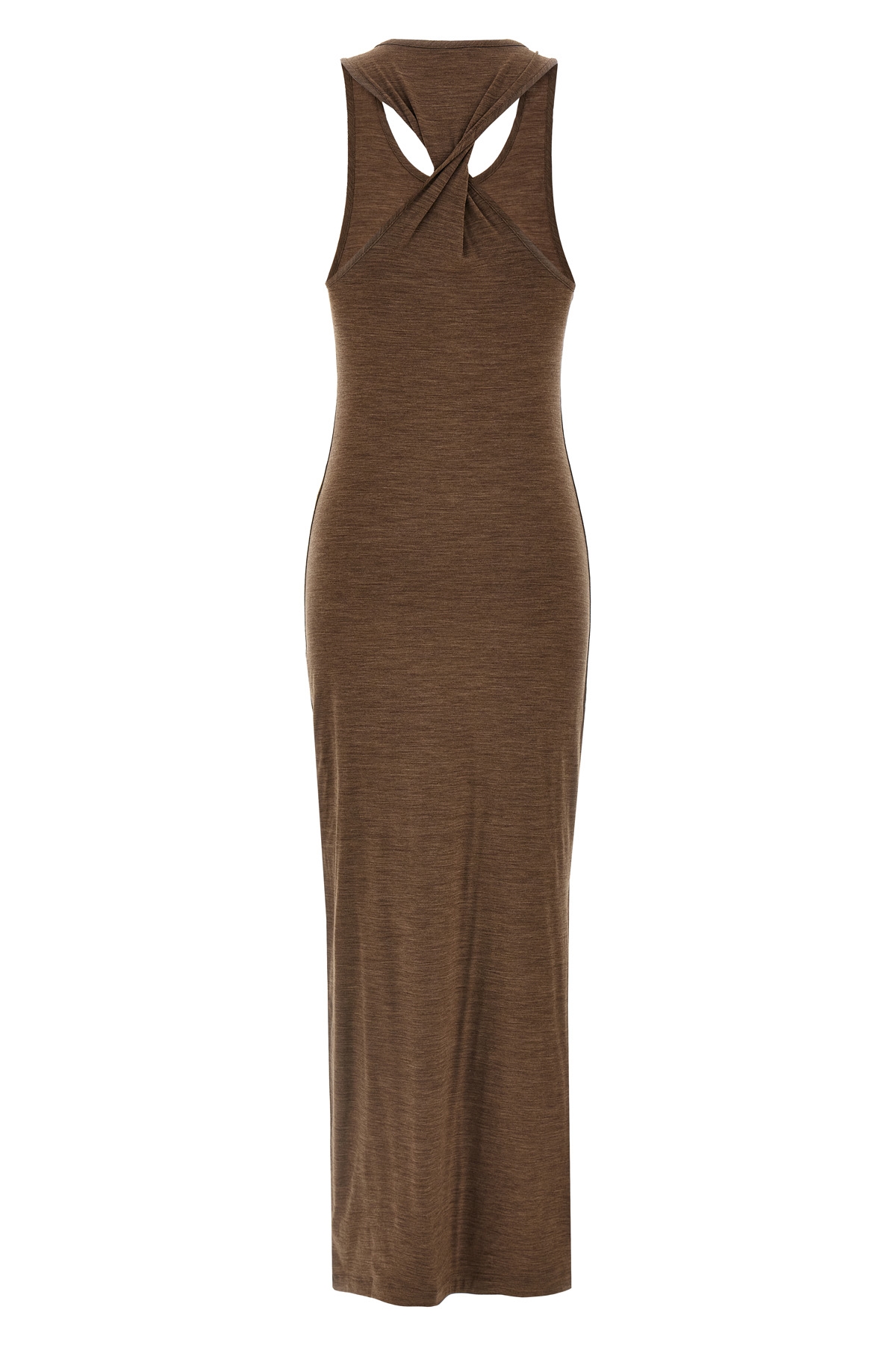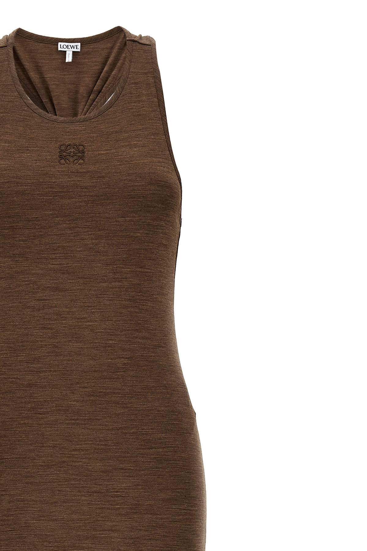 Long dress in light stretch melange wool, tank top twisted on the back, front 'Anagram' embroidery, wide round neckline, side split.