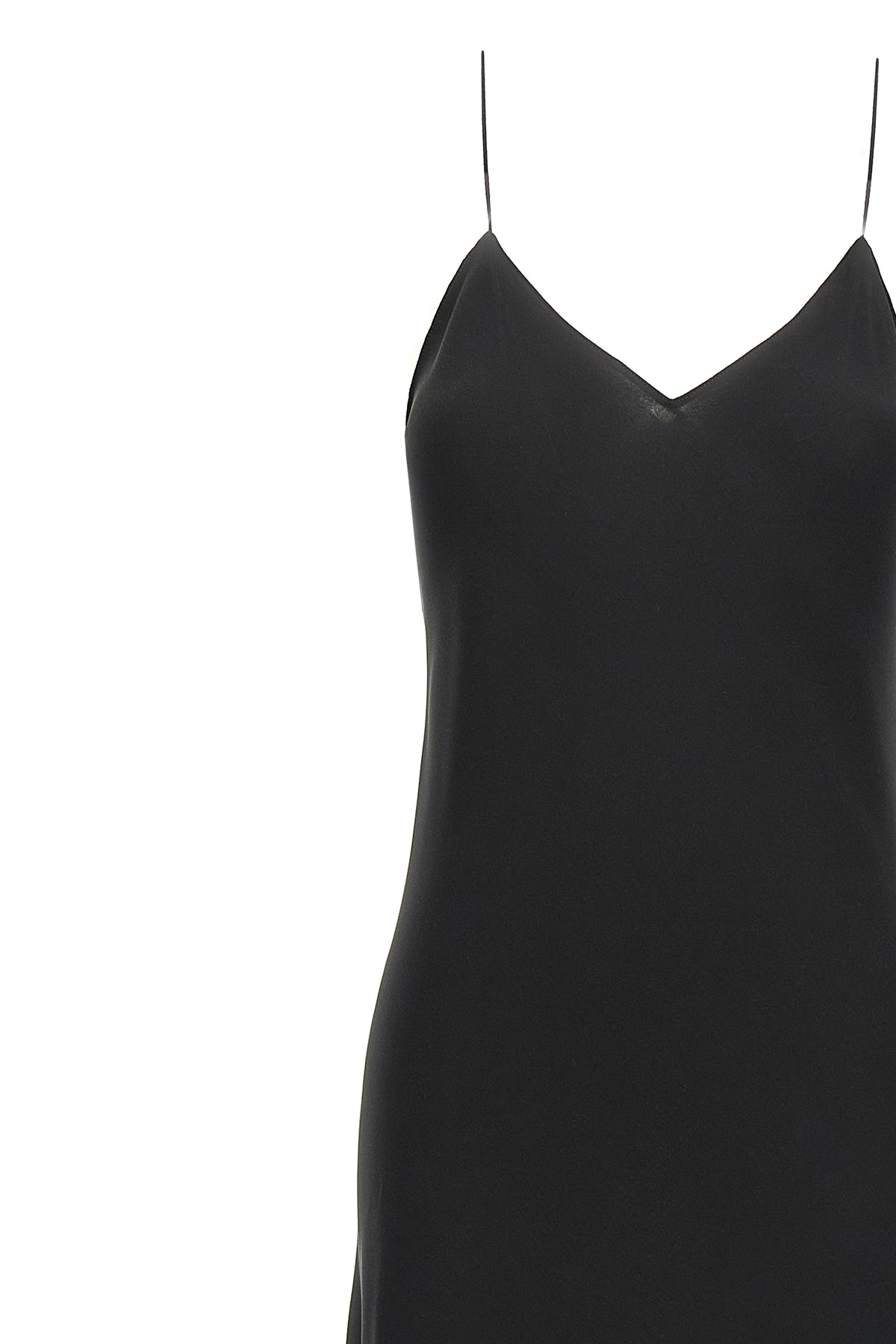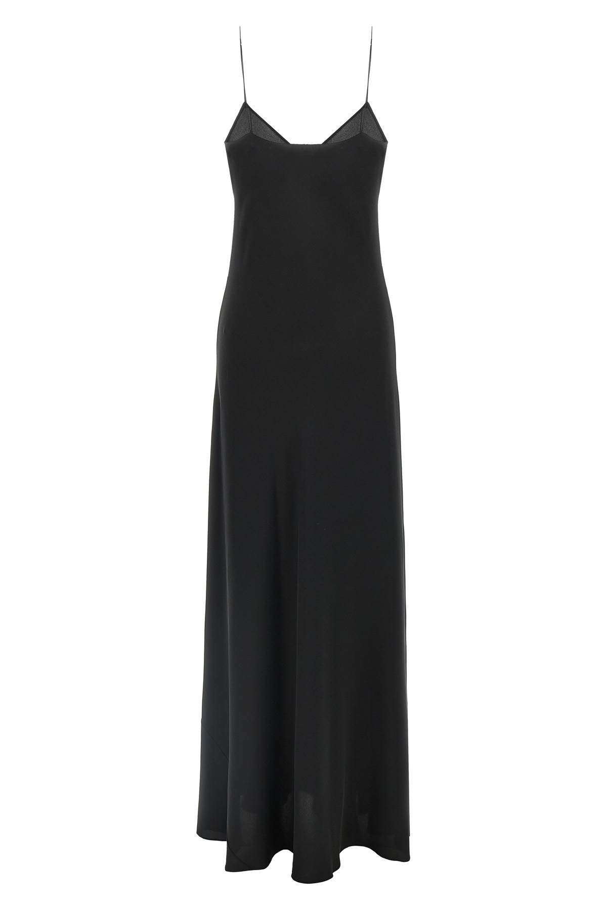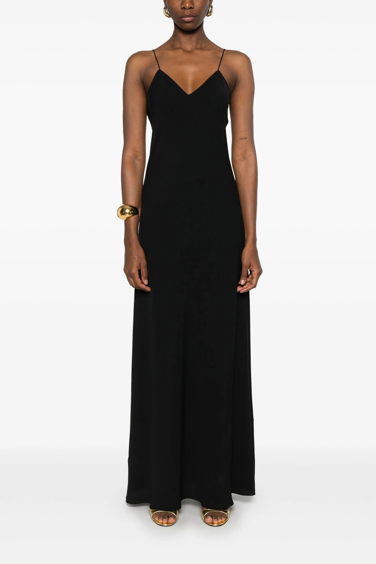 Long 'Kolann' dress in silk frizz georgette with V-neck, sleeveless, thin straps, flared model.