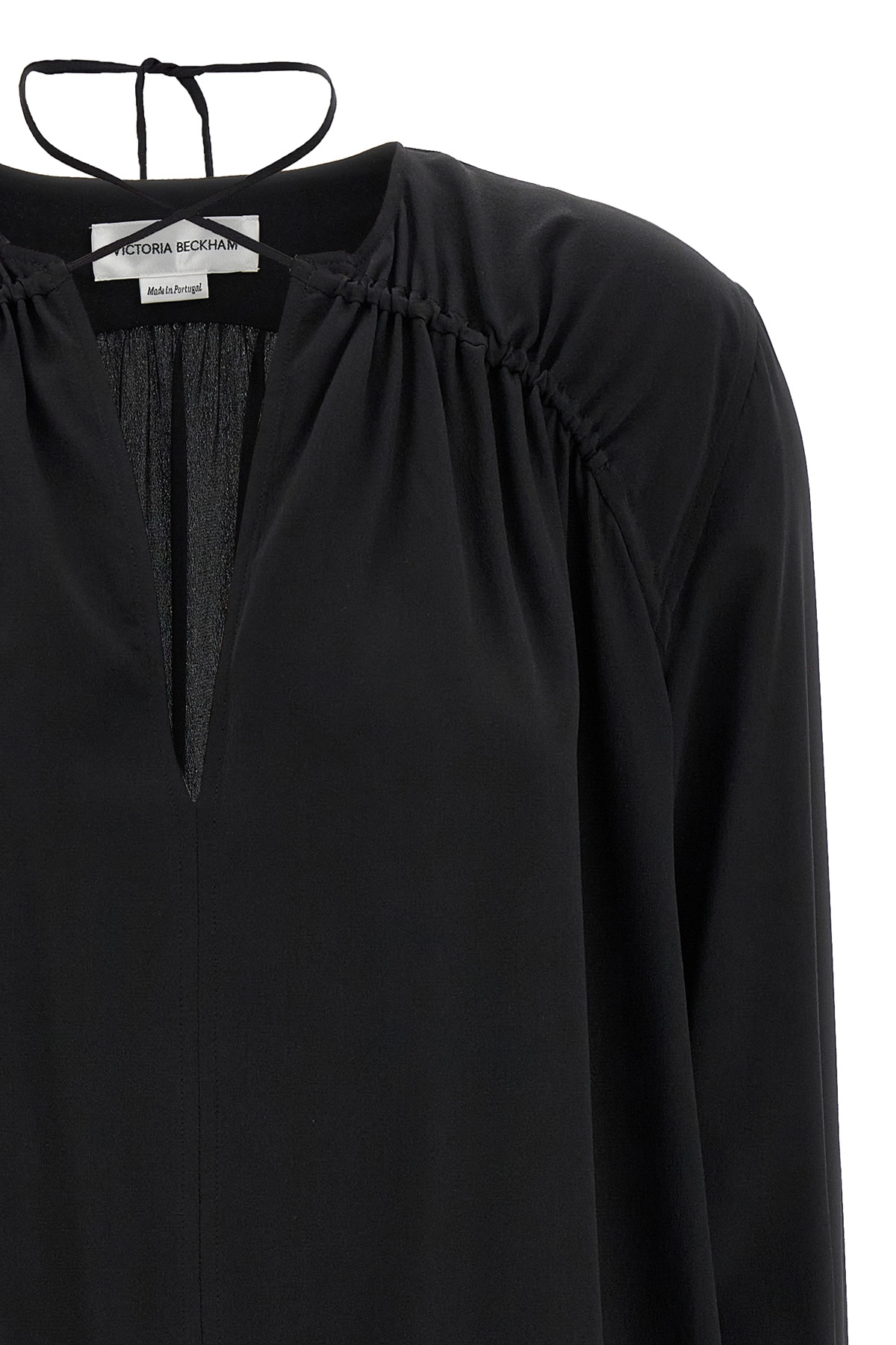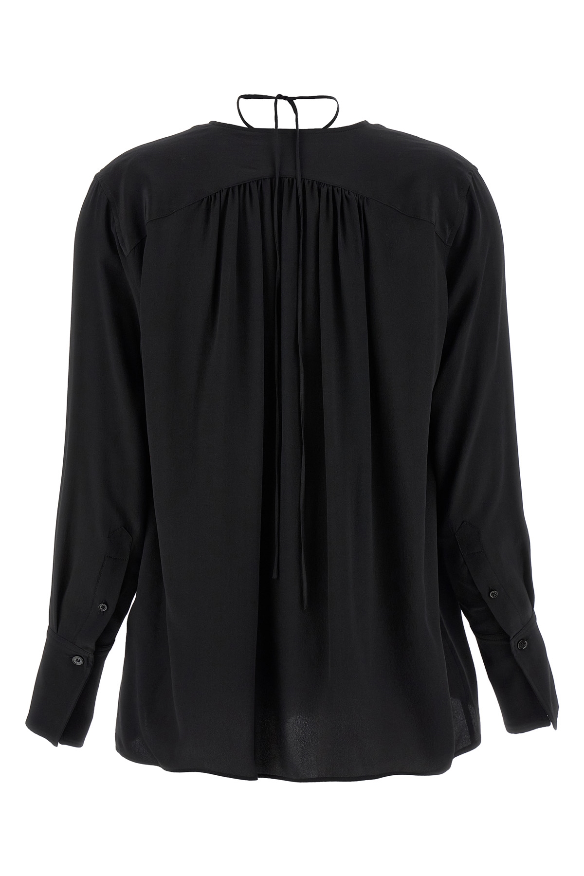 'Gather Detail Tie' silk blouse, V-neck with adjustable drawstring, long cuffed sleeves.
