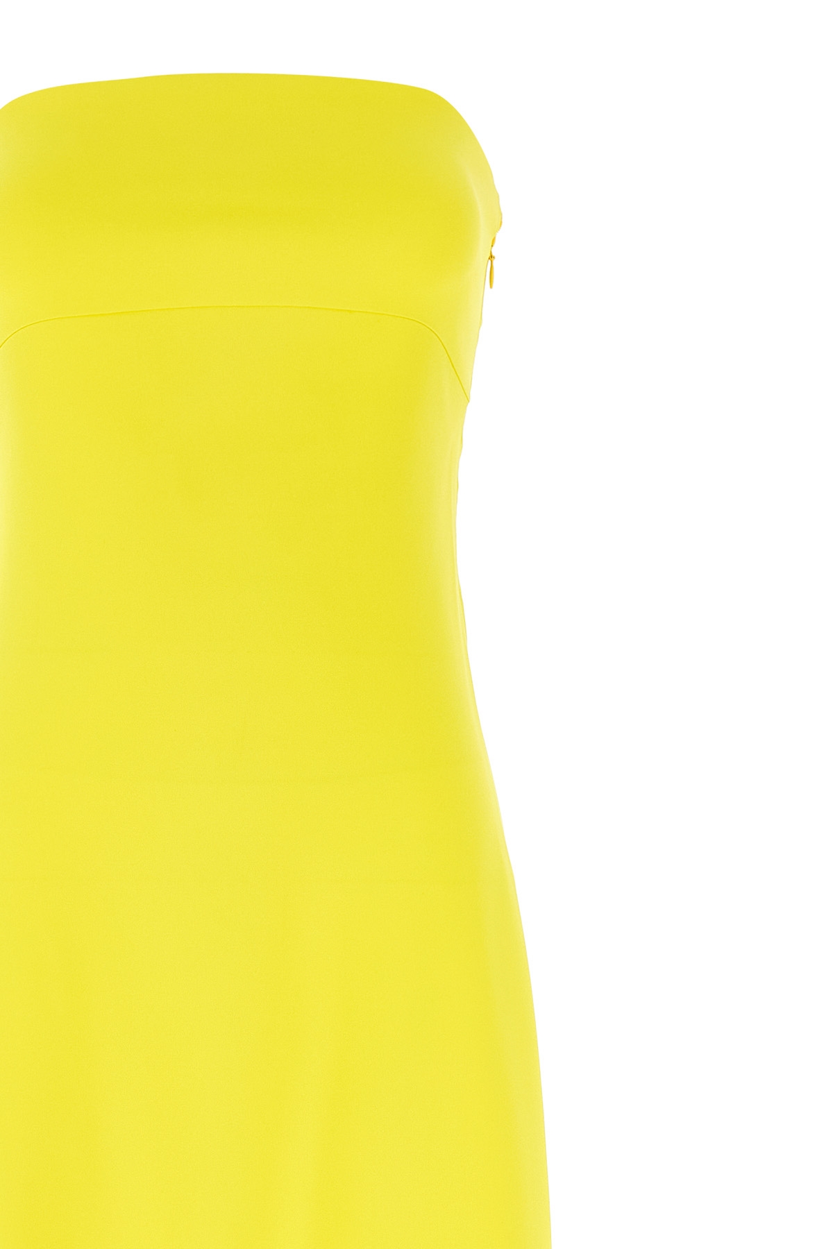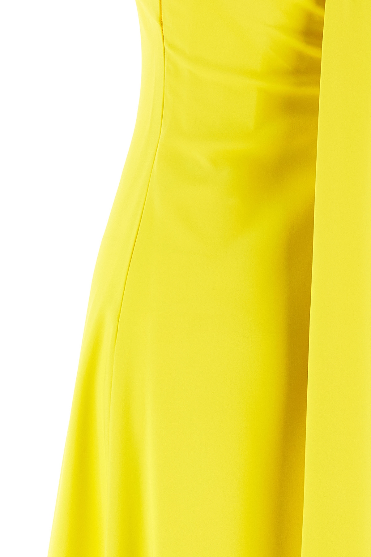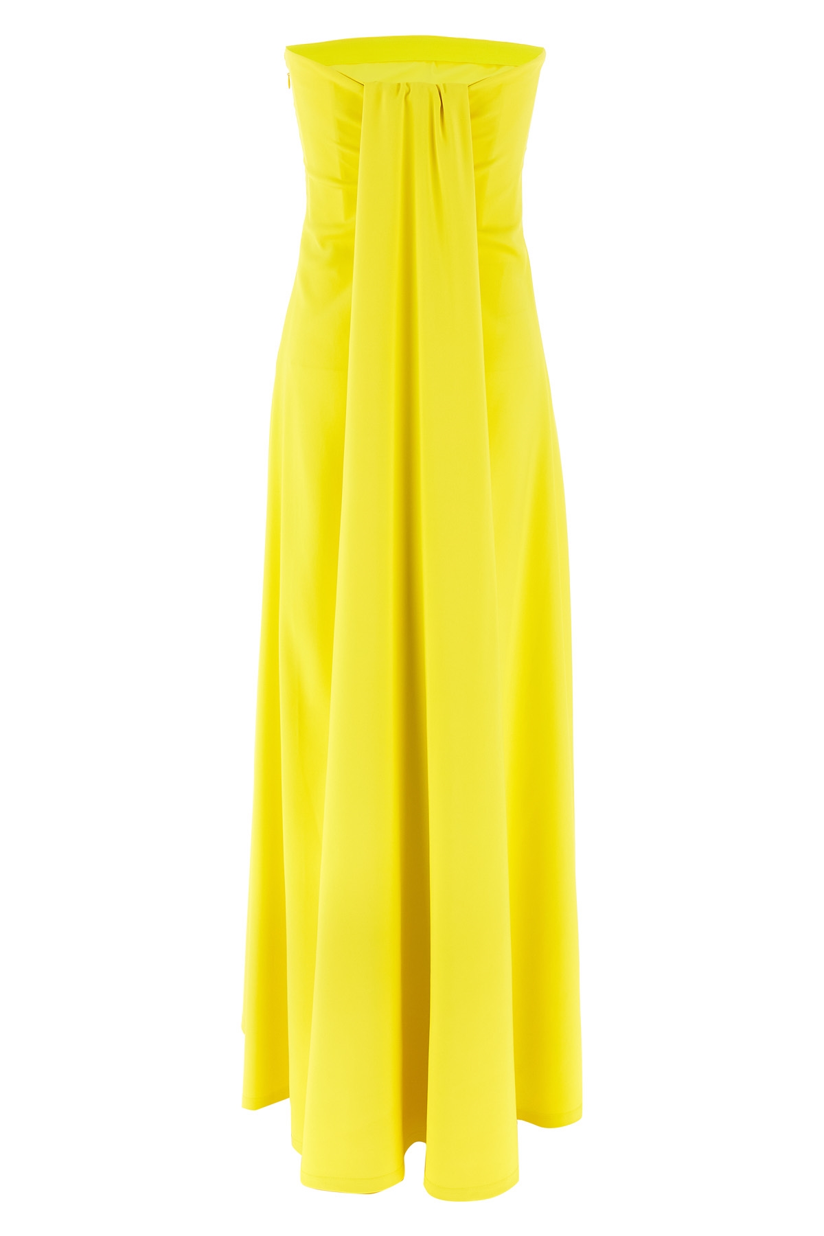 'La Robe Bustier' off-the-shoulder dress in stretch viscose with back draping, flared silhouette, structured inner corset with cues, side zip closure.