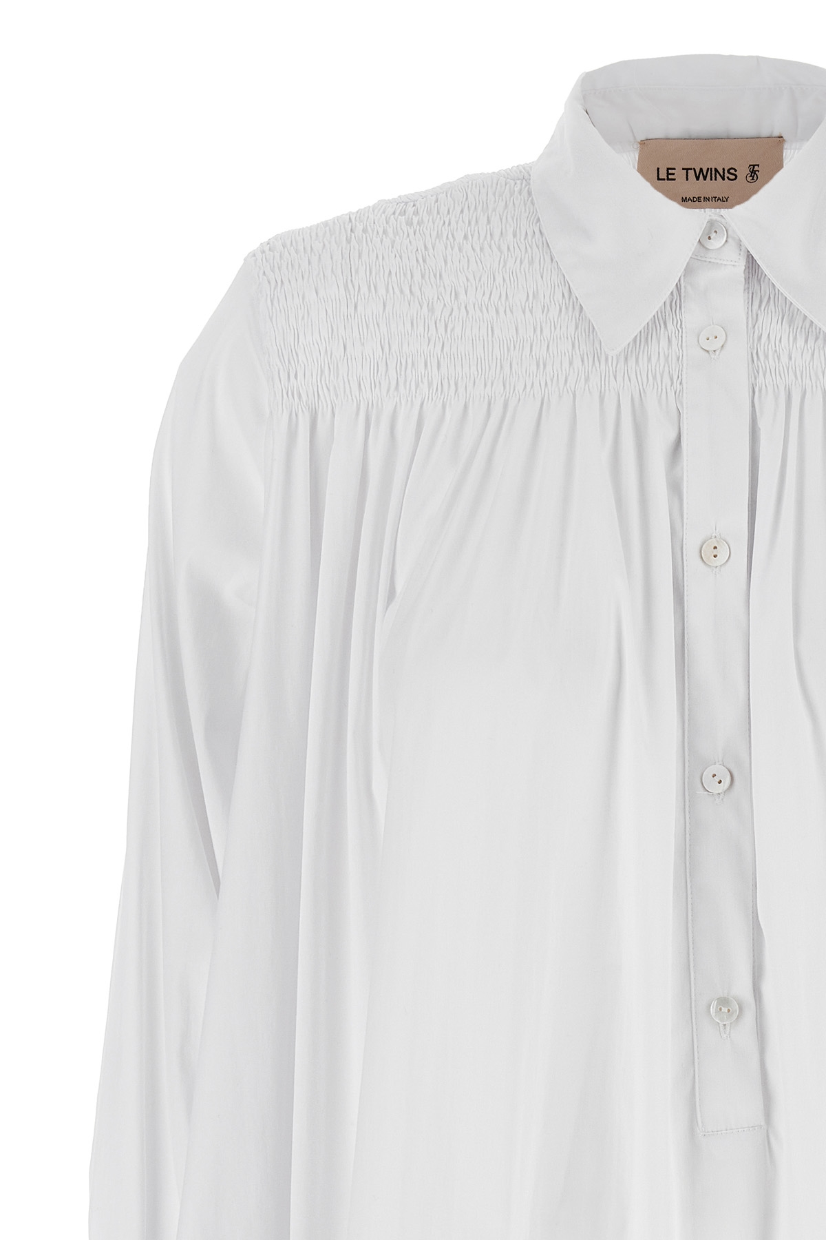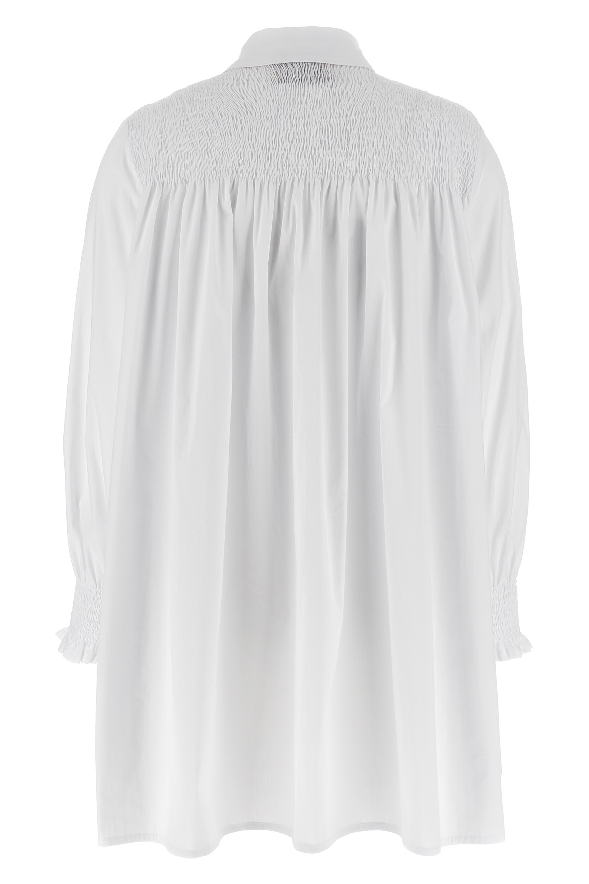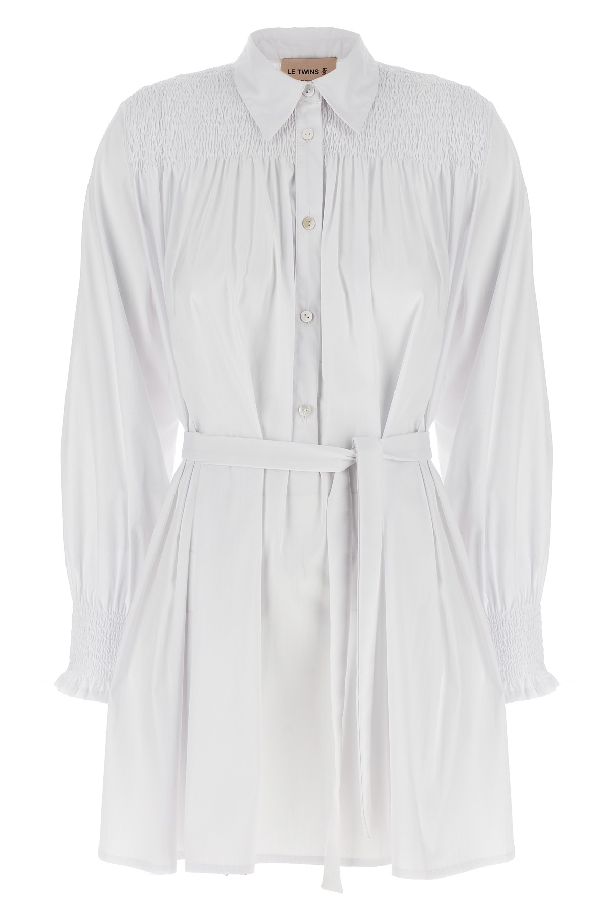 'Bianca' cotton mini dress with smock stitch embroidery details, chemisier model, front button closure, long wide sleeves with elastic cuffs, pockets, sash tie at the waist.