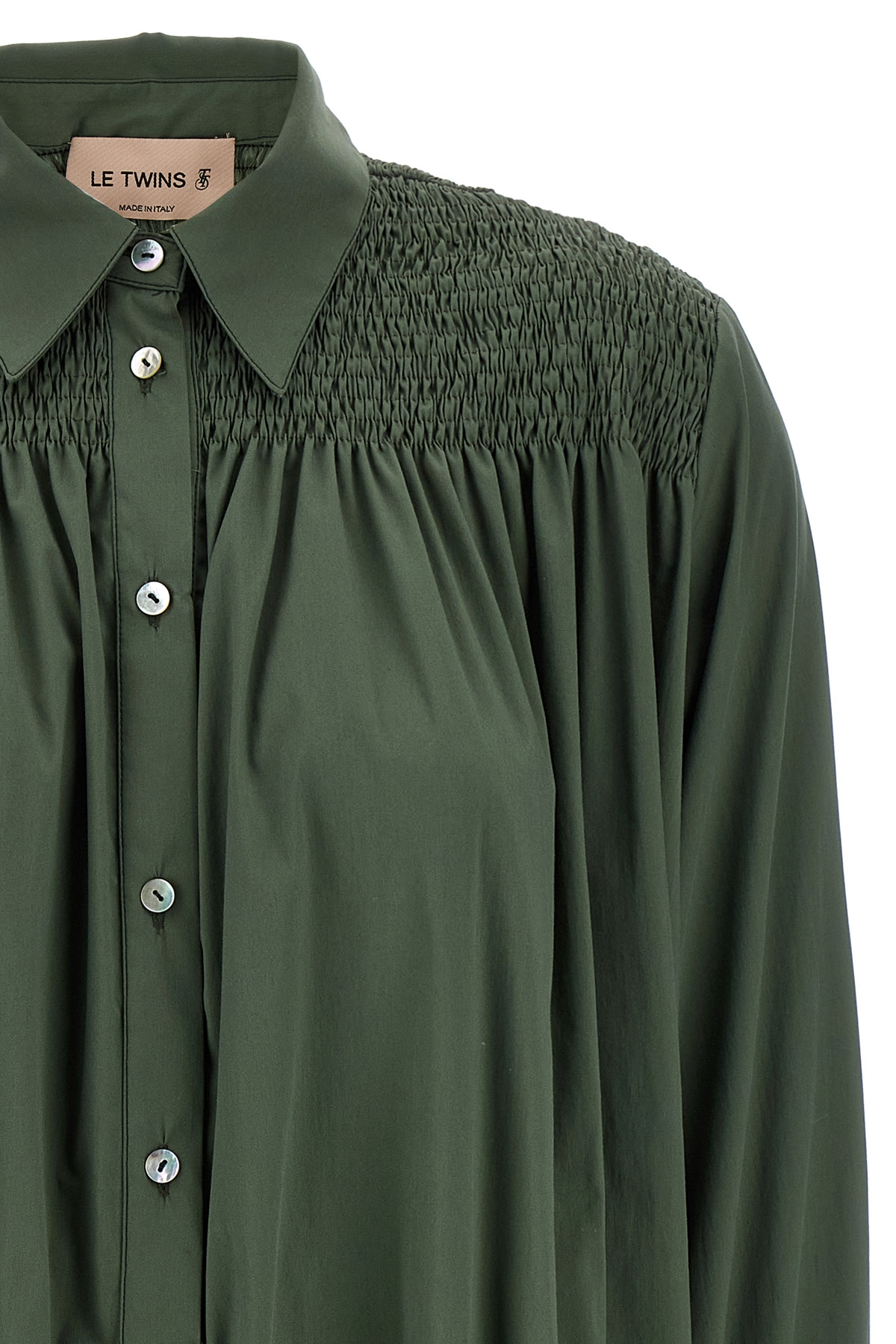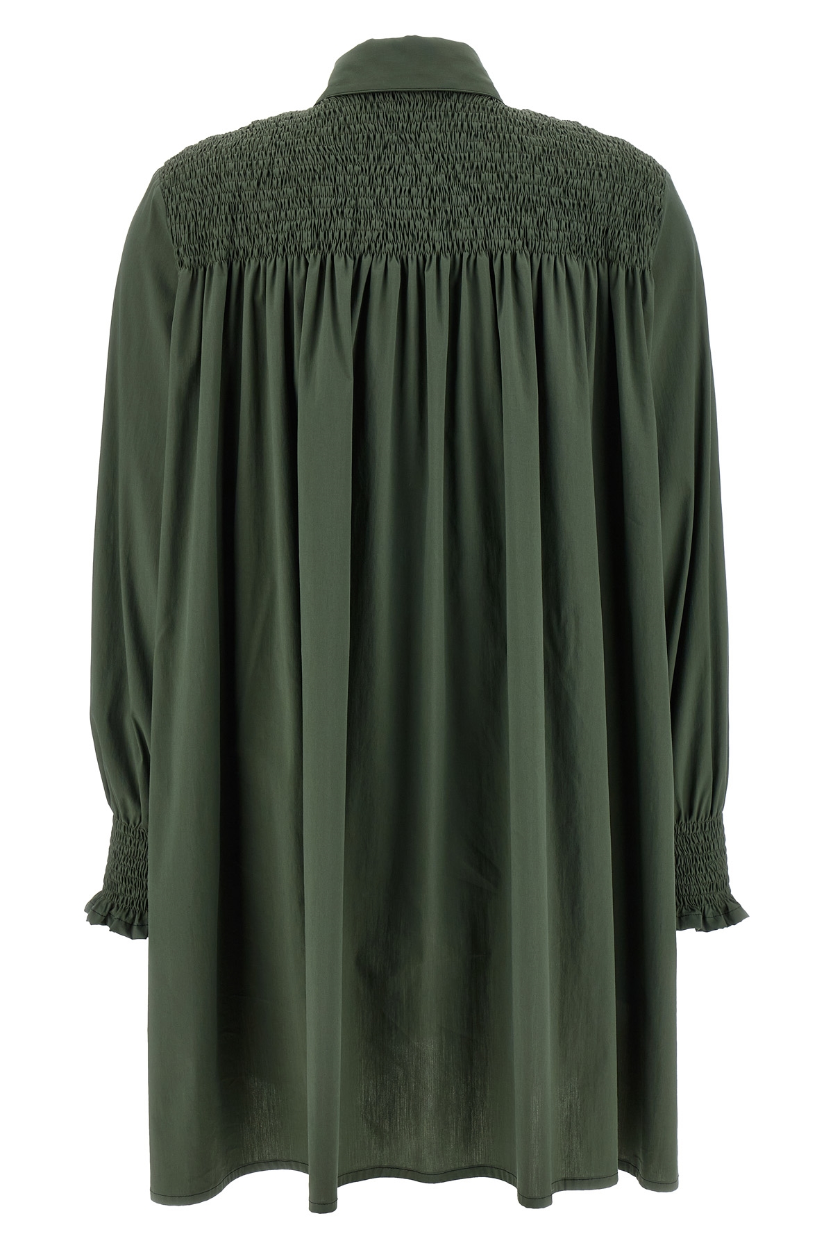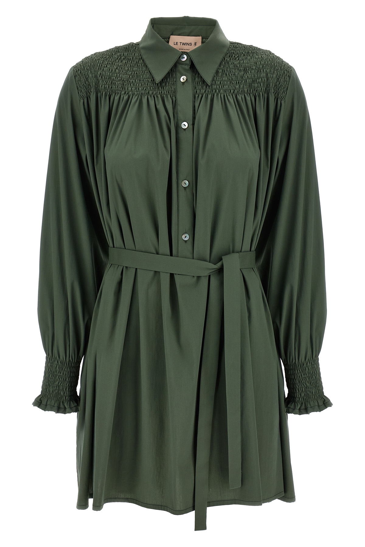 'Bianca' cotton mini dress with smock stitch embroidery details, chemisier model, front button closure, long wide sleeves with elastic cuffs, pockets, sash tie at the waist.