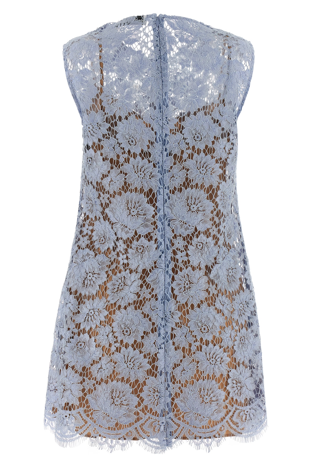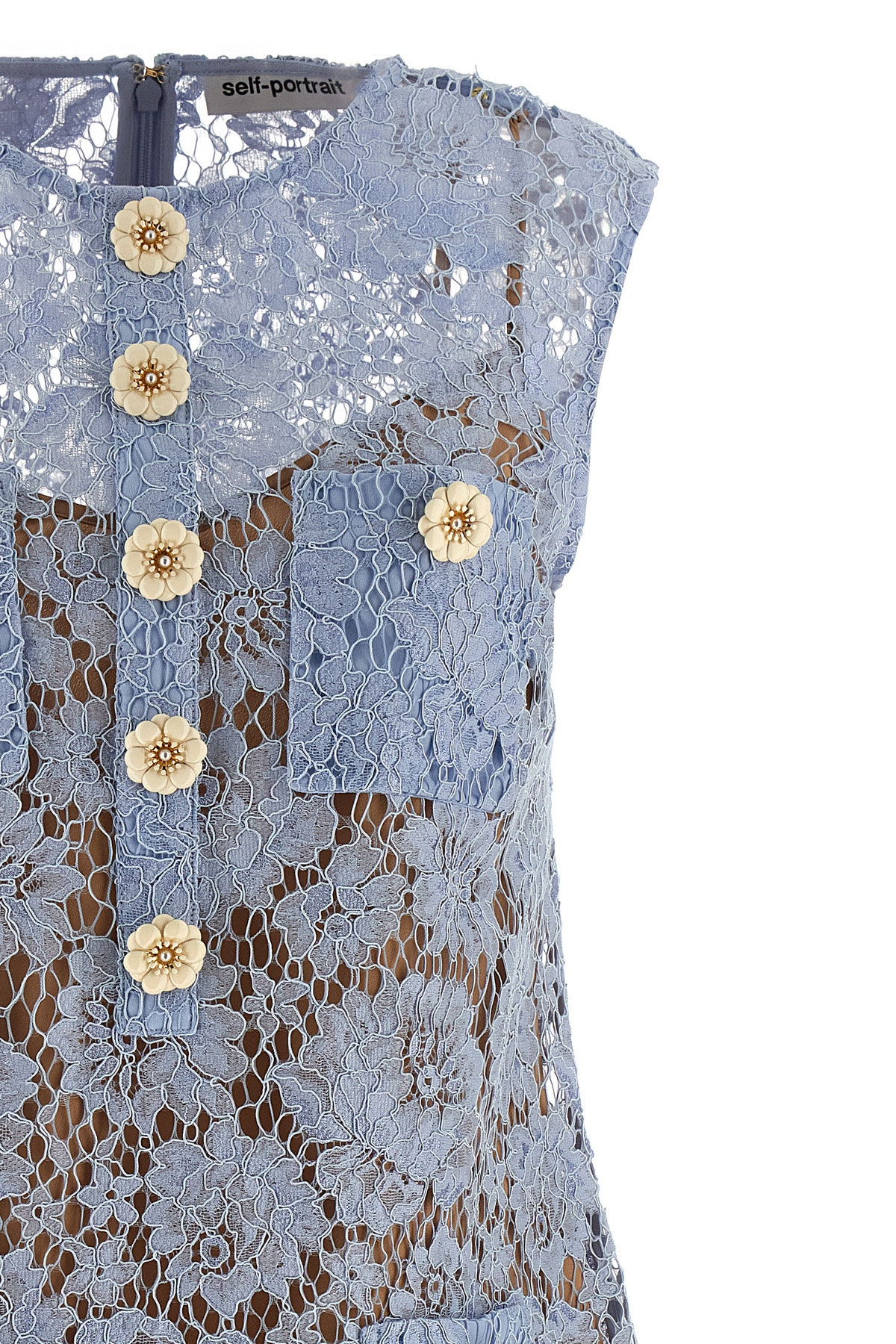 'Blue Fine Lace Mini' lace dress I don't see, crew neck, sleeveless, jewel buttons, pockets, back zip closure, removable petticoat.