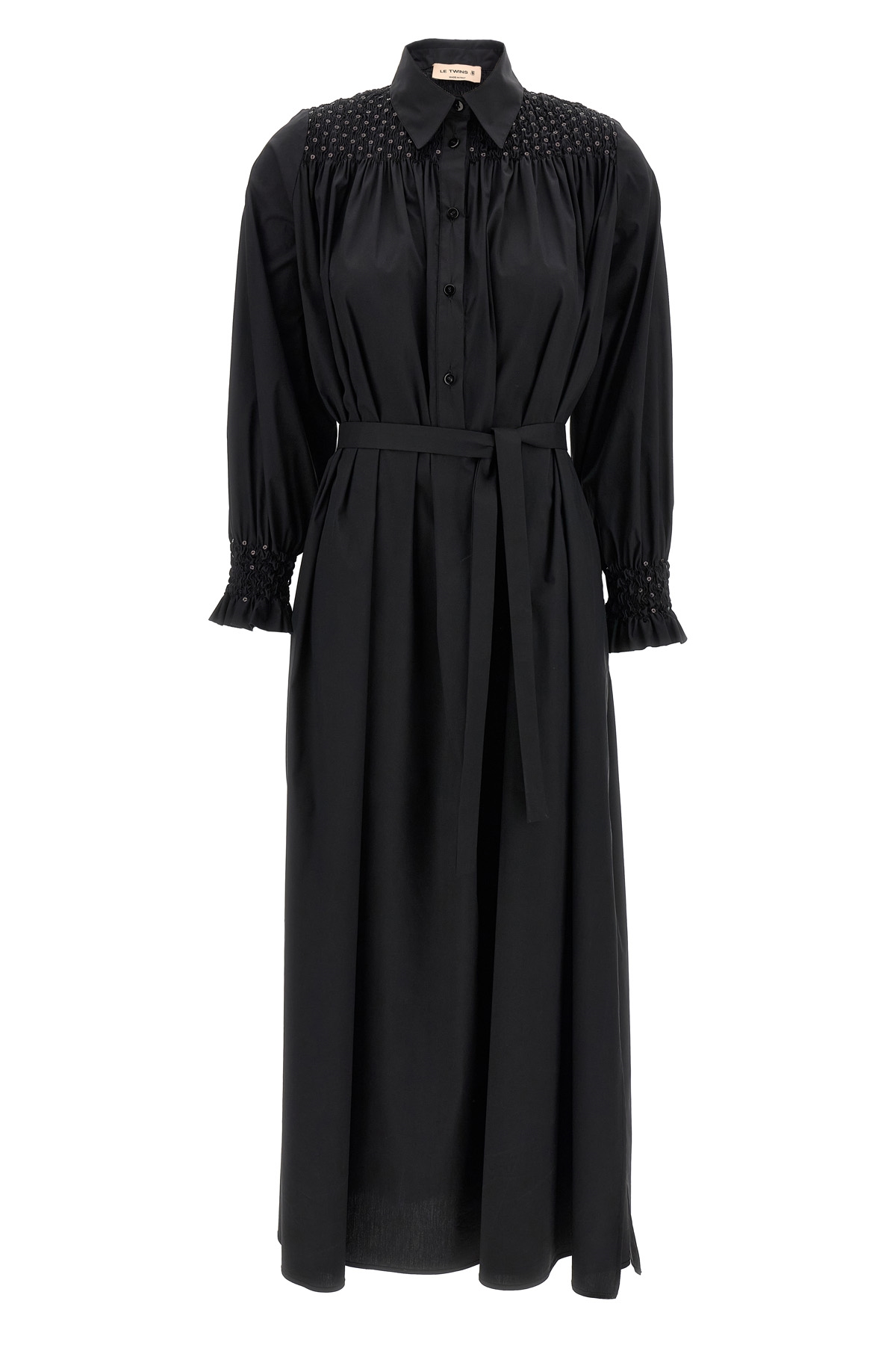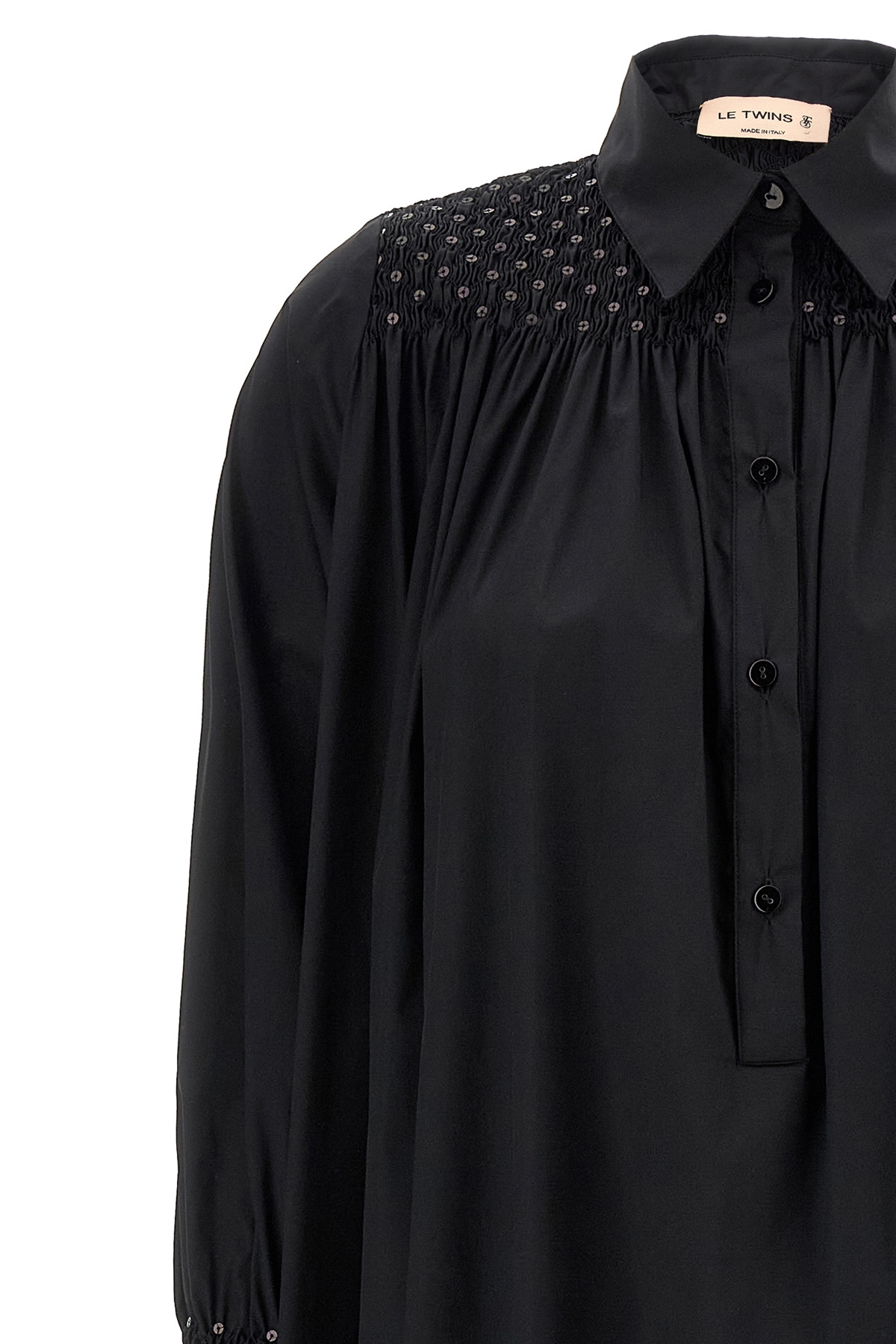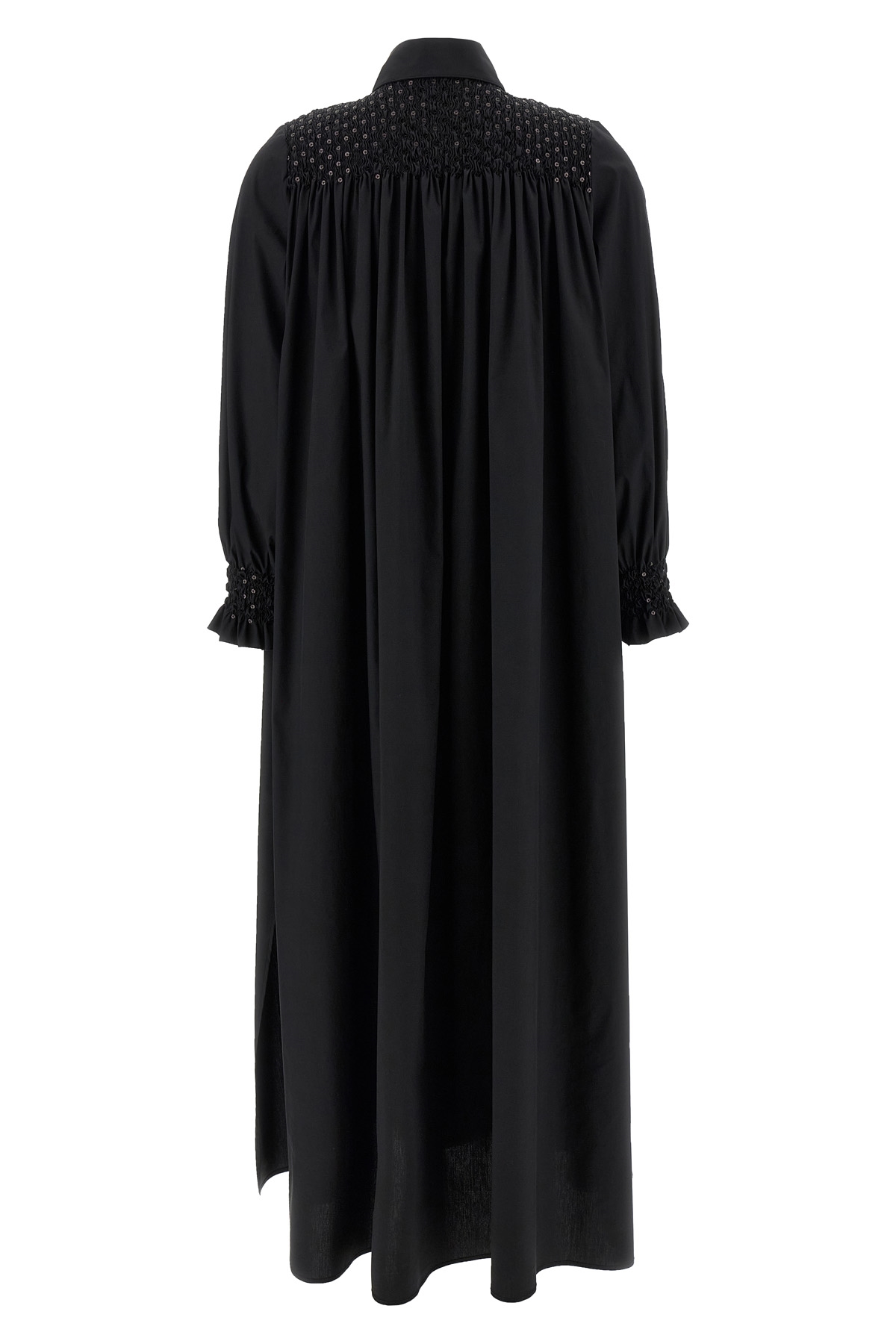 'Benedetta' long cotton dress with smock stitch embroidery details with applied sequins, chemisier model, front button closure, pockets, side slits, long sleeves with elastic cuffs, sash tie at the waist.