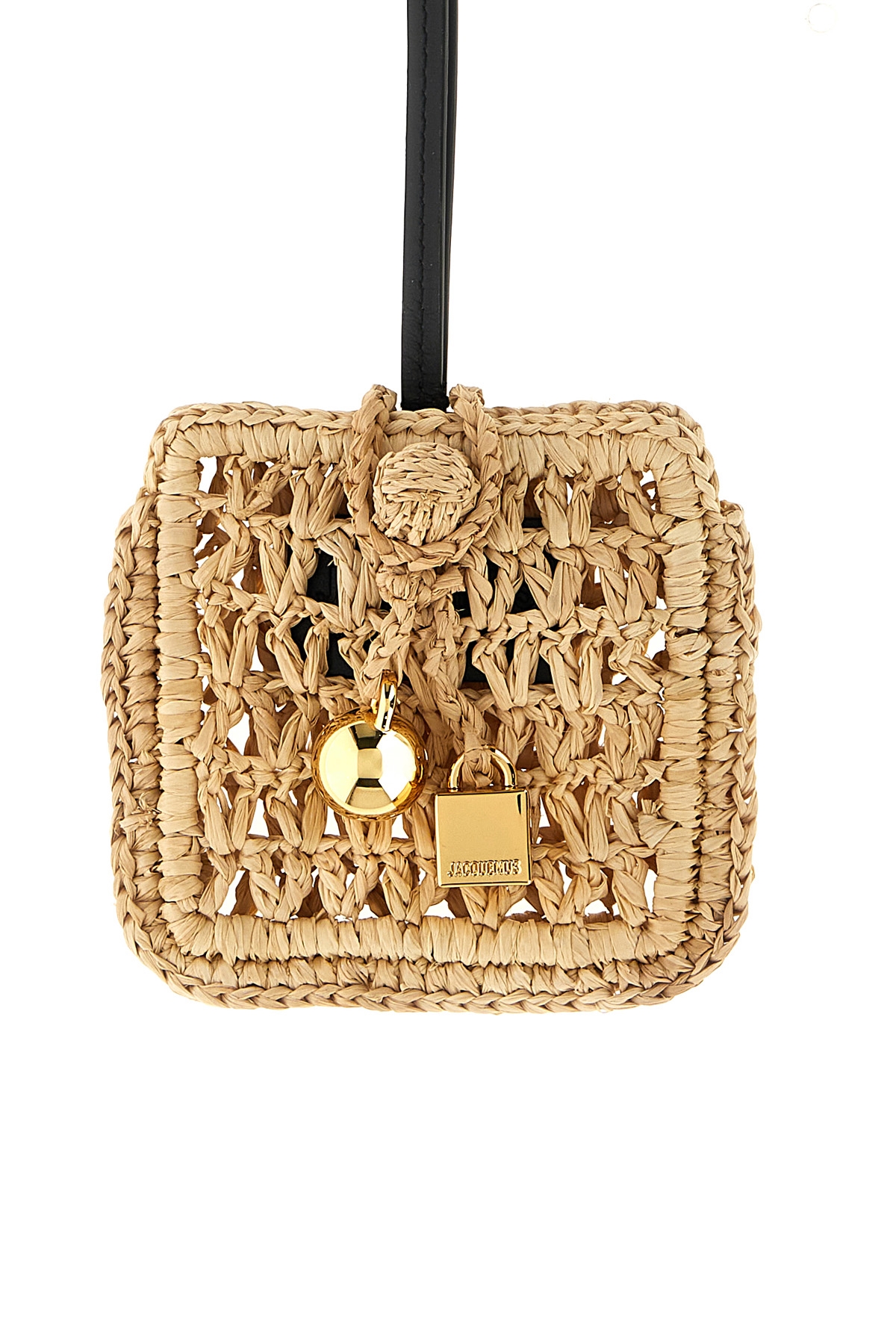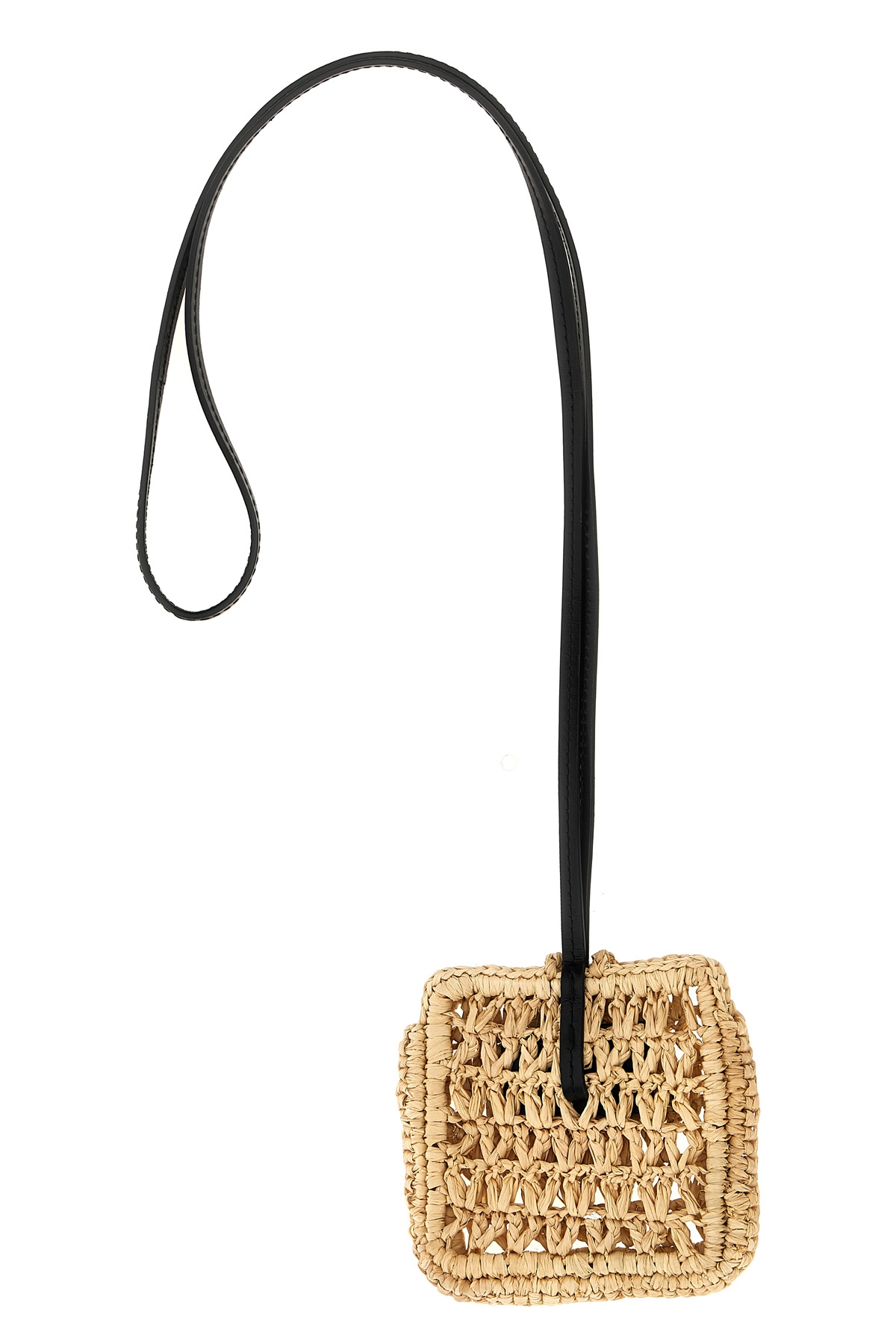 Braided raffia Le Porte Spiaggia AirPods case, leather strap, toggle closure, front metal pendant detail.