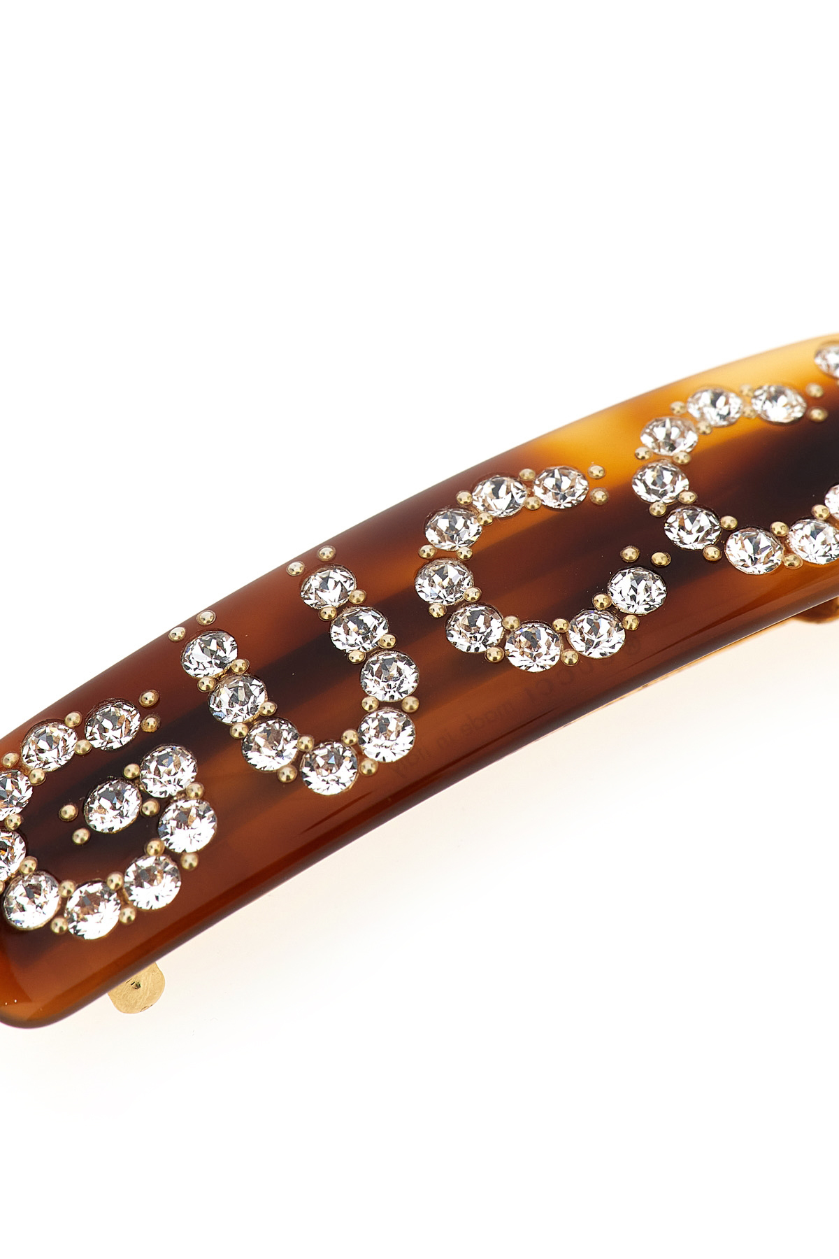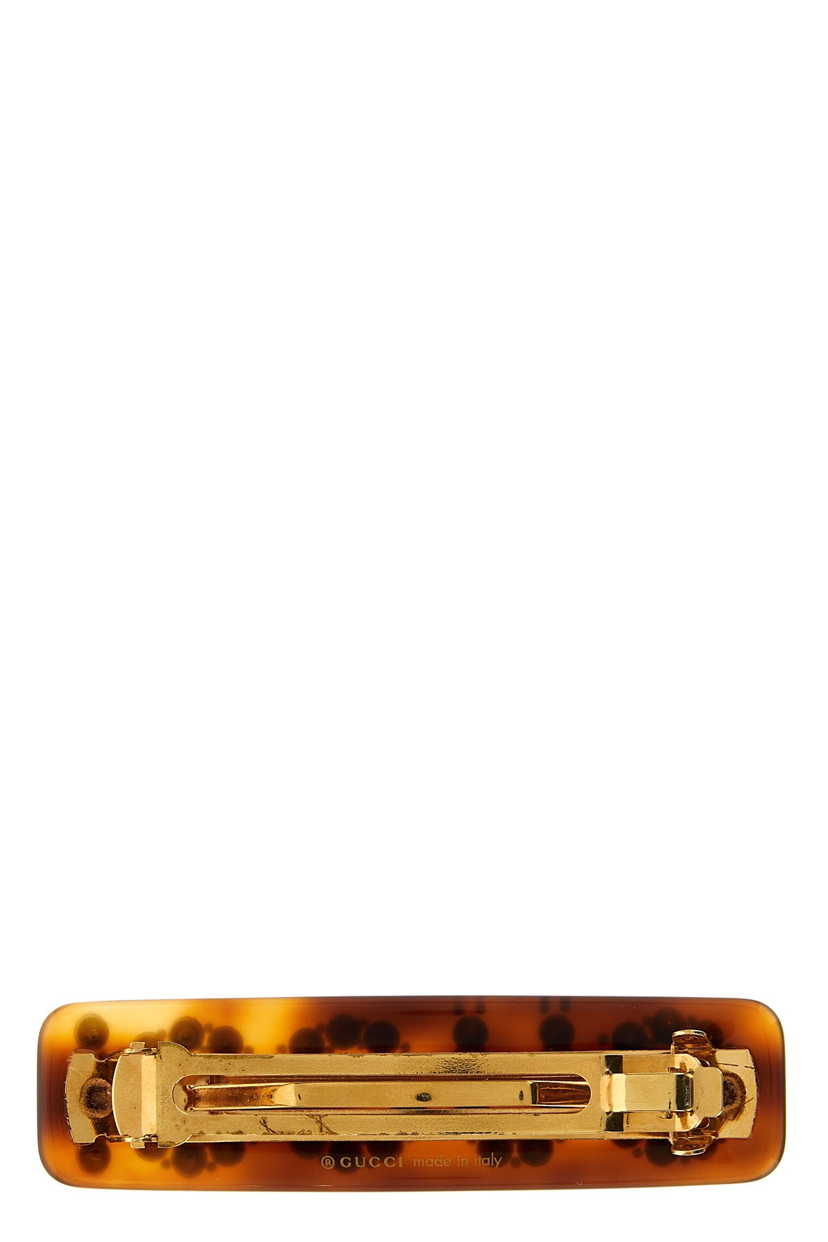 Tortoiseshell resin hair clip, Gucci pattern with rhinestones and metal studs, metal clip.