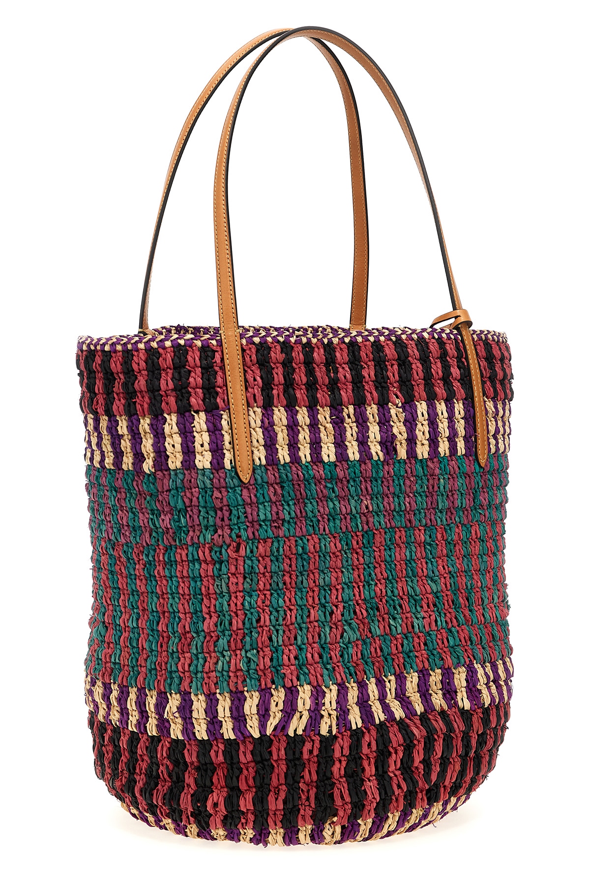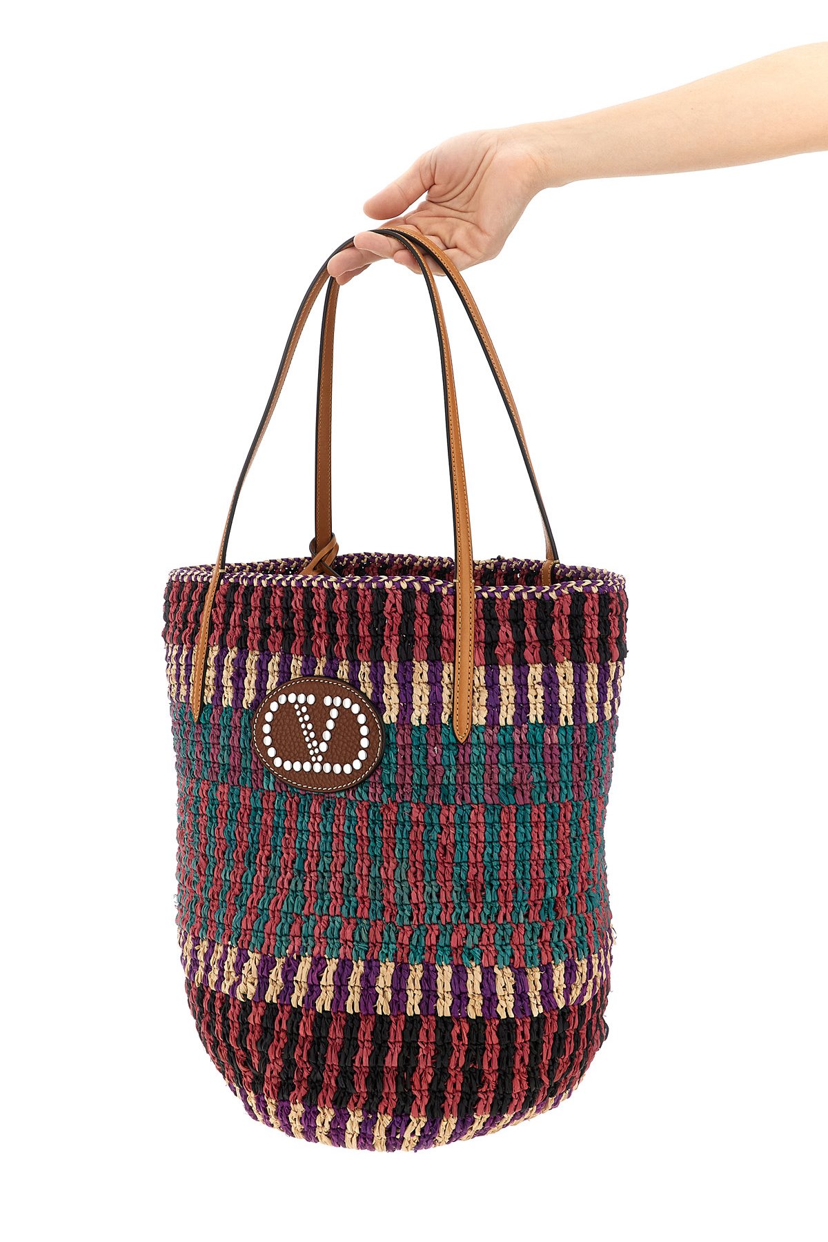 Hand-woven raffia shopper, Vlogo Signature studded leather patch, double fixed leather handle, metal details, removable leather clutch.