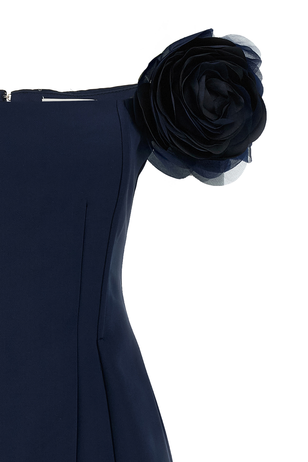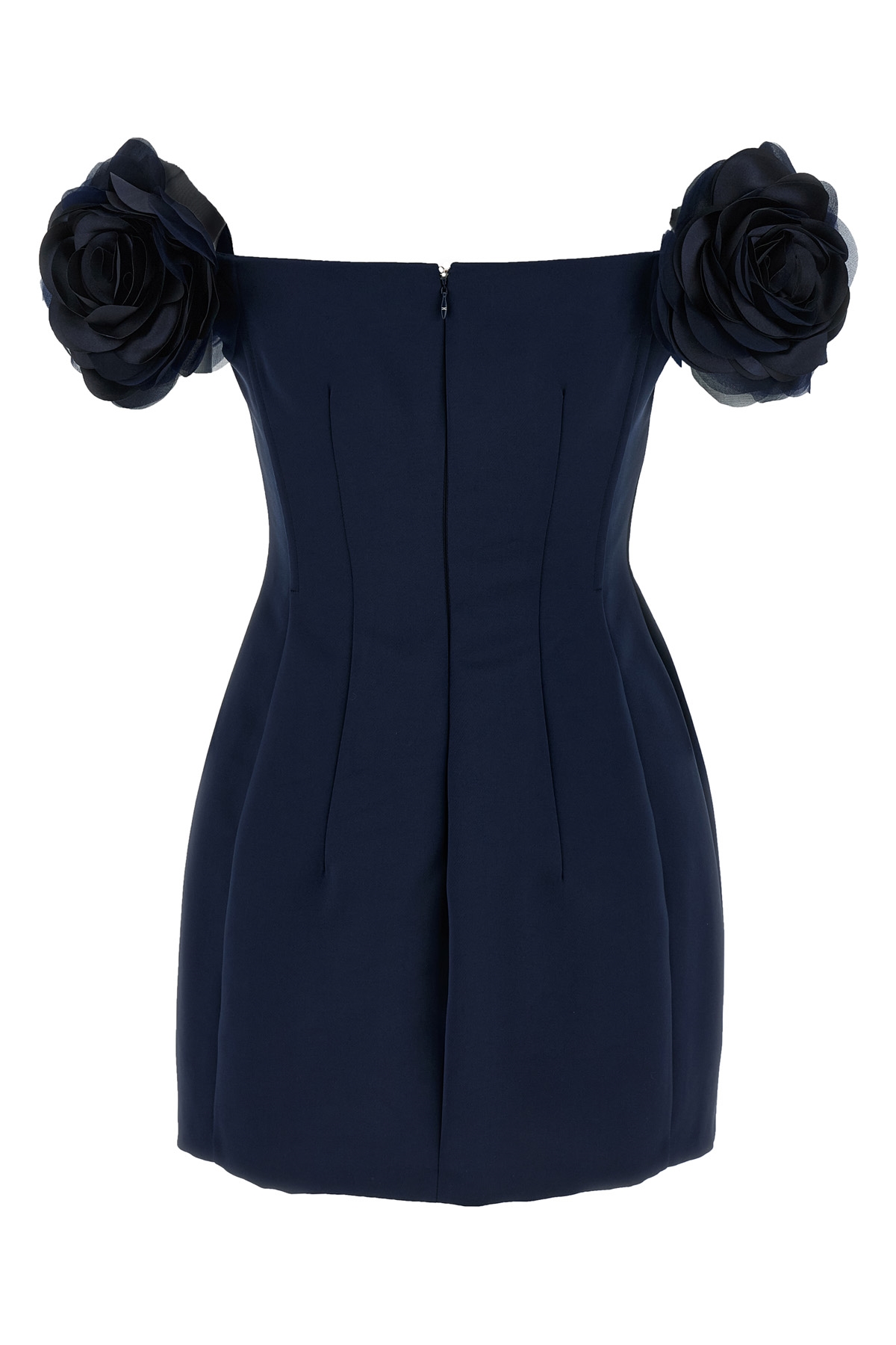 Mini dress in satin-effect fabric, Sleeveless, shoulder straps with floral appliques, square neckline, corset with slats, back zip closure, pin tucks, tone-on-tone monogram logo fabric lining.