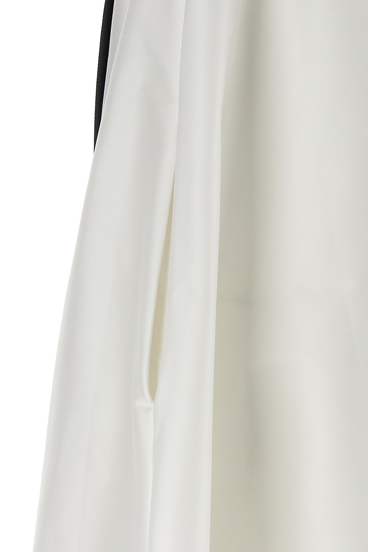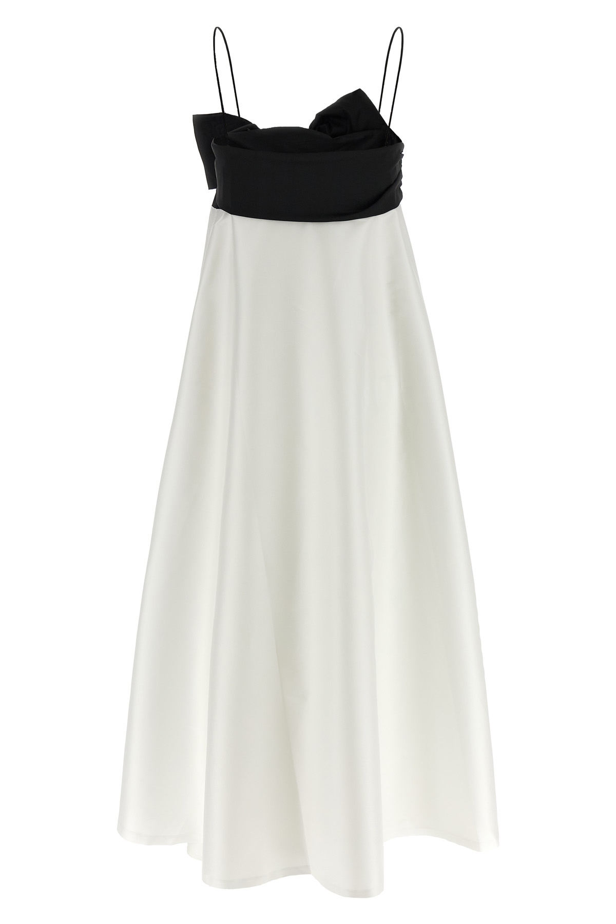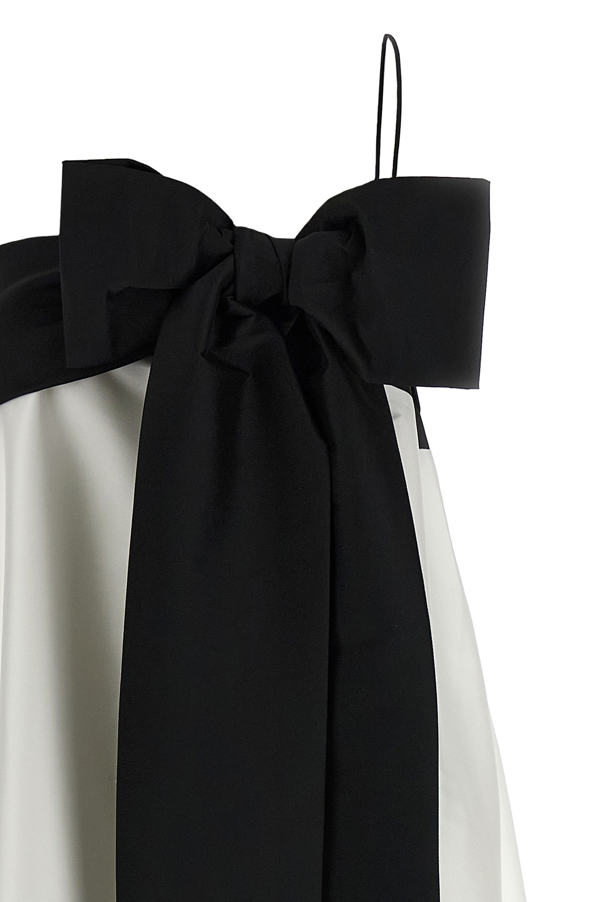 Long 'Bailey' taffeta dress with sweetheart neckline, thin straps, structured bustier top and front bow detail, pockets, side zip closure, underskirt.