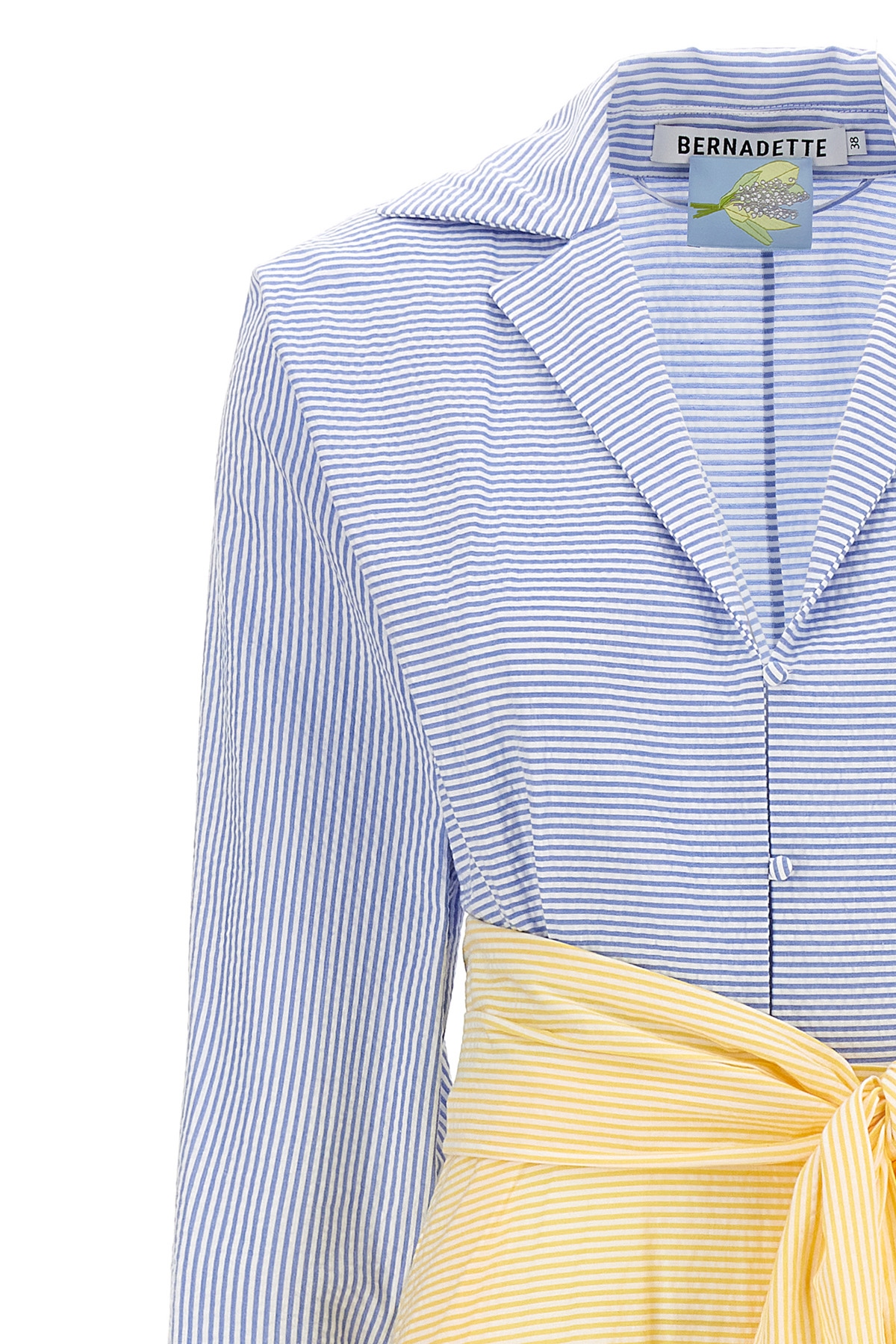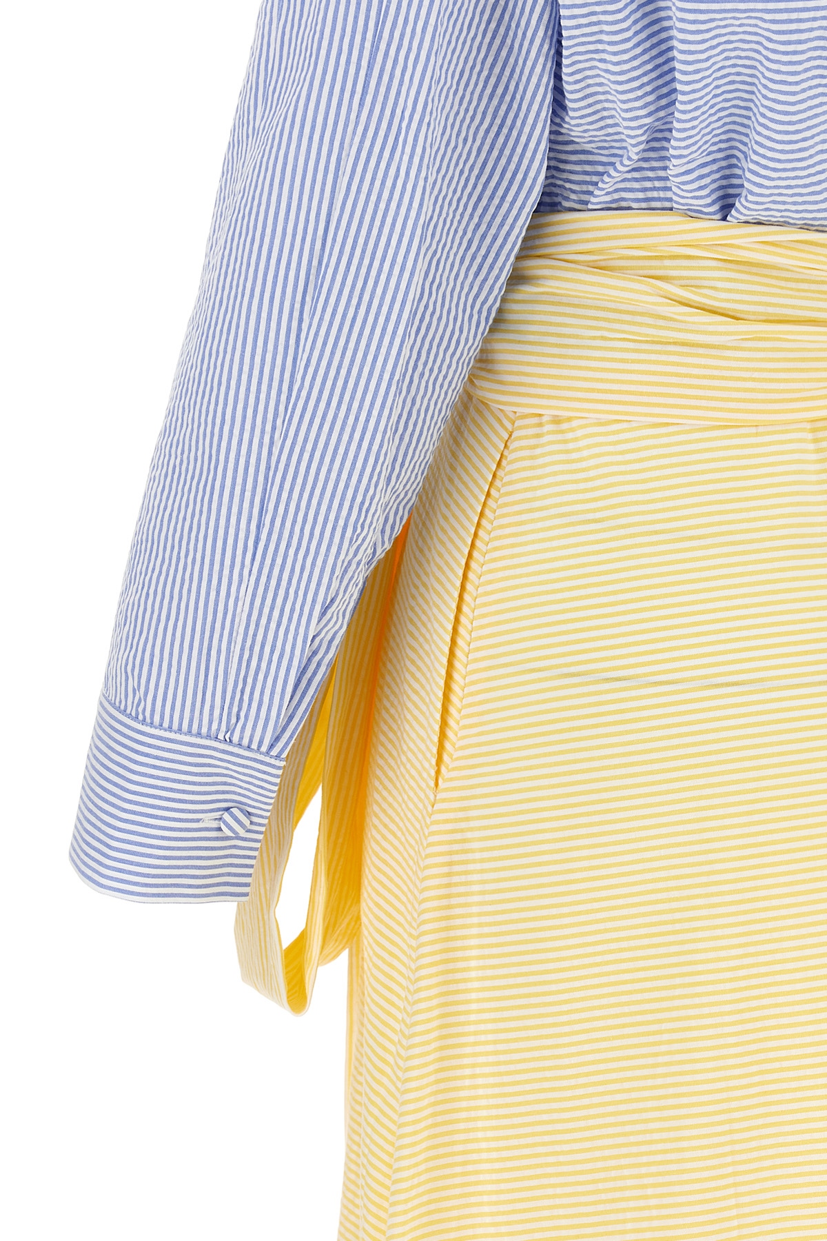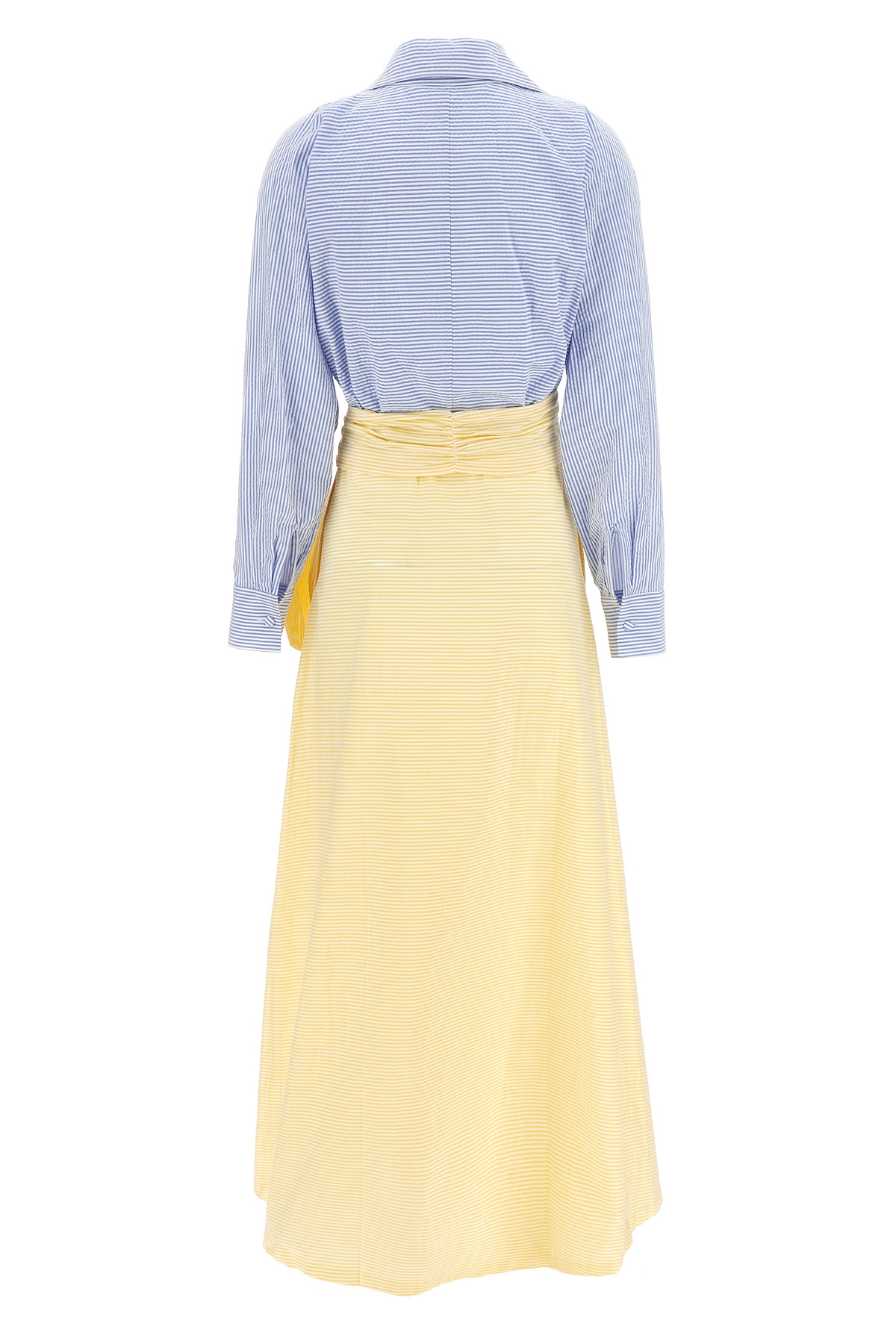 Long 'Clarence' striped seersucker cotton dress, chemisier model, V-neck with front buttoning, full skirt, side zip closure, long sleeves with cuffs, pockets, petticoat, sash tie at the removable waist.