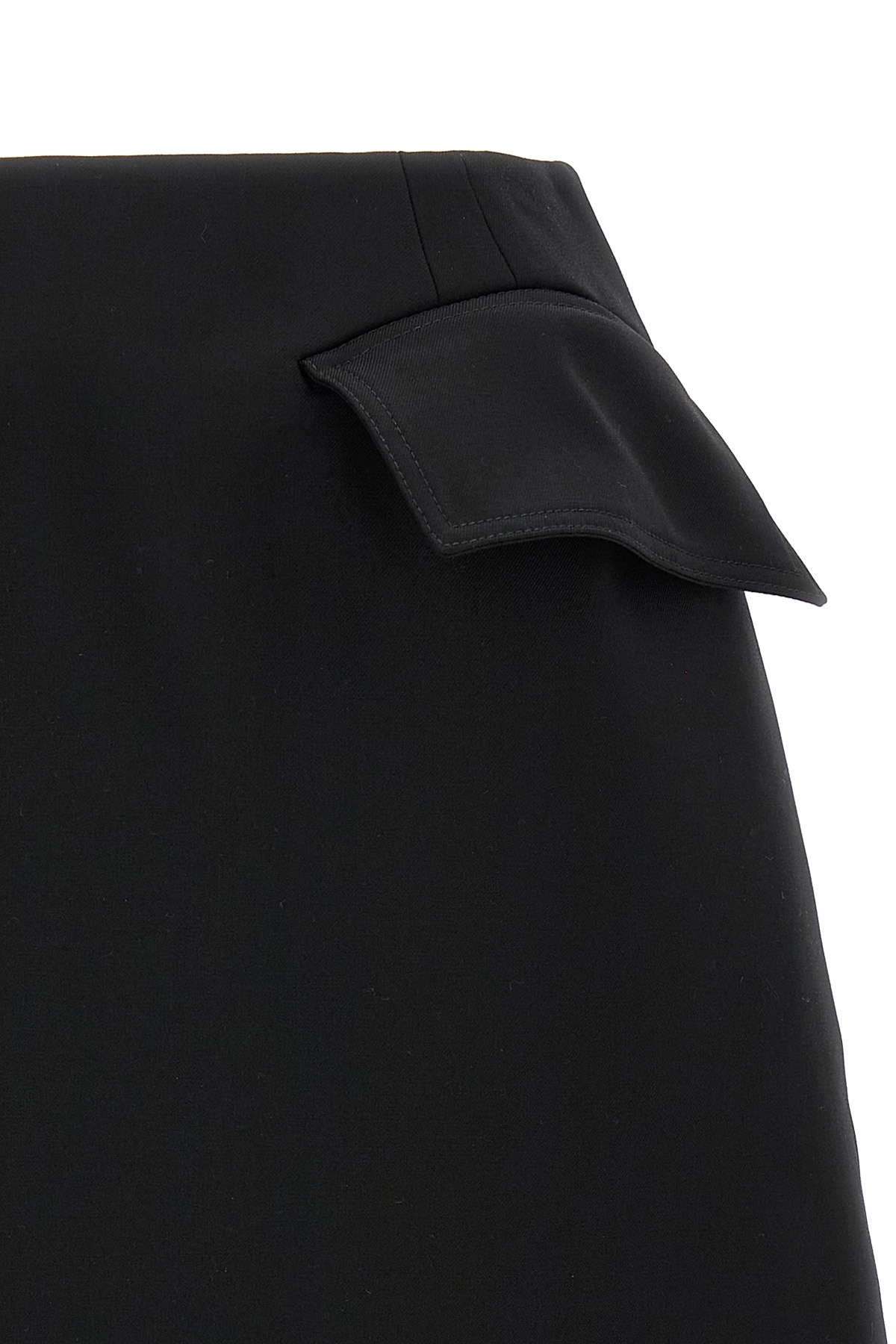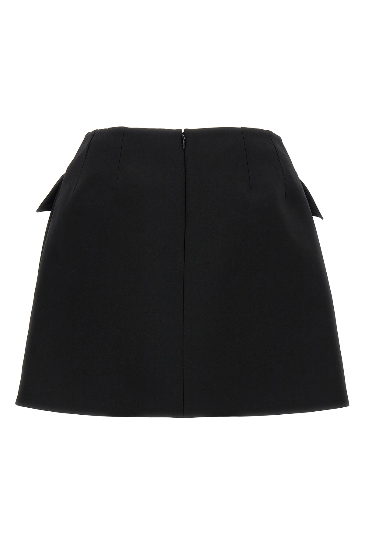Wool mini skirt, silk blend lining, front trompe l'oeil pockets, back zip closure, pockets.