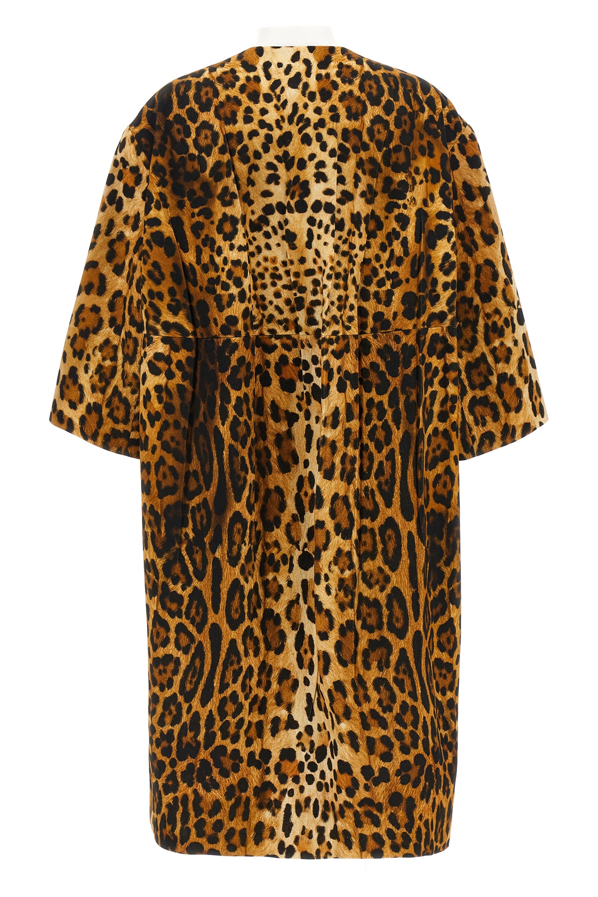Single-breasted animal print cotton drill coat with snap button closure, viscose lining, crew neck, 3/4 wide sleeves, pockets.s.