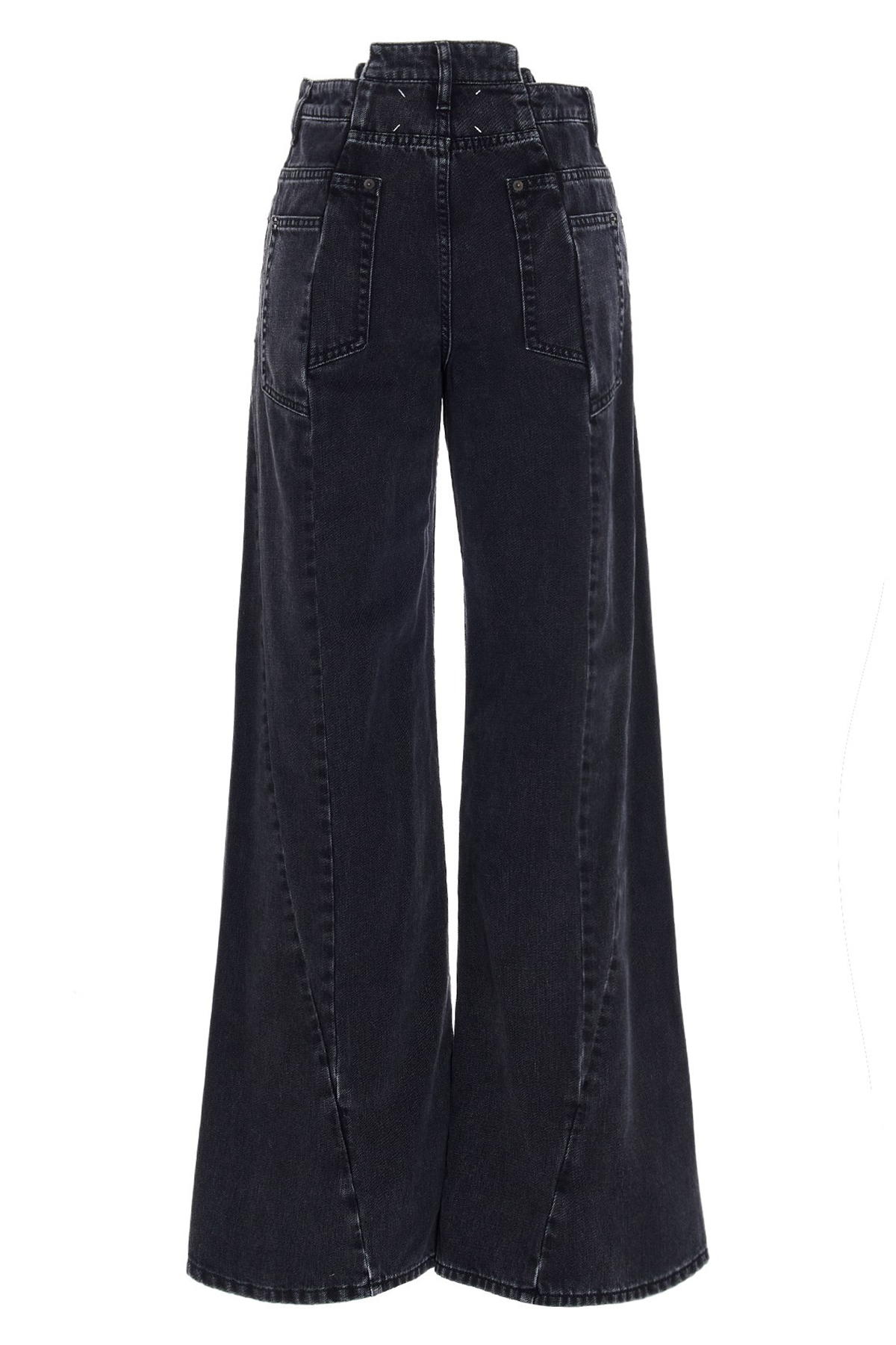 Cotton denim jeans with asymmetric waist and seams, front and back darts, wide leg, zipper and button closure, pockets.