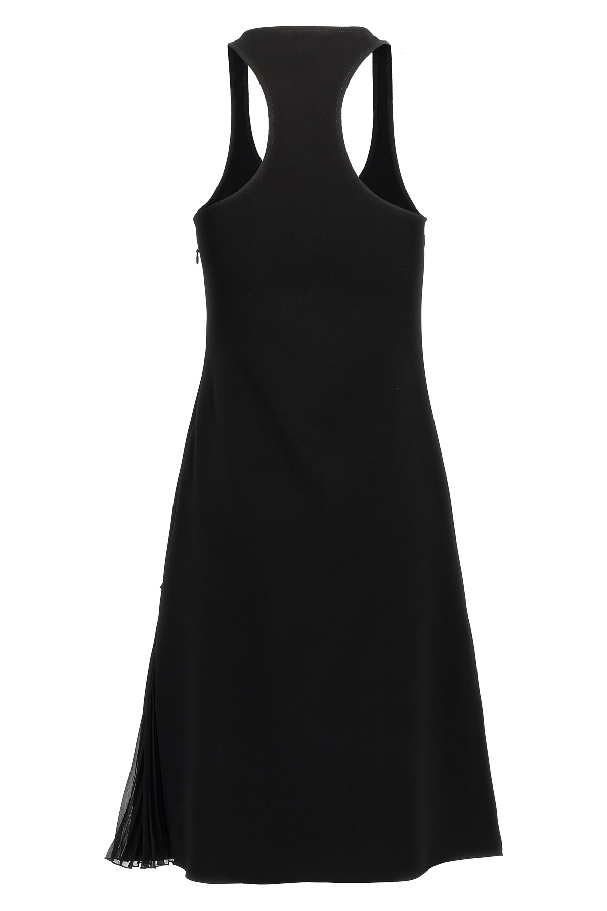 'Infinty Pleats A-Line' crepe midi dress with tone-on-tone embroidered logo on the front, A-Line shilouette, wide round neckline, sleeveless, wrap skirt with built-in briefs and side pleated ruffle inserts, side zip closure.