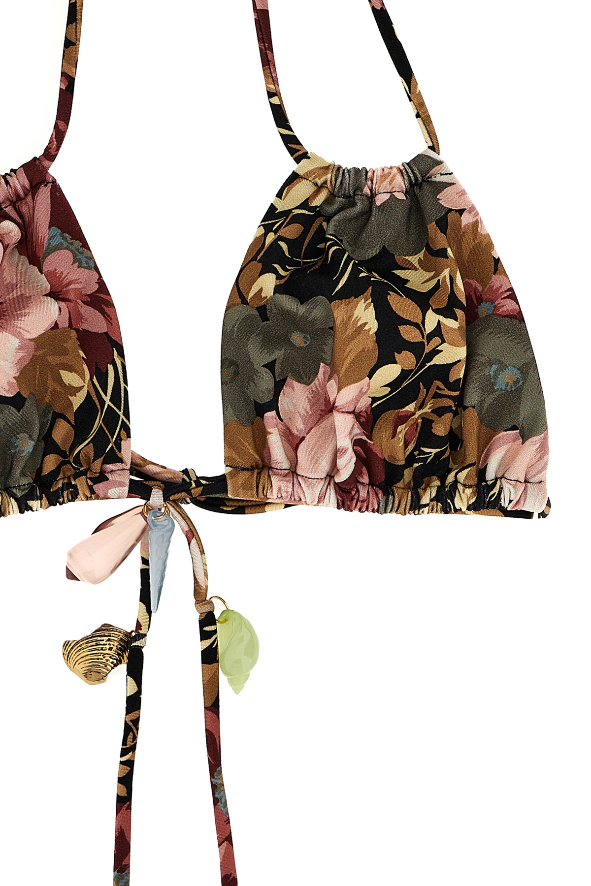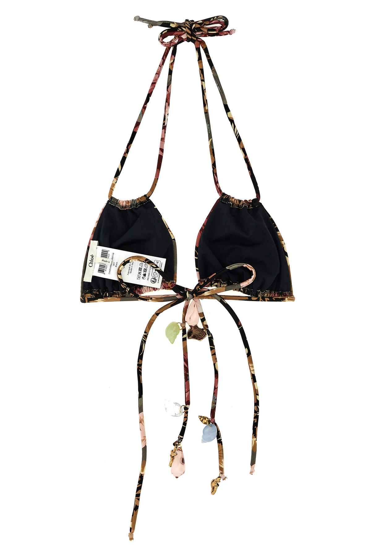 All-over rose-print polyamide blend bikini top, triangle model with drawstring and front charms, adjustable lacing closure.