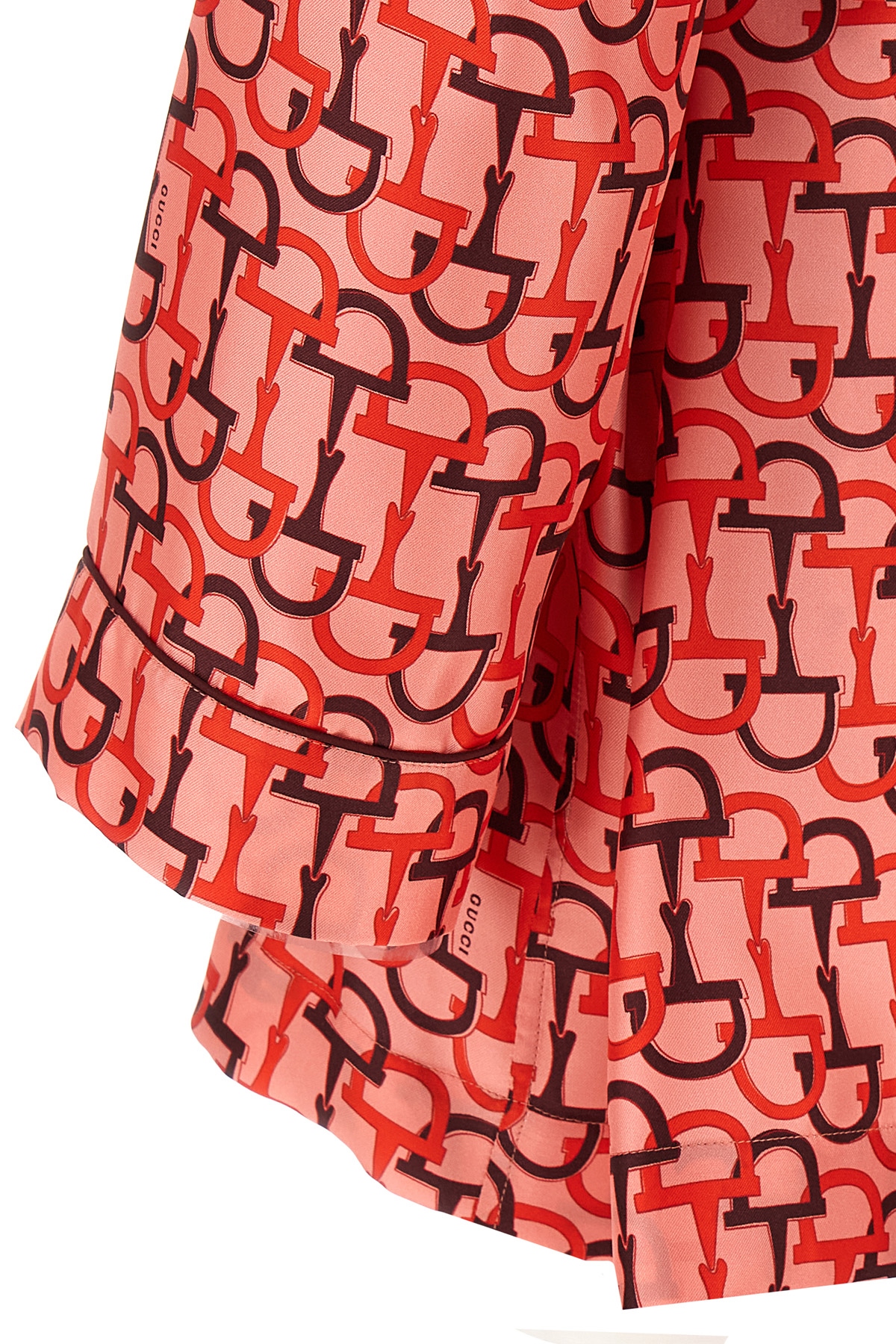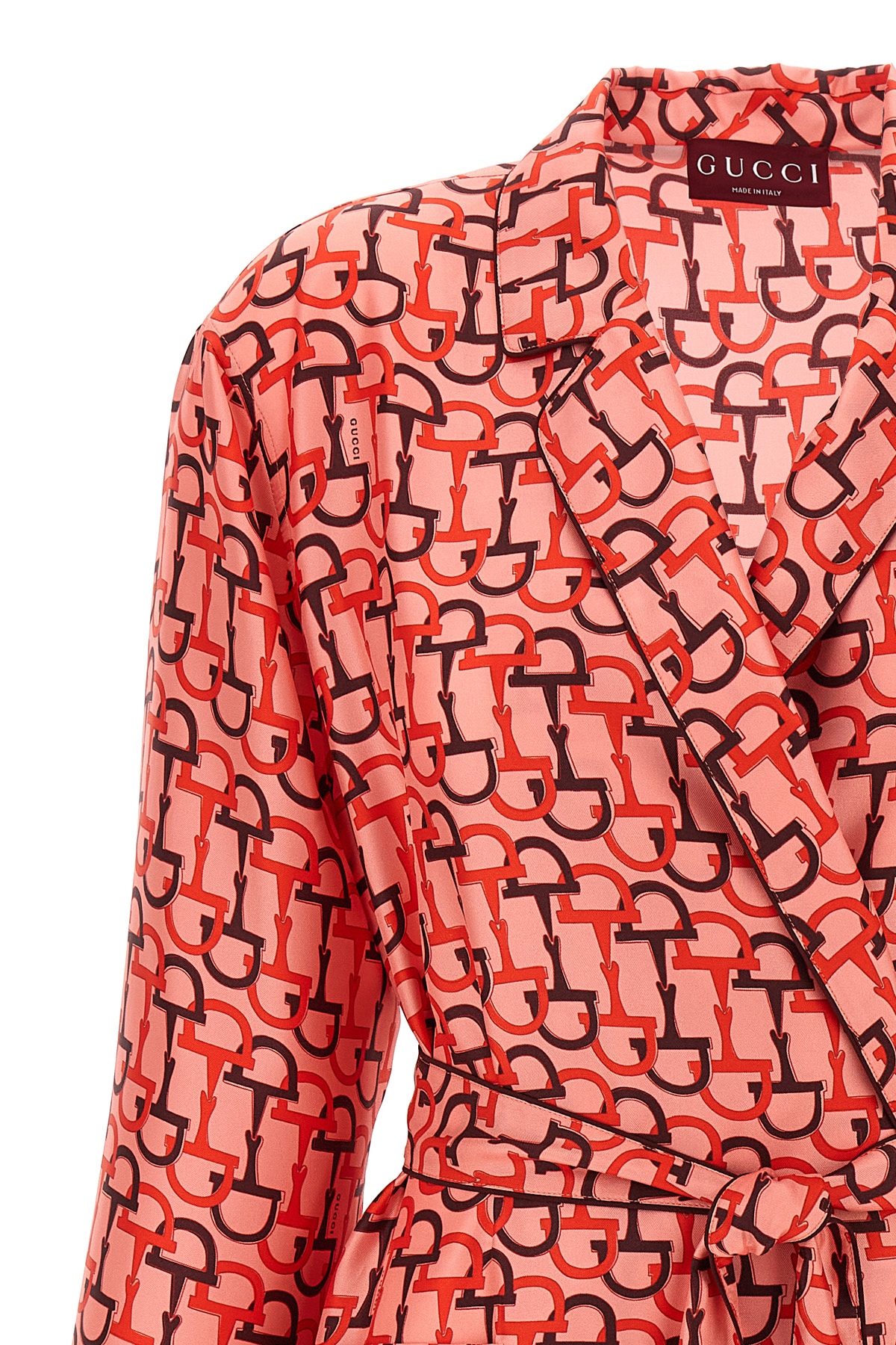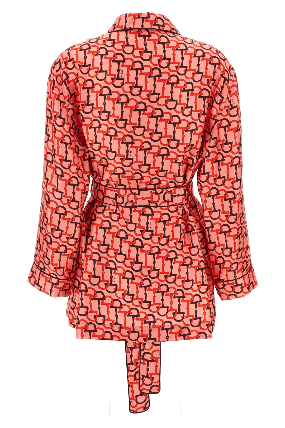 Silk twill shirt with clamp print, knotted belt at the waist, lapel neckline and double-breasted single-button closure, contrast piping, wide sleeves.