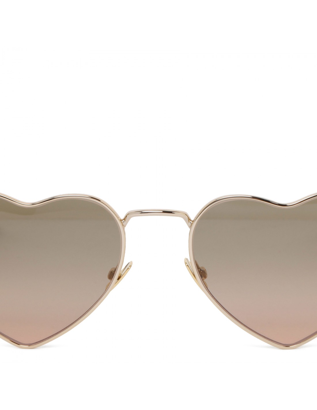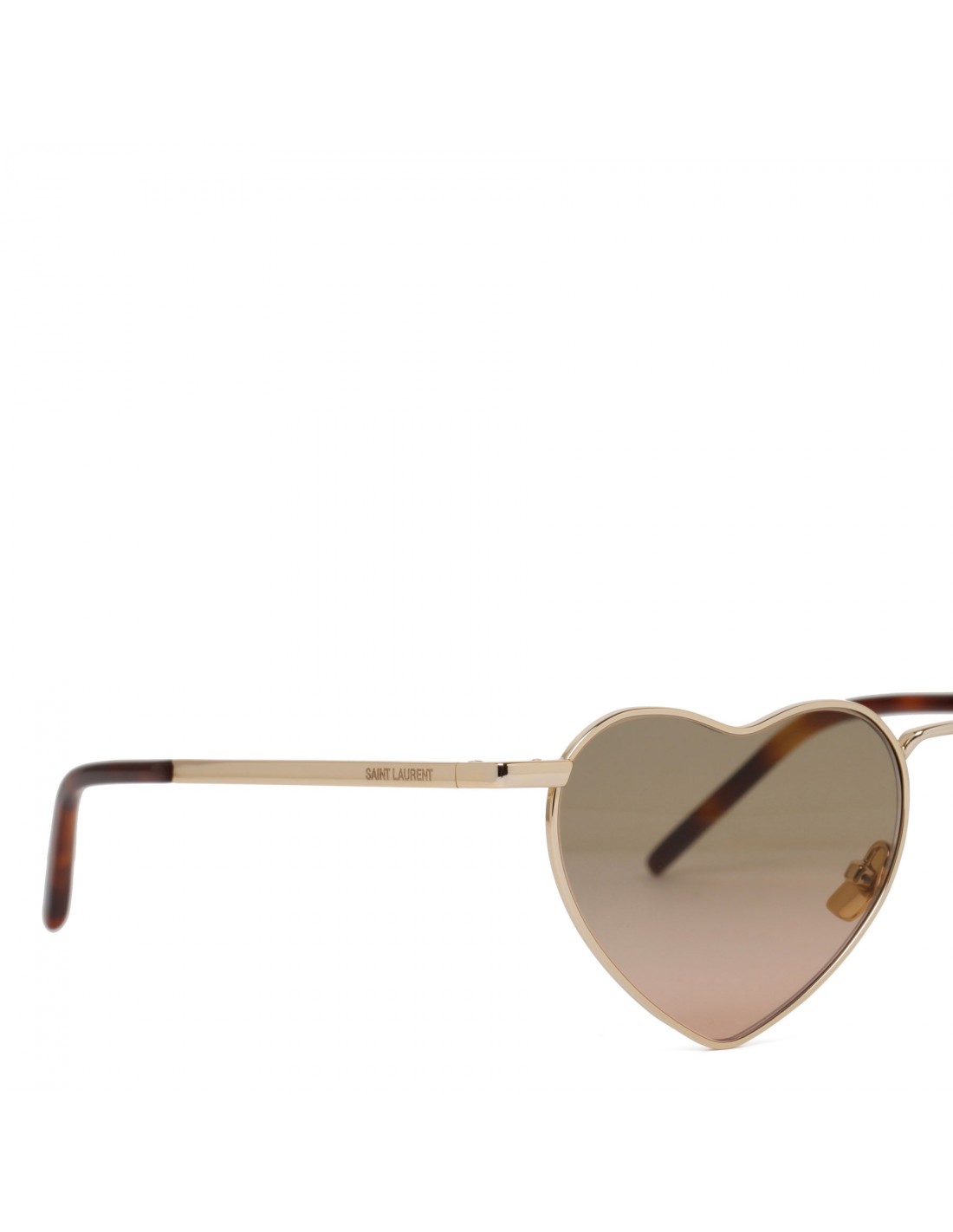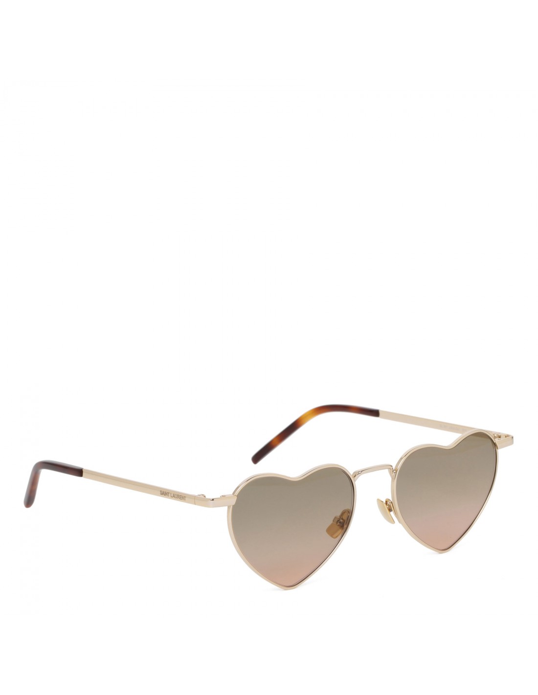 Gold-tone metal New Wave SL 301 Loulou sunglasses from Saint Laurent featuring heart-shaped frame, logo engraved temples, light gold nylon lenses with 100% UVA/UVB protection.