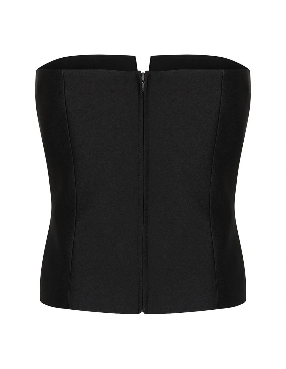 Black taffeta strapless top in black from Roland Mouret featuring V neckline with metal trim, internal corset with silk grosgrain waistband, zip fastening along back, fitted silhouette.