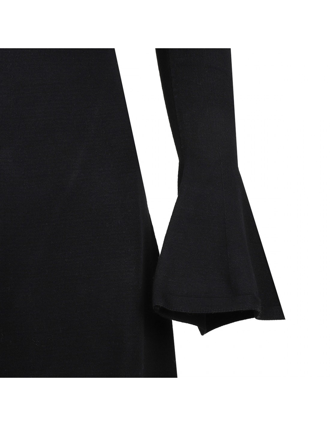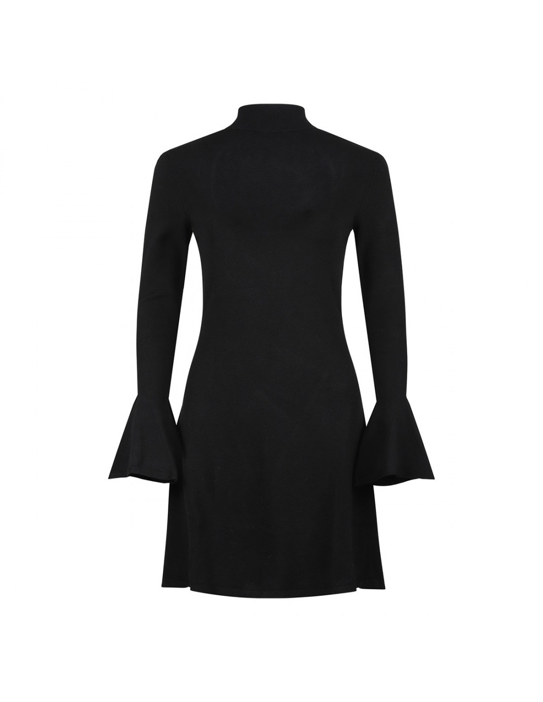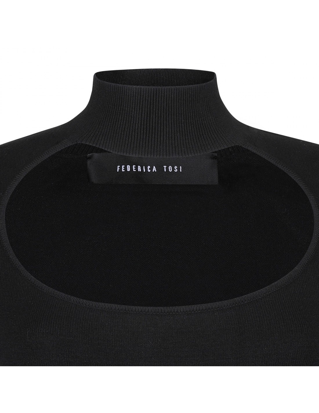 Black stretch viscose mini dress from Federica Tosi featuring cut-out detail at chest, turtle neck, long sleeves with flared cuffs, fitted bodice and flared skirt.