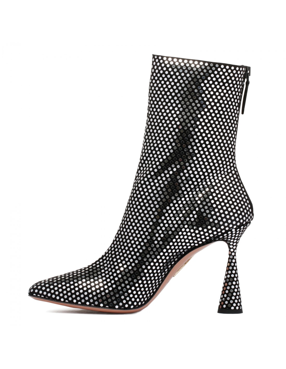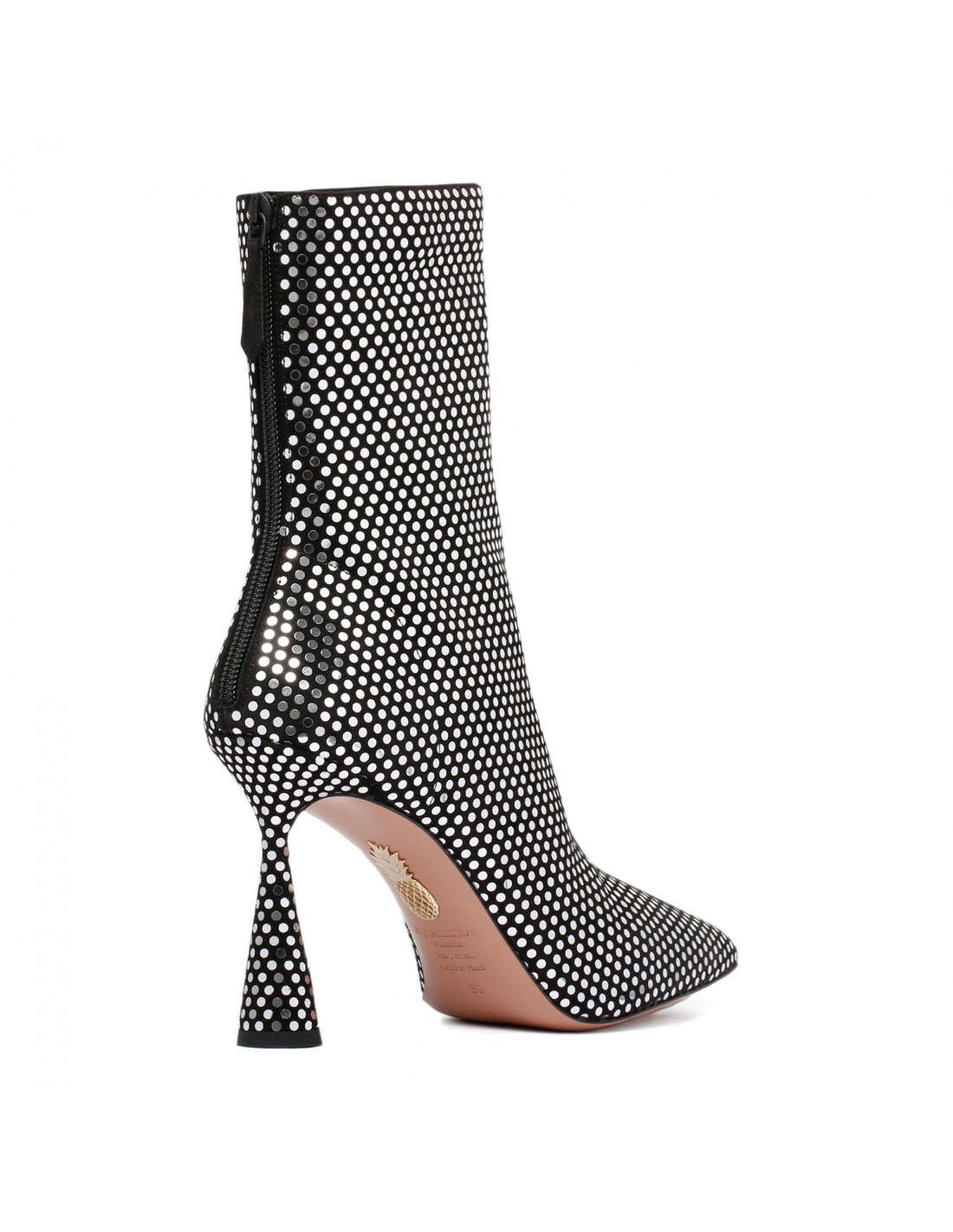 Black leather Amore booties from Aquazzura featuring silver-tone metal studs, pointed toe, zip fastening along back, 95 sculptural heel, padded leather insole, leather sole with signature logo detailing.