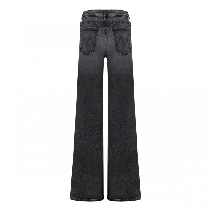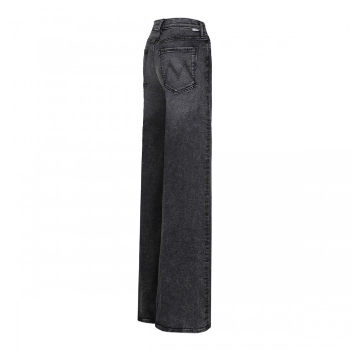Faded dark gray wash slightly stretch denim The Twister Heel jeans from Mother featuring whiskering, fading at the knee, contrasting black hardware, mid rise, flared wide leg, classic five pocket style, zip fly and button closure, belt loops on the waistband and M logo embroidery at back.