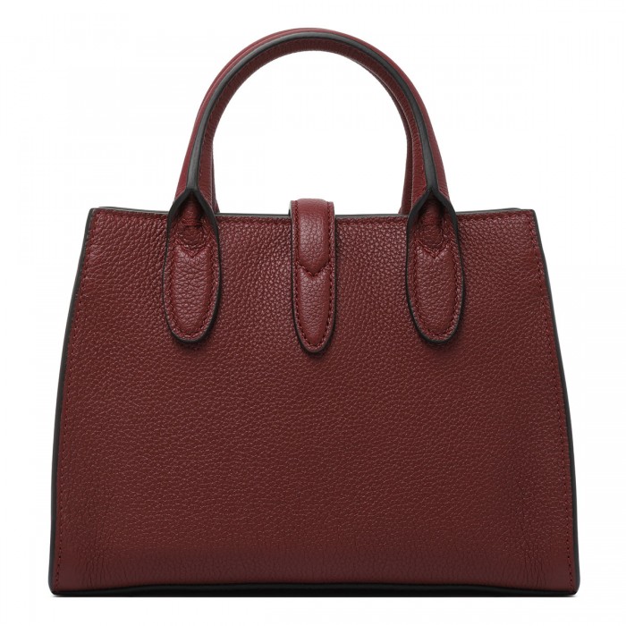Rosso Ancora red grained leather small tote bag from Gucci featuring light gold-toned hardware, detachable and adjustable shoulder strap, hook closure, double leather top handle, two internal open pockets.