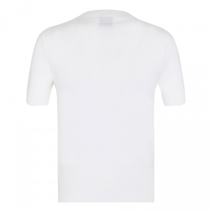 White eco-friendly cotton blend top from Patou featuring contrasting logo jacquard knit on front, short sleeves, round neck, ribbed-knit collar, cuffs and waist.