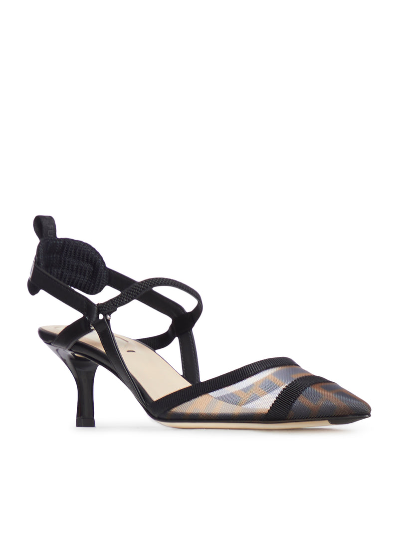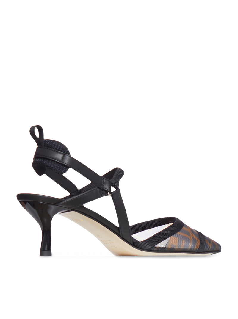 - Colibri Lite slingback with a tapered and feminine silhouette, with thin elastic straps that wrap around the foot - The sole is completed with a rubber island - Made of brown mesh with FF motif - Leather details and black ribbon profiles - The padded cushion and trekking hook add a sporty note - Black lacquered heel