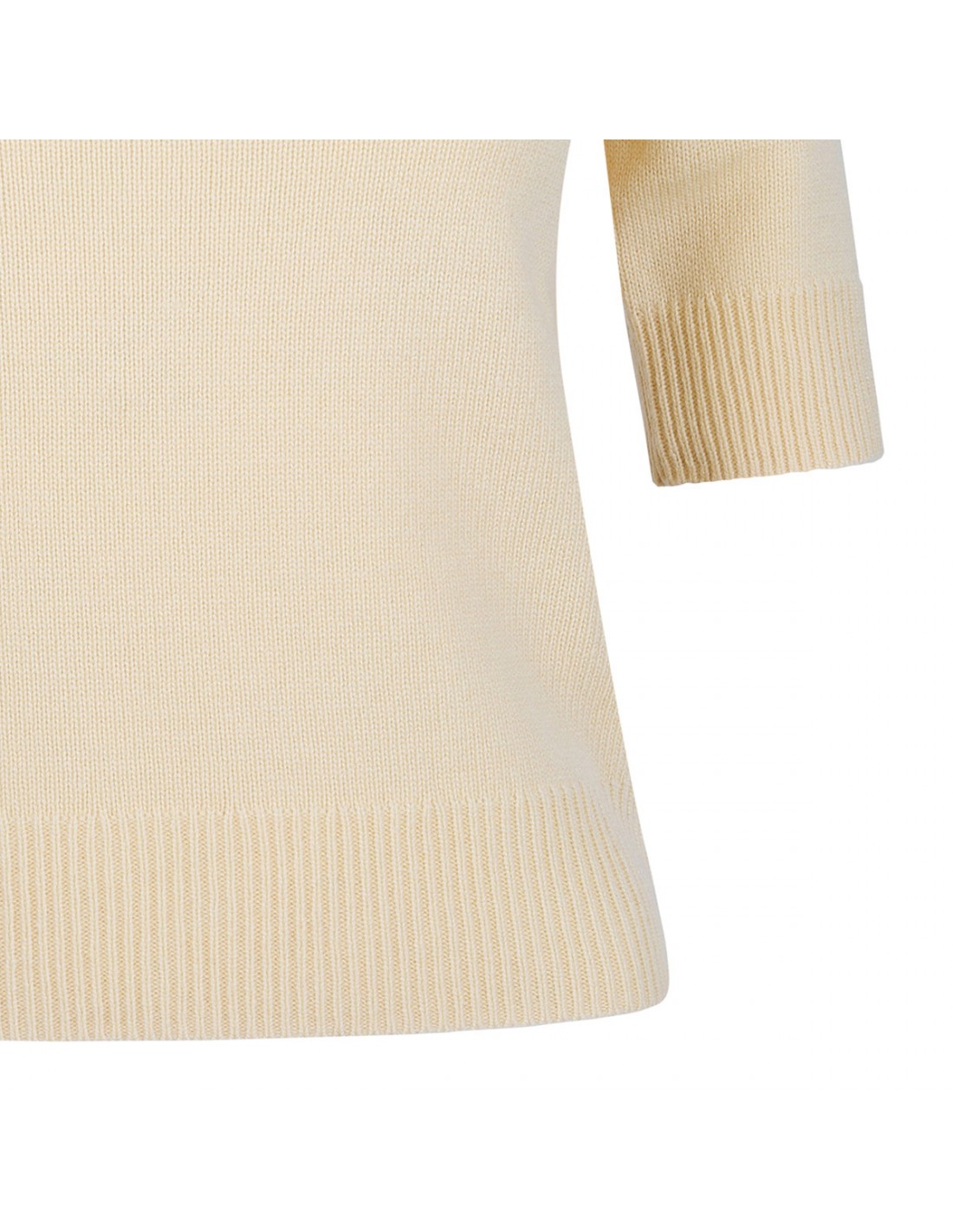 Ivory wool and cashmere sweater from Sportmax featuring contrasting graphic intarsia on chest, short sleeves, mock neck, ribbed-knit neck, cuffs and hem.