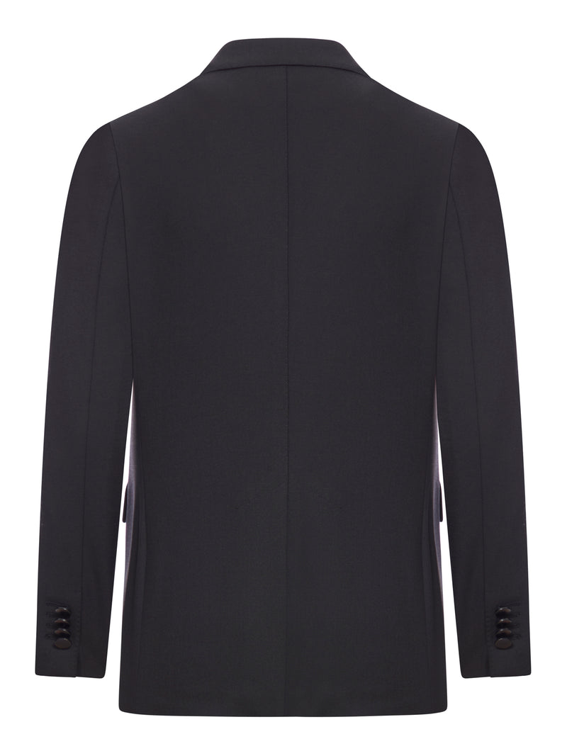 Blazer: -double-breasted button fastening -classic lapels -long sleeves -buttoned cuffs -welt chest pocket -pleated details -two front flap pockets -back slit Trousers: -concealed front hook and zip fastening -mid-rise -ironed pleat -two side welt pockets -pleated details -two back welt pockets -straight leg -black
