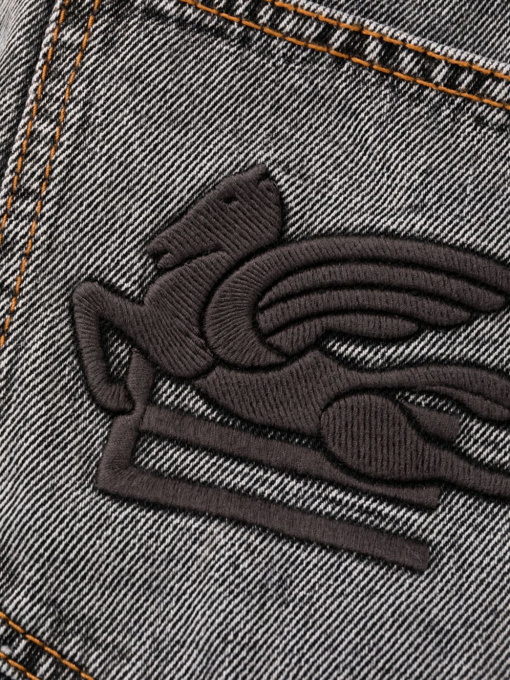 flared wide-leg jeans from ETRO featuring charcoal grey, cotton, denim, embroidered logo to the rear, mid-rise, front button and zip fastening, belt loops, two side slit pockets, two rear patch pockets, wide leg, flared, extra-long length and straight hem.