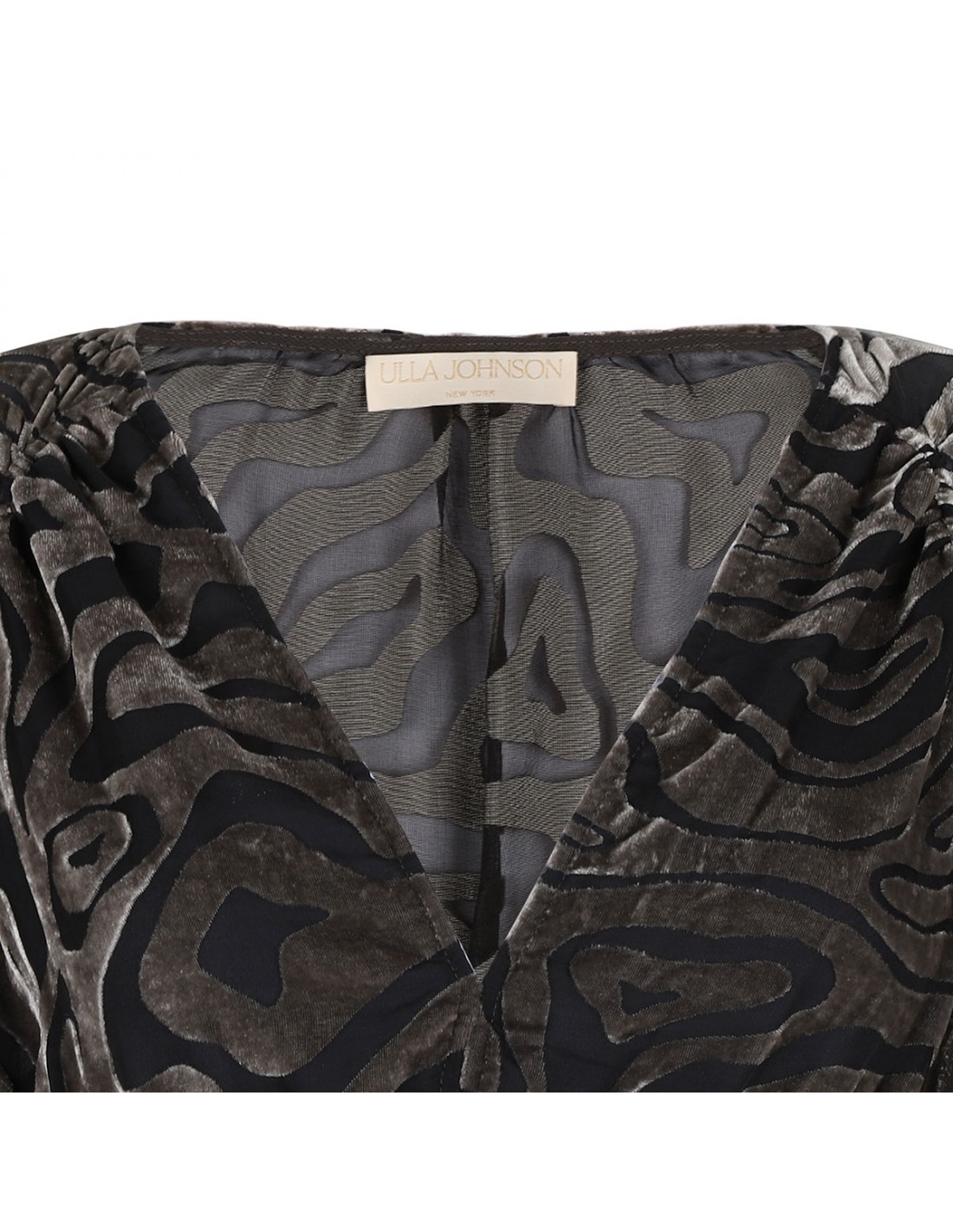The Elora Dress is an intricately detailed lovely made from Ulla Johnson featuring botanical motif at center, animal-like patterns, V-neck, voluminous long sleeves, elastic waist, midi-length, zip fastening along back.