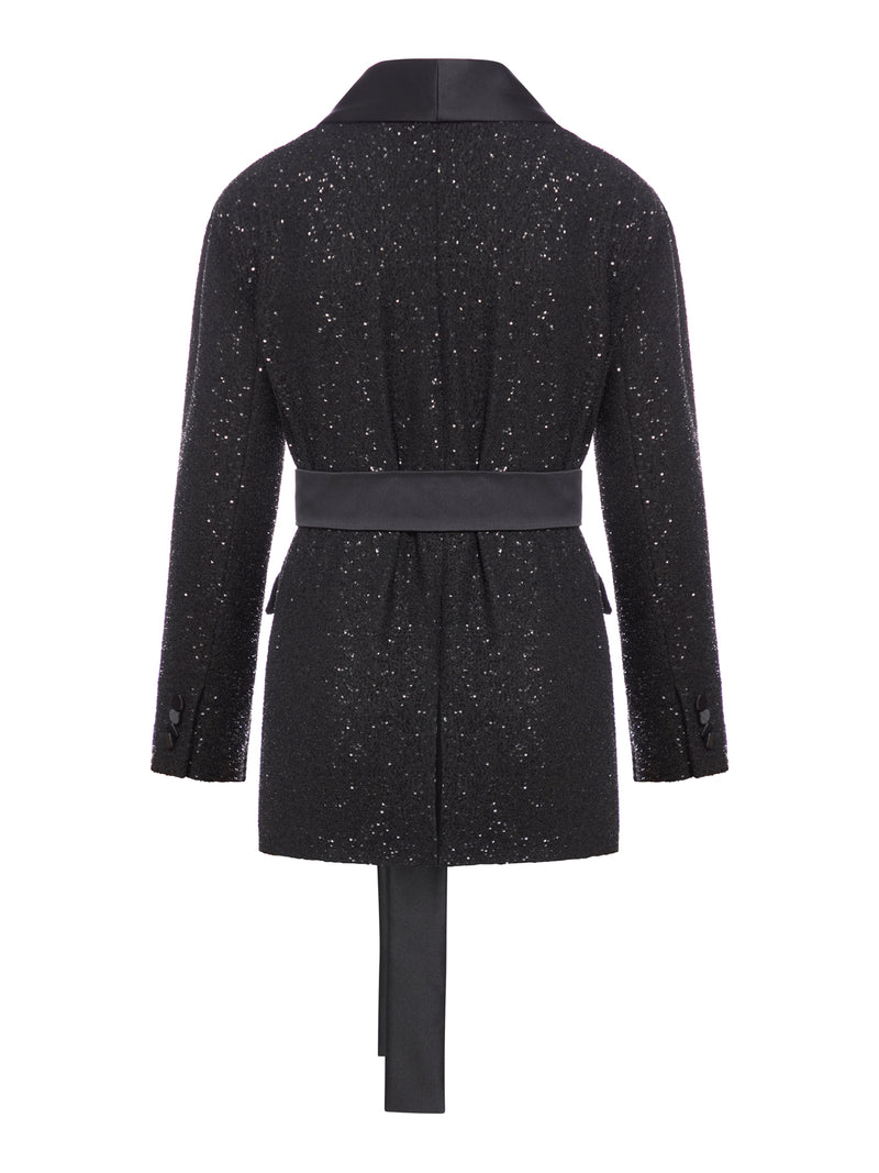 -Deconstructed jacket with a slightly oversized fit -Made of wool blend fabric worked with tone-on-tone micro-sequins -Tuxedo-inspired model with satin details and a teardrop cut-out detail on the back -Shawl collar -Pocket and pockets with applied flap -Lined in silk georgette, it is finished with low set-in sleeves -Covered buttons on the cuffs -Central slit on the back -Robe fastening with matching belt