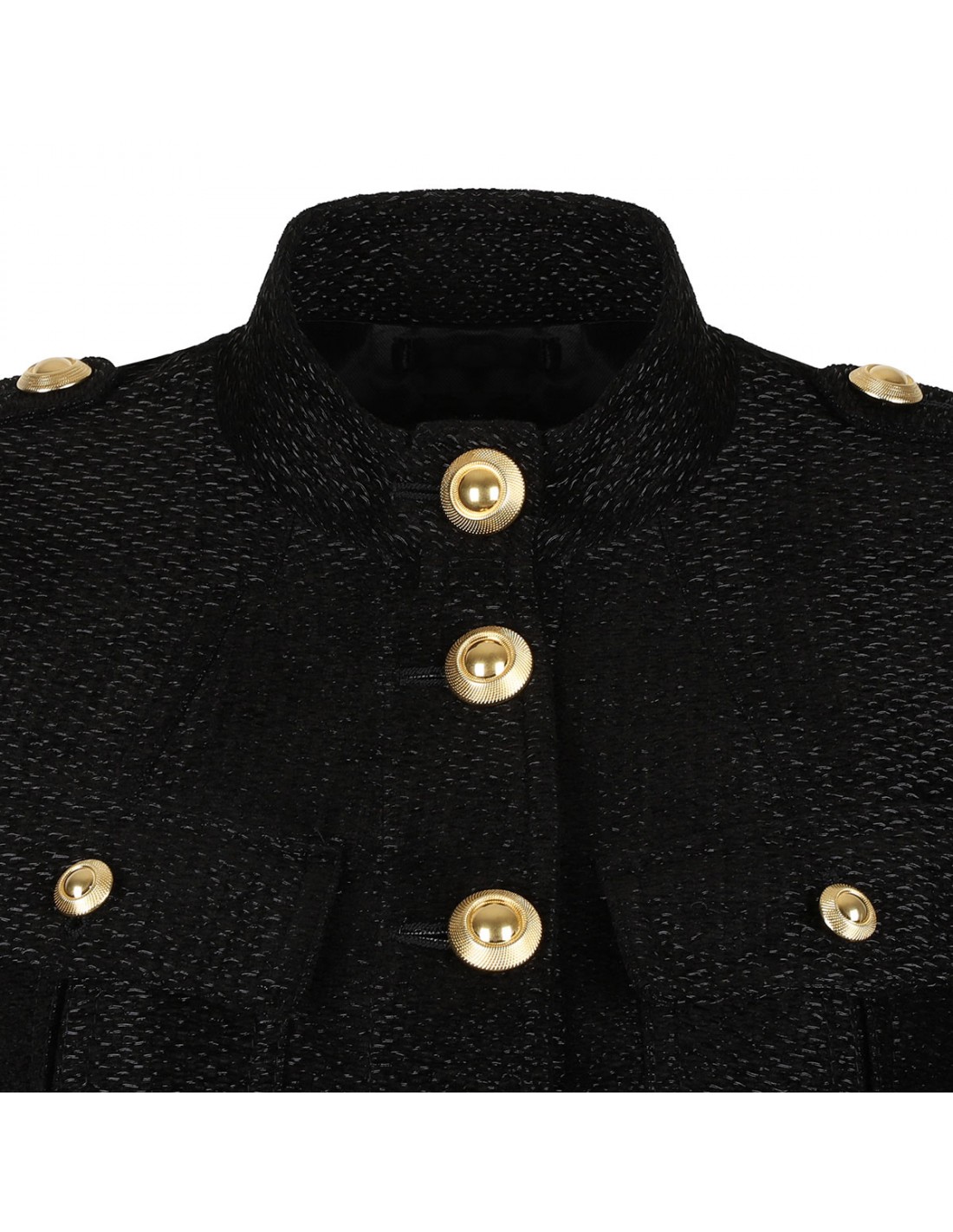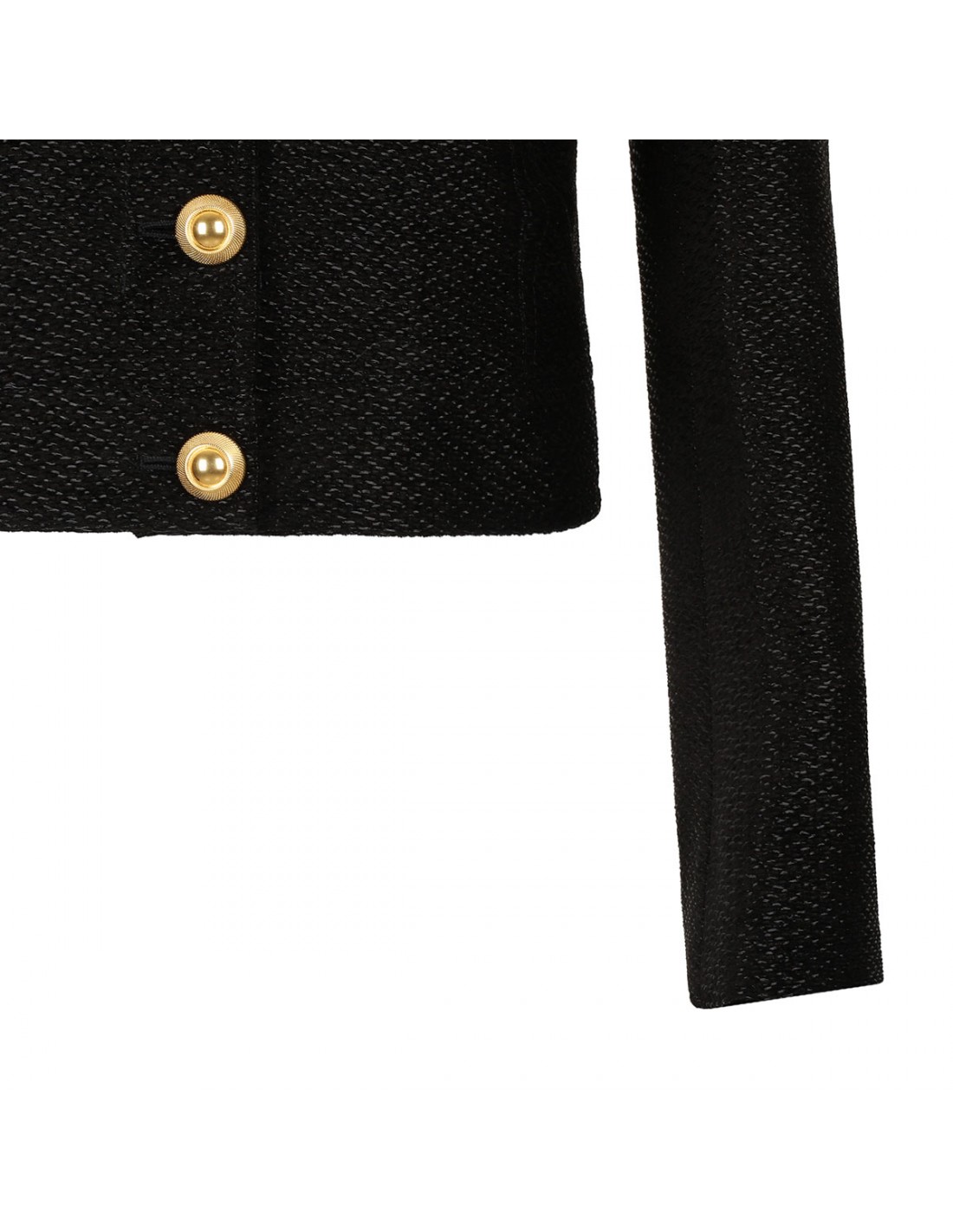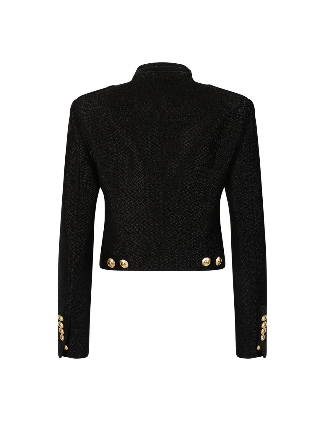 Black metallic silk blend boucle peacoat jacket from Tom Ford featuring cropped silhouette, double breasted silhouette, under collar leather belts detail, button closure, buttoned cuffs, shoulder epaulettes, buttoned flap pockets at chest.
