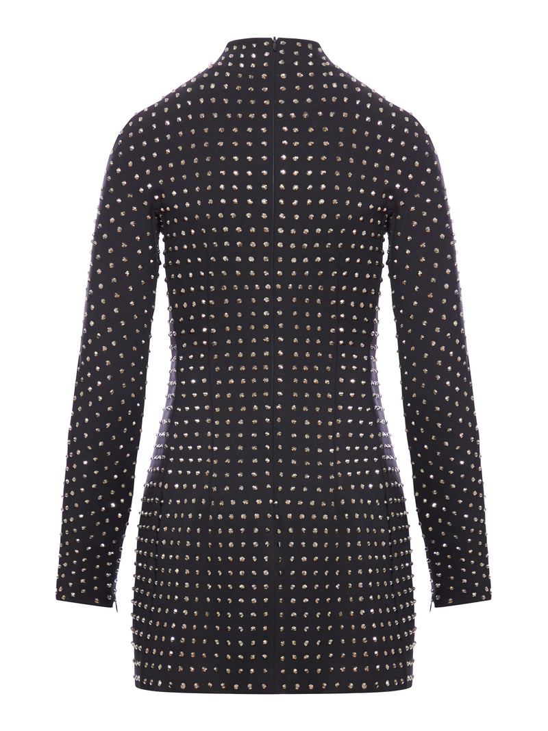 -Short dress made of scuba jersey covered with faceted rhinestones in a geometric texture -Kimono construction -Raised collar -Snug fit at the waist -Internally lined -Hidden zip on the back -Zip at the cuffs